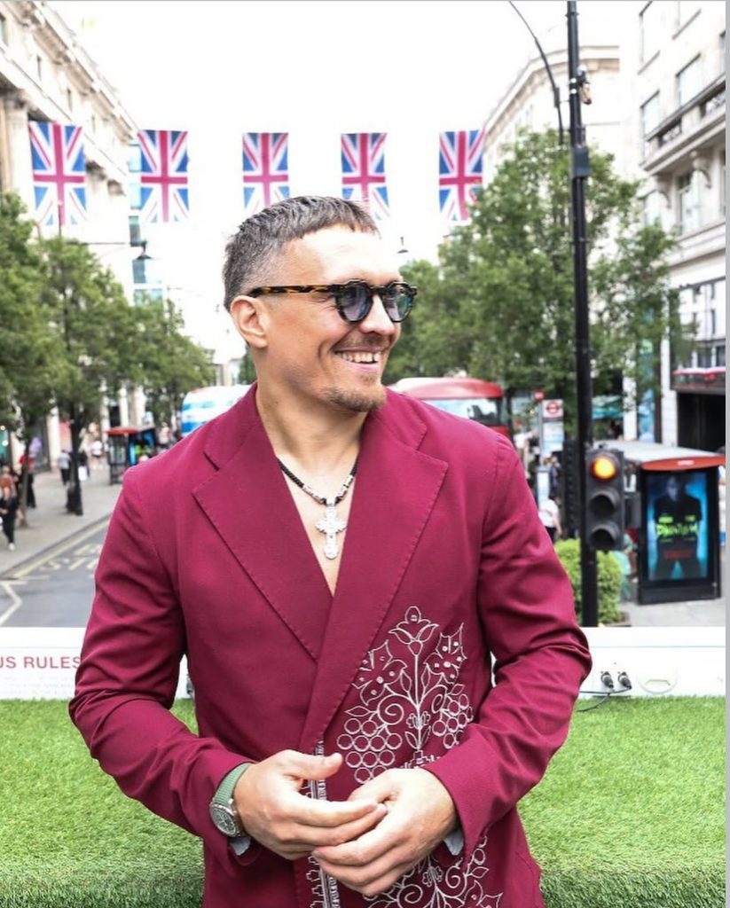 14 липня 2025 року, у Лондоні, під час презентації відновленої мозаїки Алли Горської “Боривітер”, Олександр Усик з’явився у бордовому костюмі з авторською вишивкою від українського бренду Damirli.