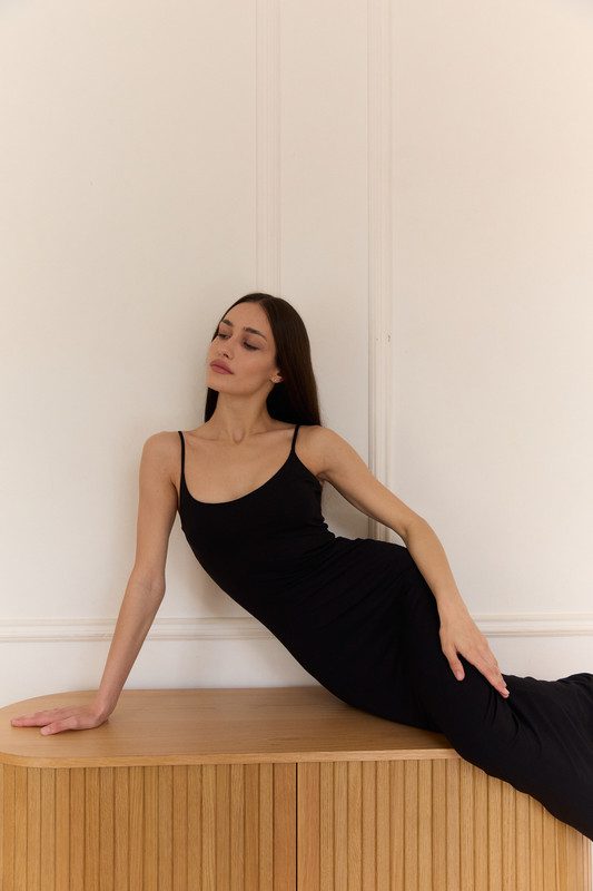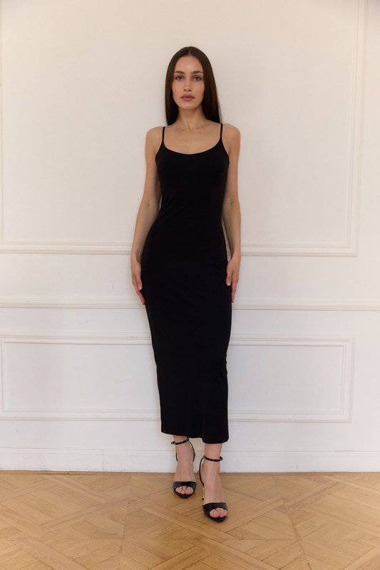 Силуетна сукня на тонких бретелях з подвійною тканиною в зоні грудей. На тілі виглядає як друга шкіра. Тканина не просвічує.