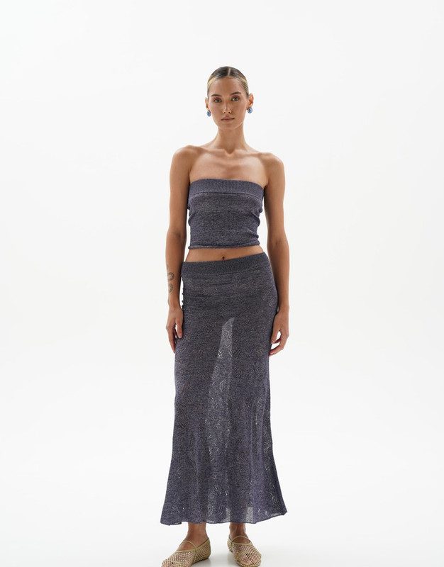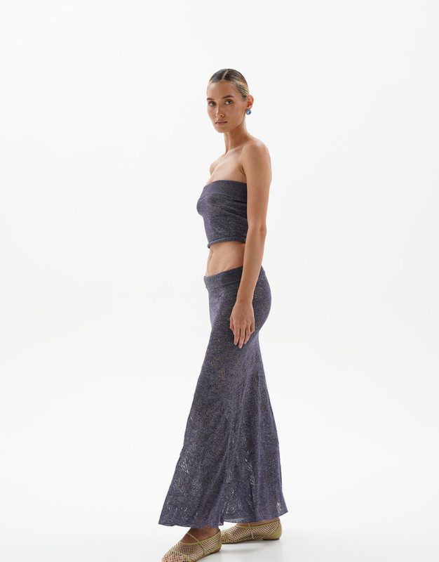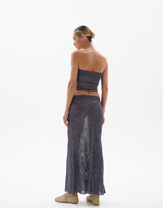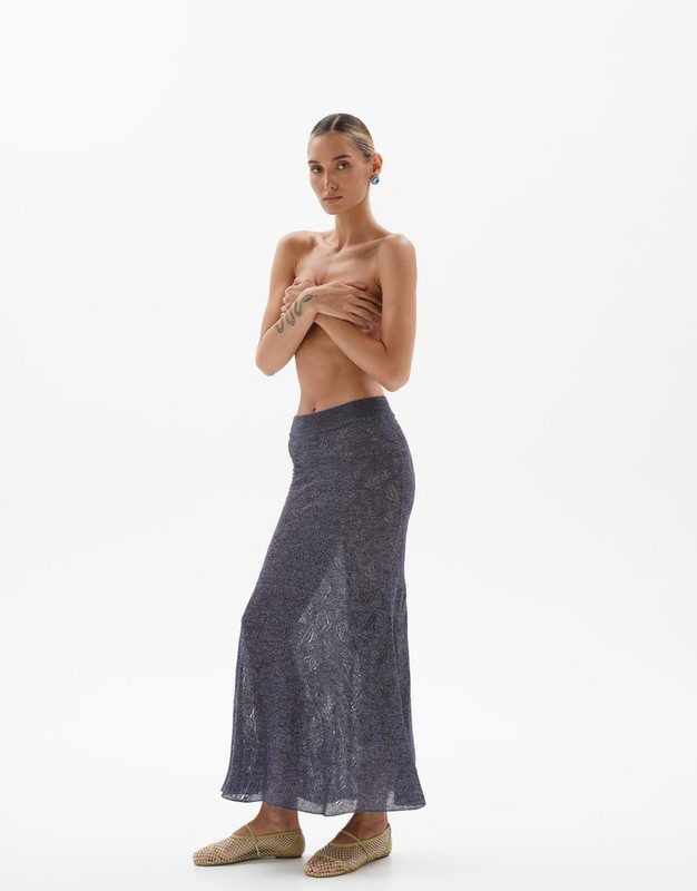 Вишукана ажурна спідниця довжини максі, що спадає мʼякими хвилями. Ледь відчутна на тілі. Виконана з матеріалу з високою еластичністю, завдяки якій розмір S підходить на параметри від XS до повномірної S, розмір М – від S до повномірної М.
