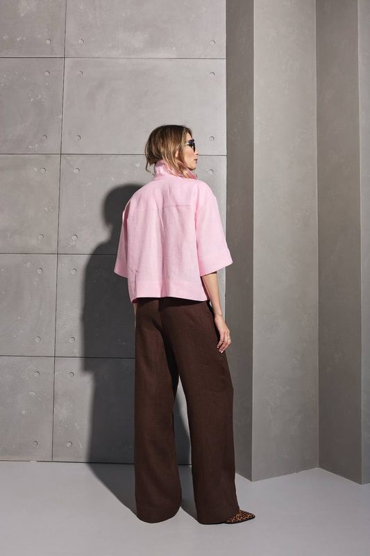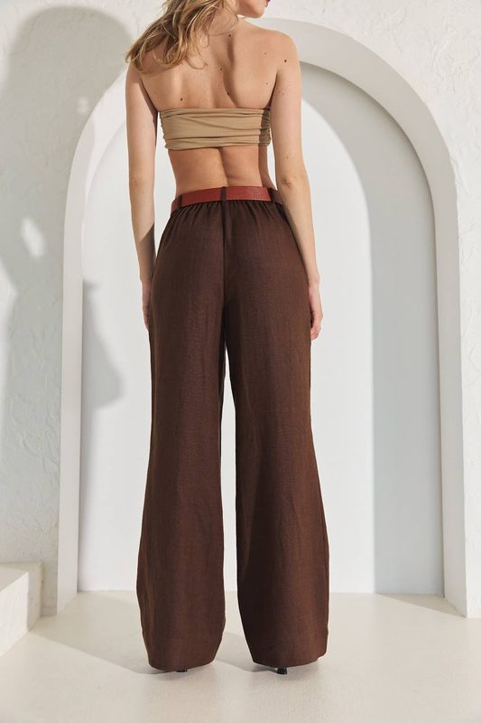 Брюки на застібкі з блискавкою, боковими кишенями та позаду у поясі гумка. Кольор корічневий.