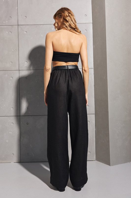 Брюки на застібкі з блискавкою, боковими кишенями та позаду у поясі гумка. Кольор чорний.