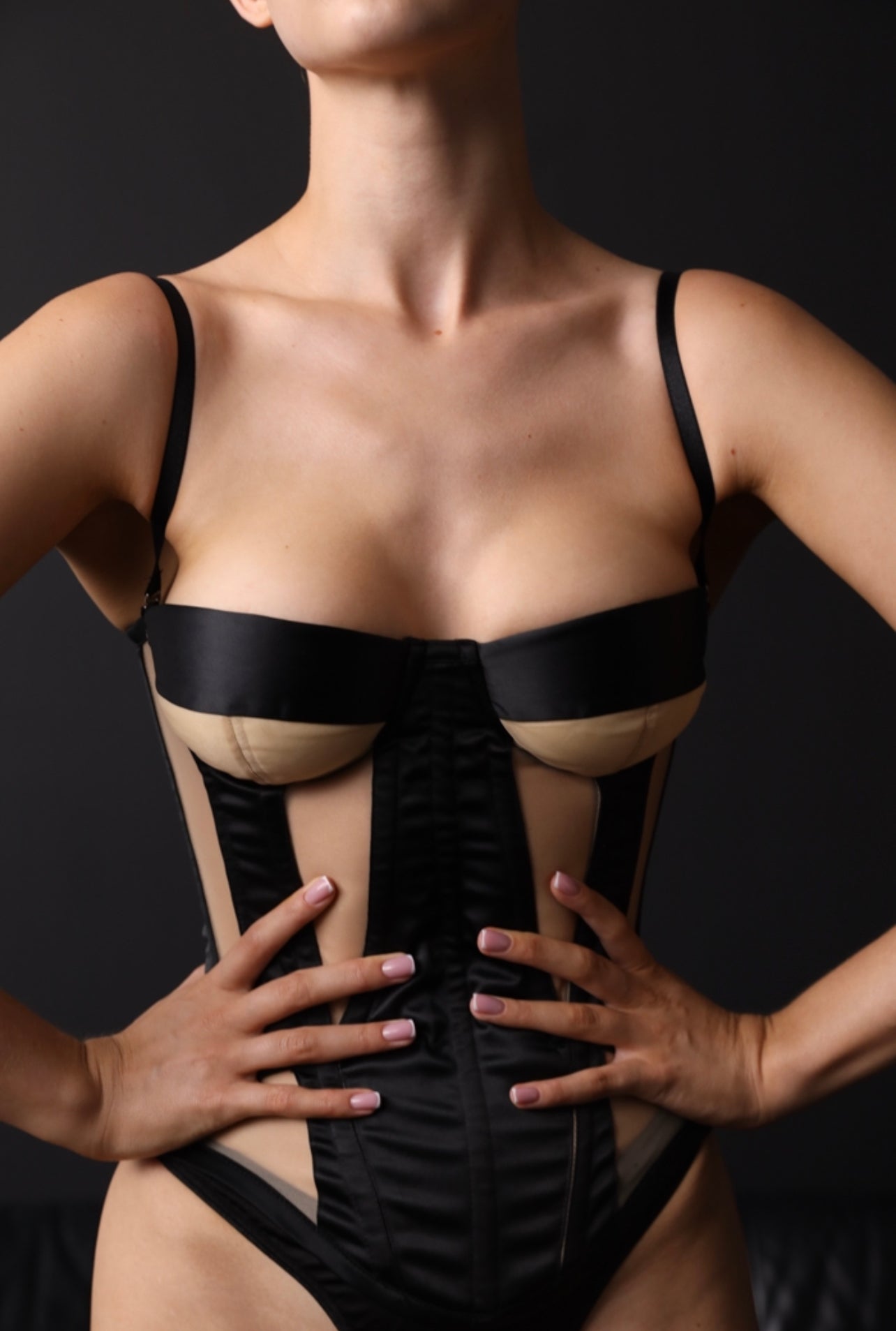 Корсет з чорного сатина з нюдовими вставками і трусики, що входять в комплект – це стильний і елегантний одяг, який надає фігурі жінки чудову форму. Виготовлений з високоякісного сатину, корсет має чорний колір, що надає йому загадковості і чарівності. Нюдові вставки додають додаткової привабливості, виглядають ніжно і елегантно. Корсет можна носити окремо або поєднувати з іншими елементами одягу, створюючи стильний образ для особливих випадків або вечірок.