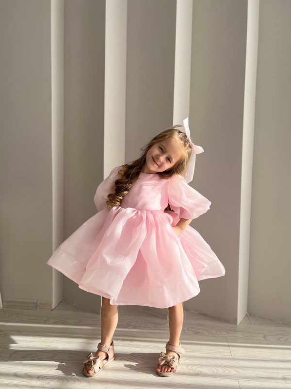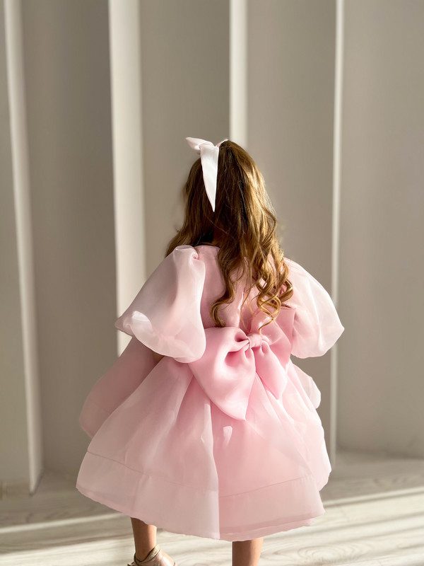 з рукавами-ліхтариками та пишною спідничкою. Ззаду сукні бантик та прихований замочок.