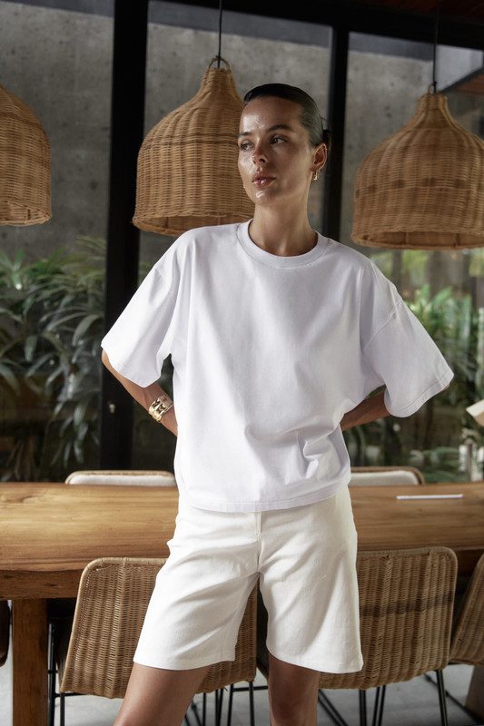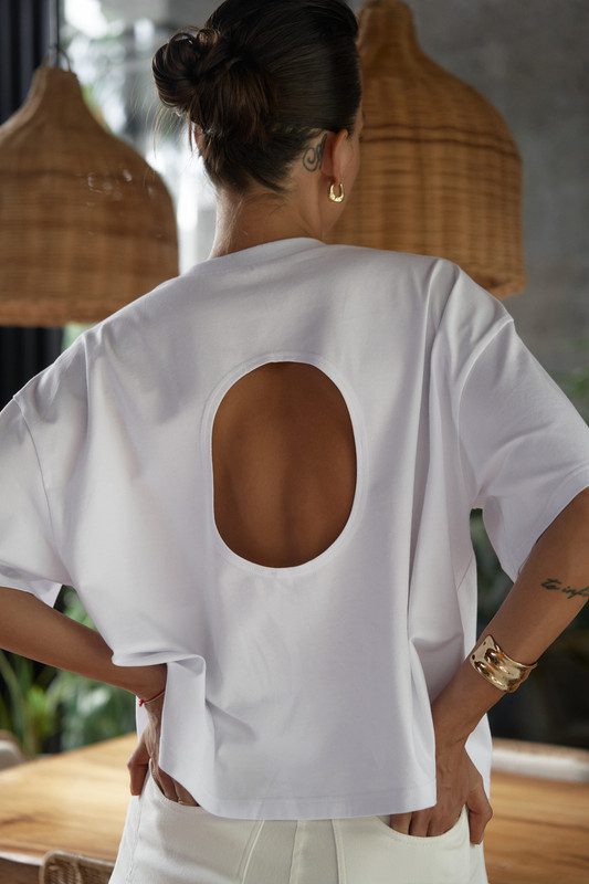 Базова футболка з характером. “O-back” поєднує комфорт вільного крою з яскравим акцентом — круглим вирізом на спині, що додає несподіваного шарму повсякденному образу.