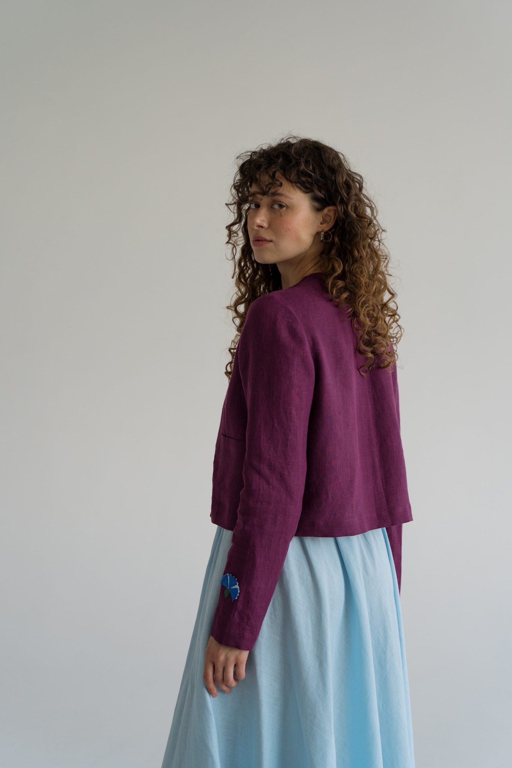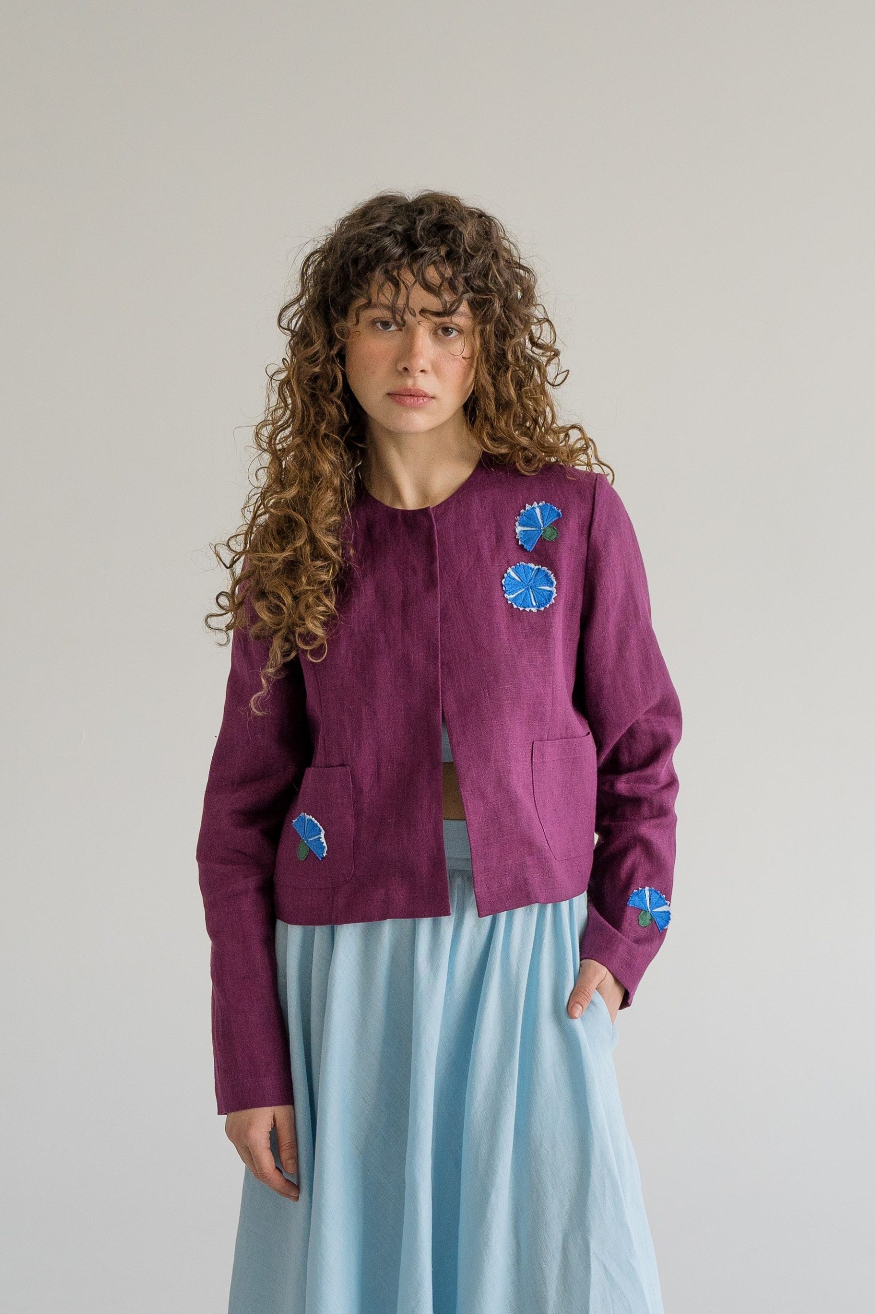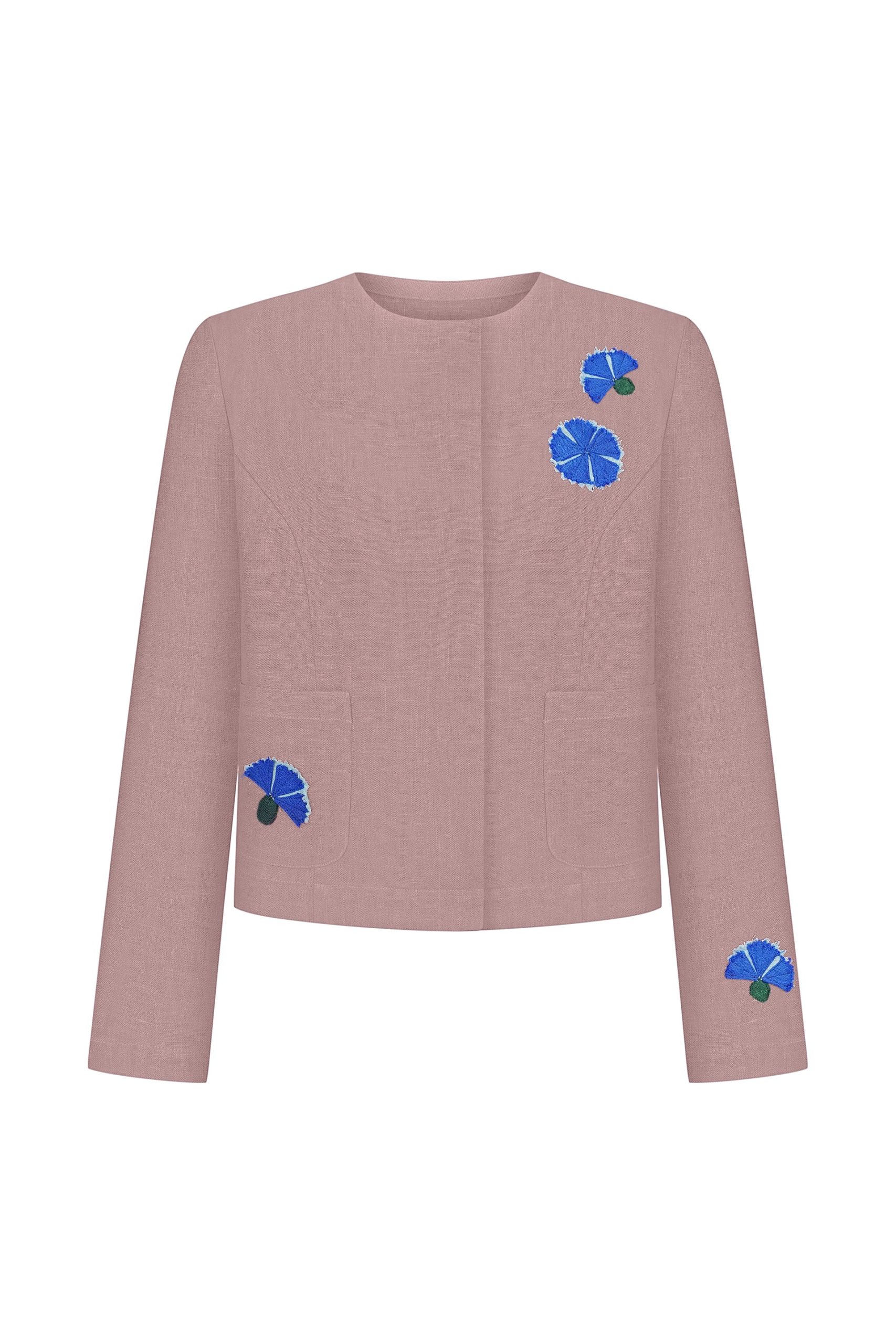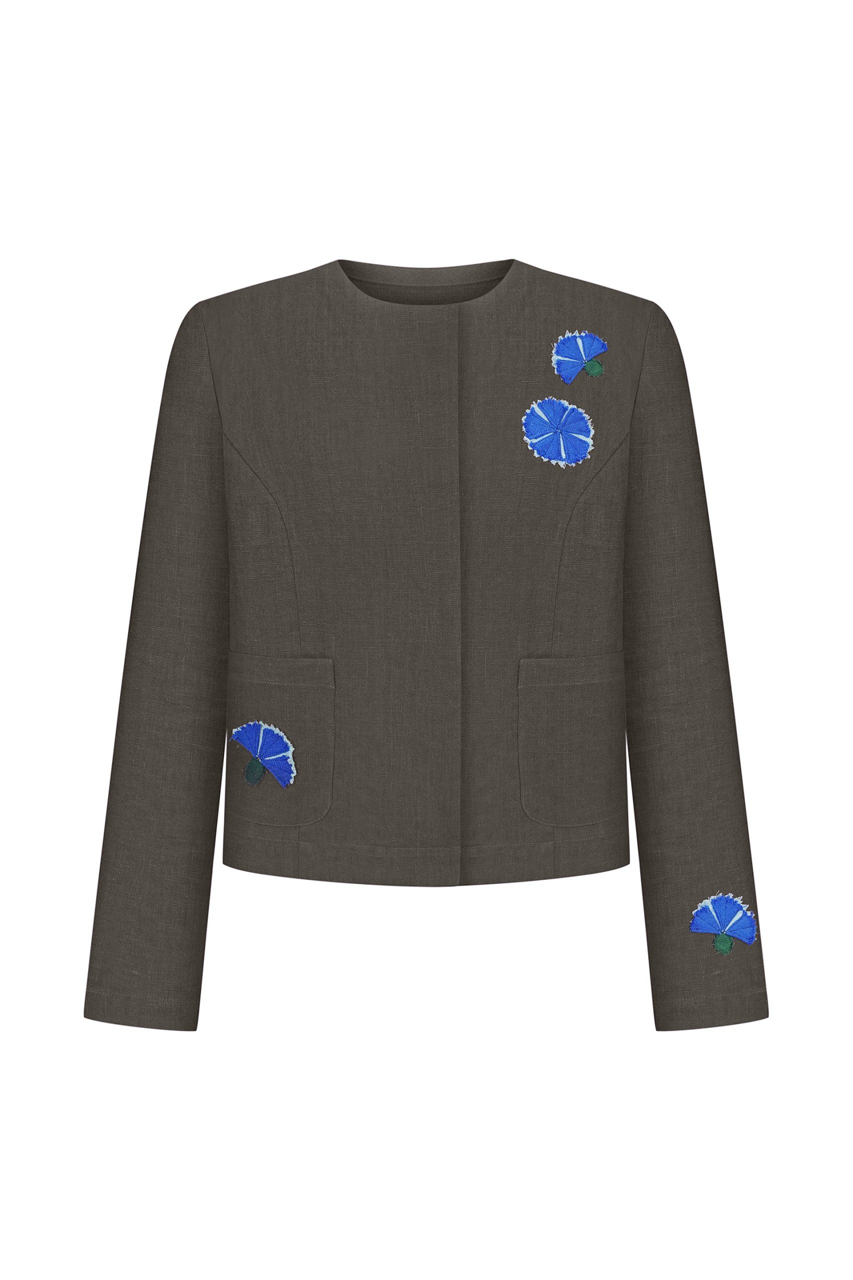 Короткий лляний кардиган без підкладки, прямого силуету, з довгими рукавами та округлою горловиною без застібки. Декорований ручною аплікацією у вигляді волошок, що розташовані на грудях, рукаві та кишені. Має дві накладні кишені спереду, застібка на одну кнопку зверху.