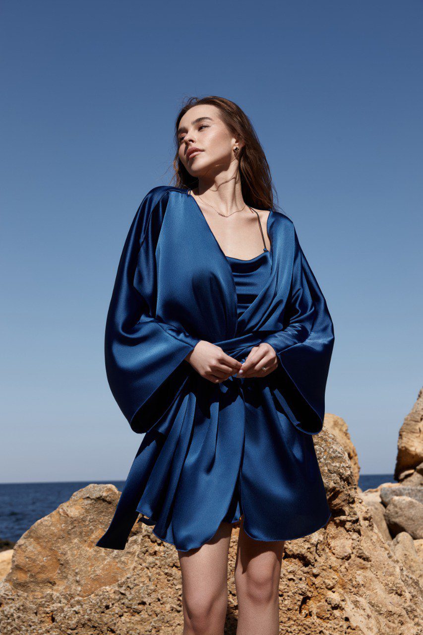 Кімоно onesize з італійського шовку — ідеальний вибір для відпочинку та домашнього комфорту. Вишуканий матеріал дарує відчуття легкості та розкоші, роблячи ваш образ витонченим та елегантним. Доступне в двох чарівних кольорах: глибокому синьому та ніжному рожевому.