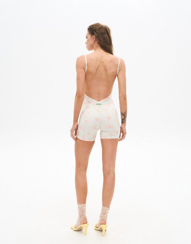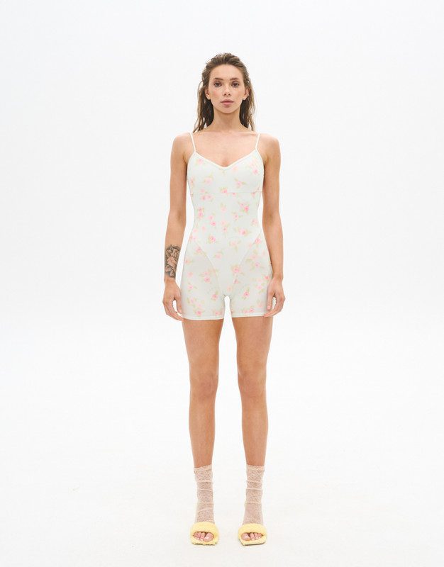 Комбінезон із відкритою спинкою. Витончена гра кольорів для найніжніших образів. Принт із акварельними квітковими мотивами на оливковому тлі. Подвійна тканина у зоні бікіні та грудей забезпечує комфорт, а брендовані регулятори на бретелях дозволяють ідеально підлаштувати посадку. Обирай для літніх вечорів або моментів, коли хочеться почуватися особливою.