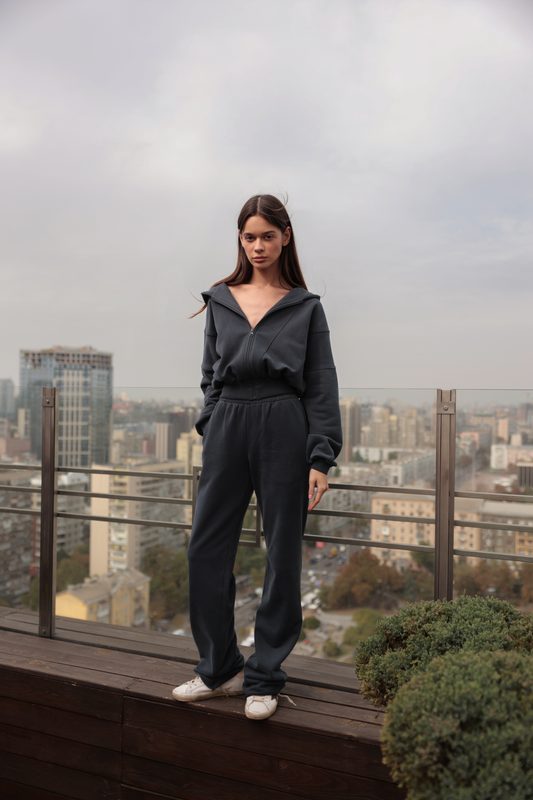 Наш бестселер – костюм із укороченим худі на застібці та штани прямого крою, які візуально видовжують силует