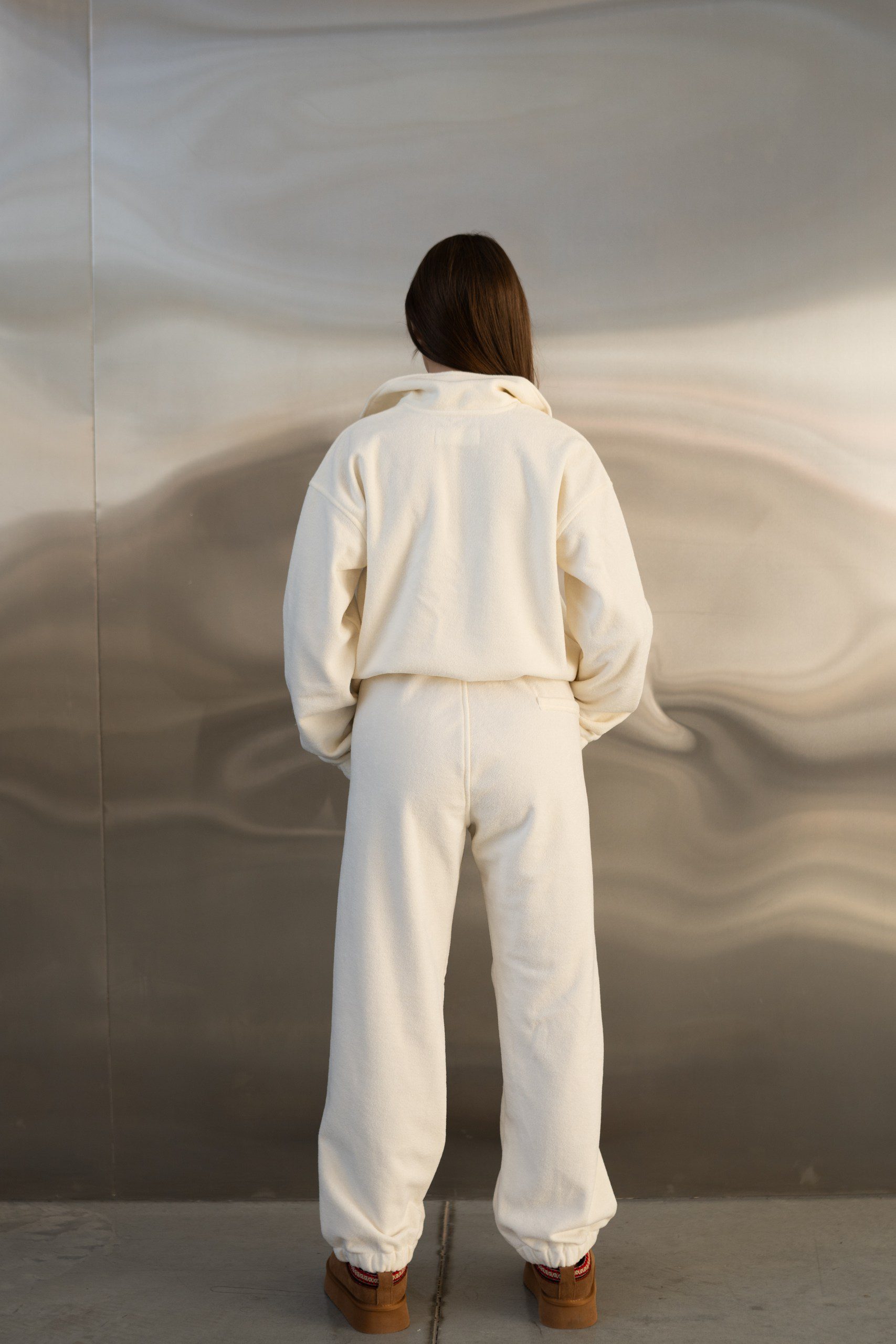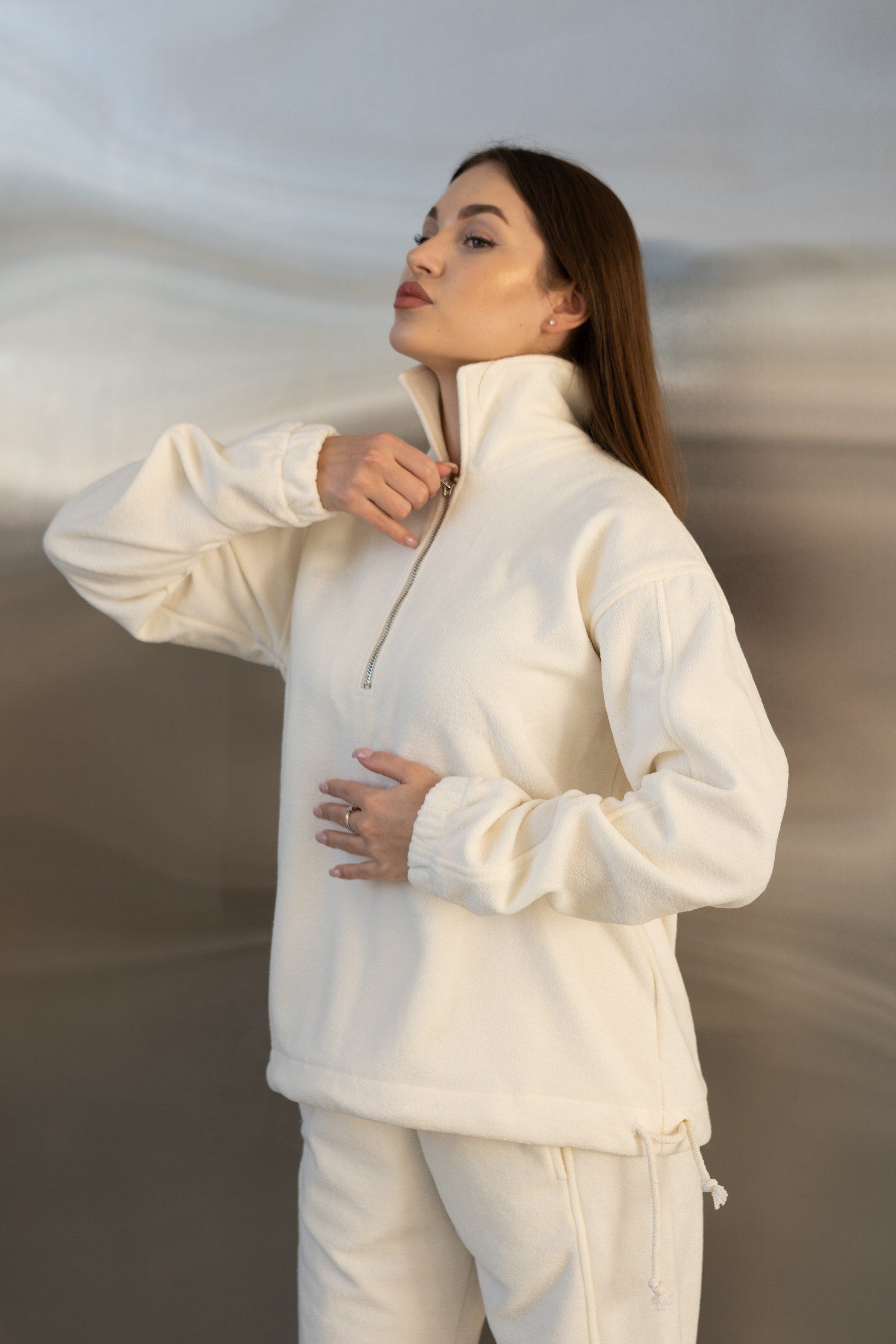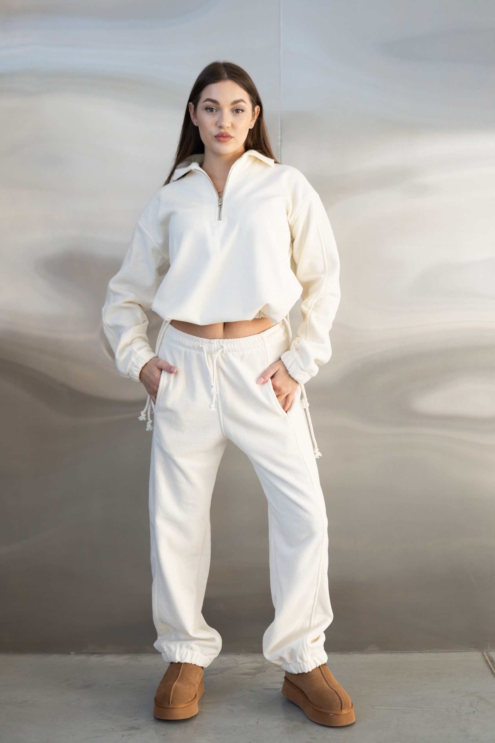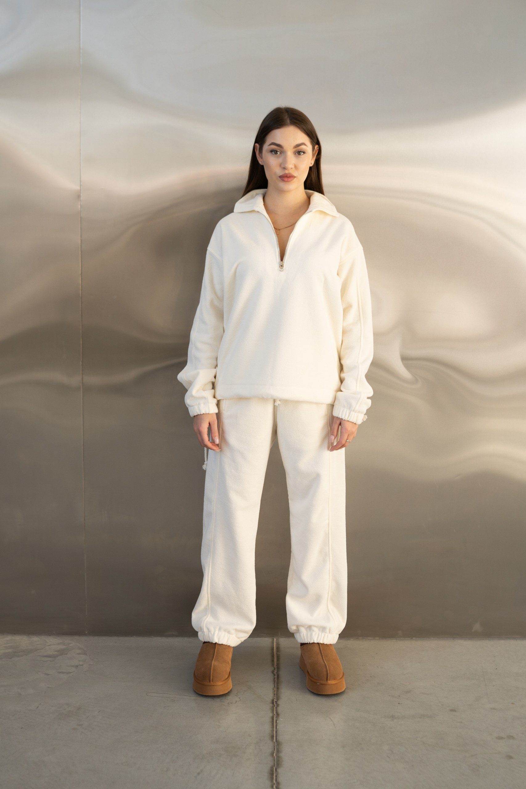 Затишний костюм молочного кольору включає вільний світшот із коміром на блискавці та широкі штани на резинці зі шнурком. М’яка тканина та комфортний крій роблять його ідеальним для осінніх та зимових прогулянок. Світлий відтінок можна легко комбінувати з усіма кольорами в гардеробі.