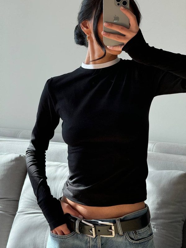 Лонгслів приталений з бавовни (чорний з білою горловиною)