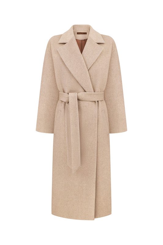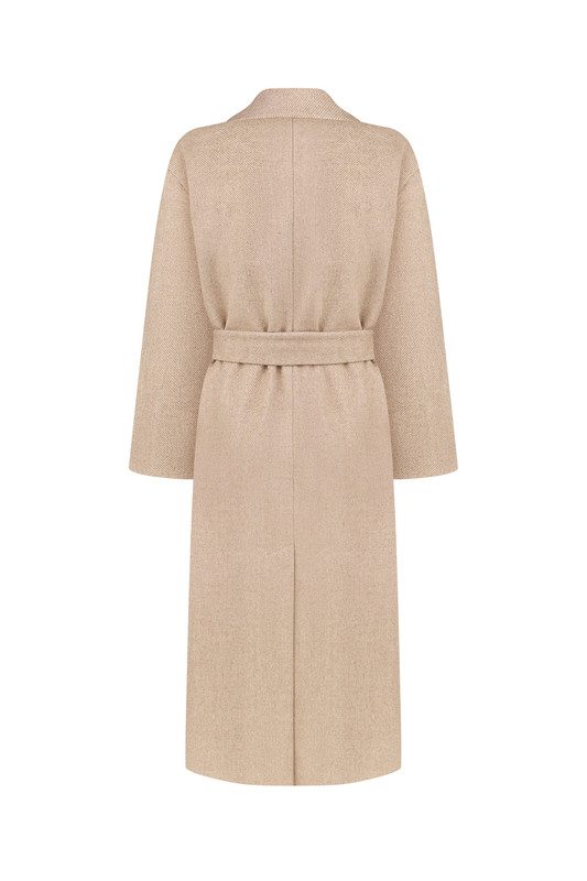 Елегантне двобортне пальто без ґудзиків із класичними лацканами та поясом на зав’язку — вишукане рішення для сучасного гардероба. Модель має спущене плече, розріз-шліцу по спинці, що забезпечує свободу рухів та комфорт у носінні. Виконане з тканини у візерунок «ялинка» в бежевій та сірій гамі, пальто виглядає стильно й універсально. Підкладка зі 100% віскози гарантує ідеальну посадку та приємні відчуття. Лаконічний дизайн та силует роблять цю модель базовою класикою для будь-якого сезону.