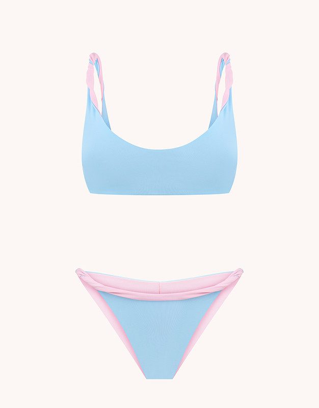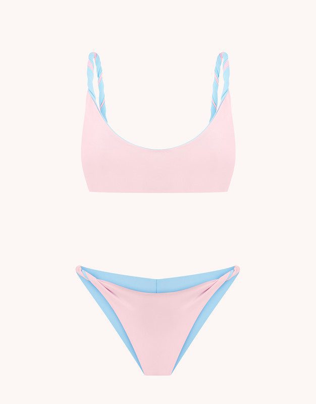 Роздільний двосторонній купальник у ніжних світло-рожевому і блакитному кольорах.