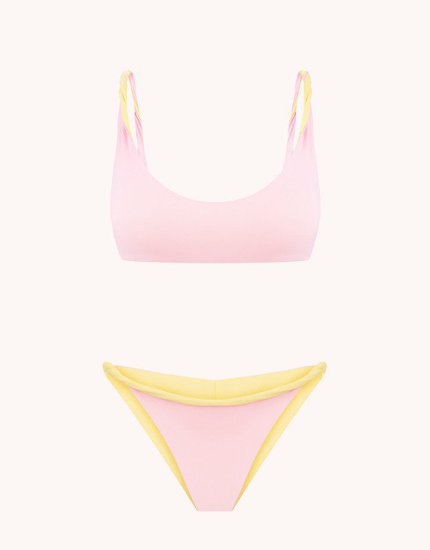 Роздільний двосторонній купальник у ніжних світло-рожевому і вершково-жовтому кольорах.