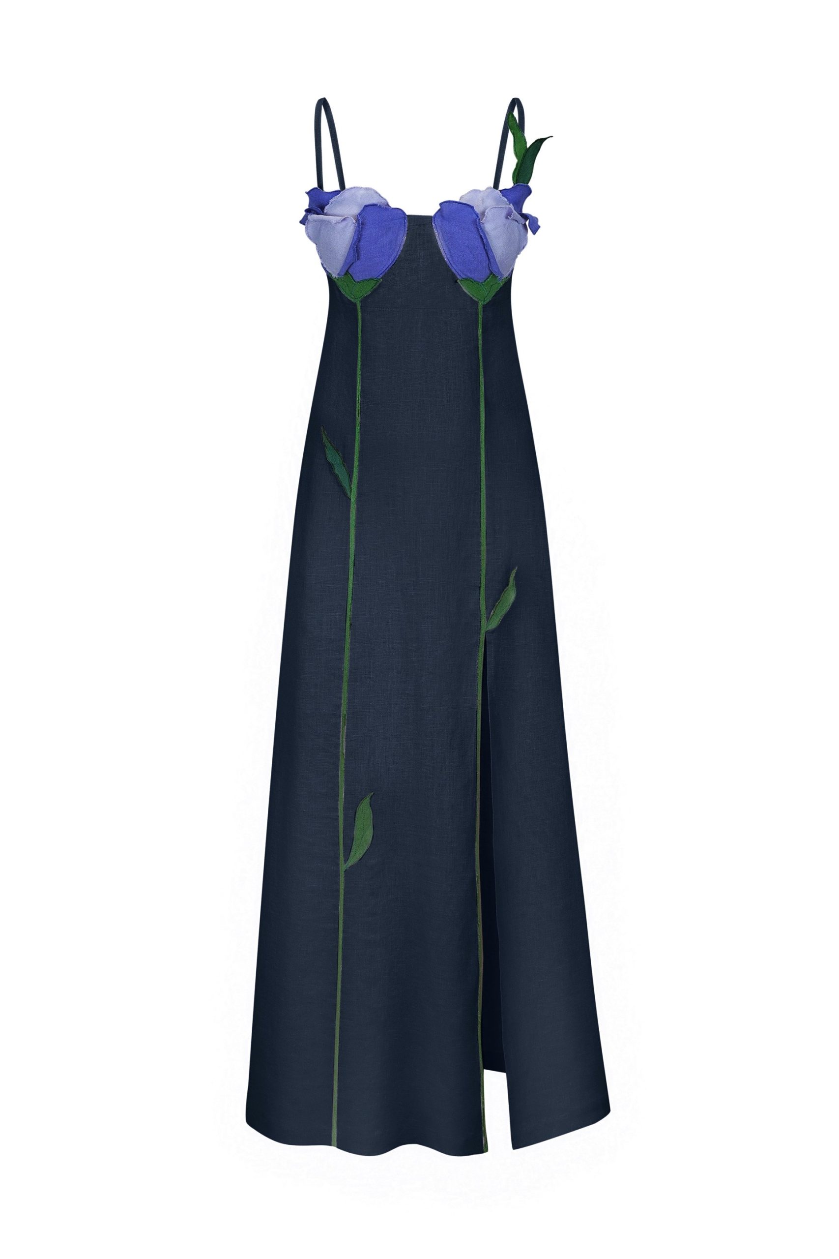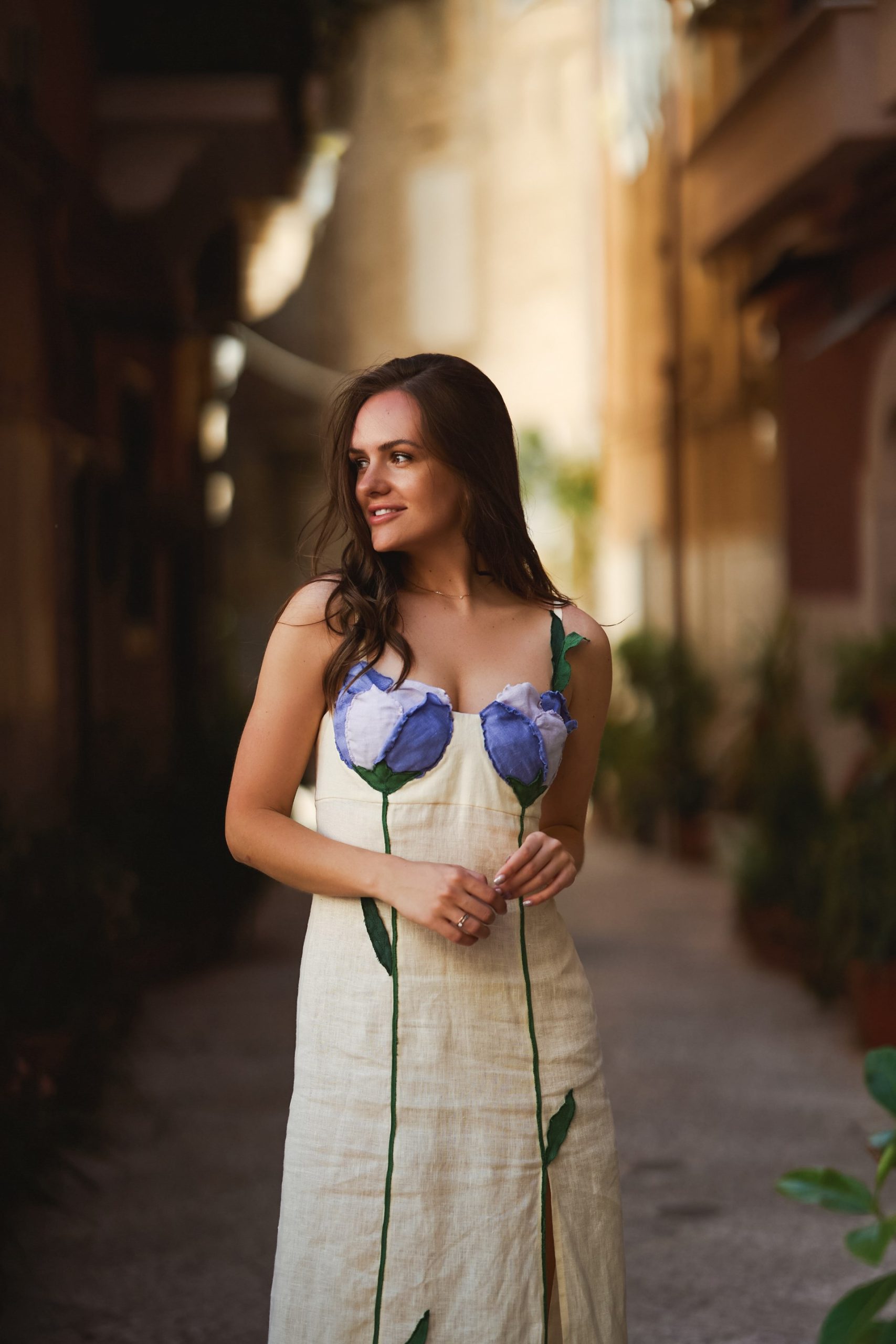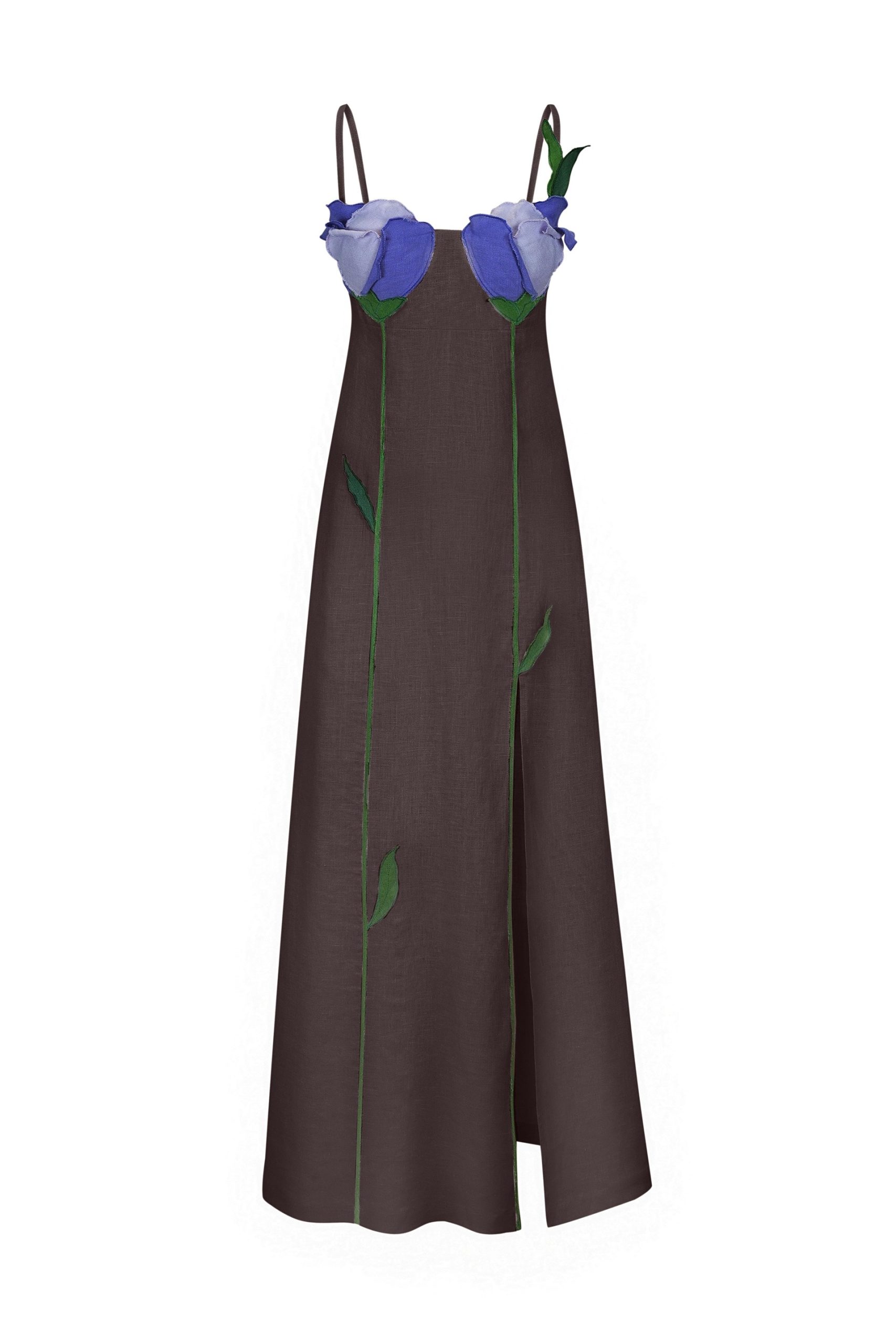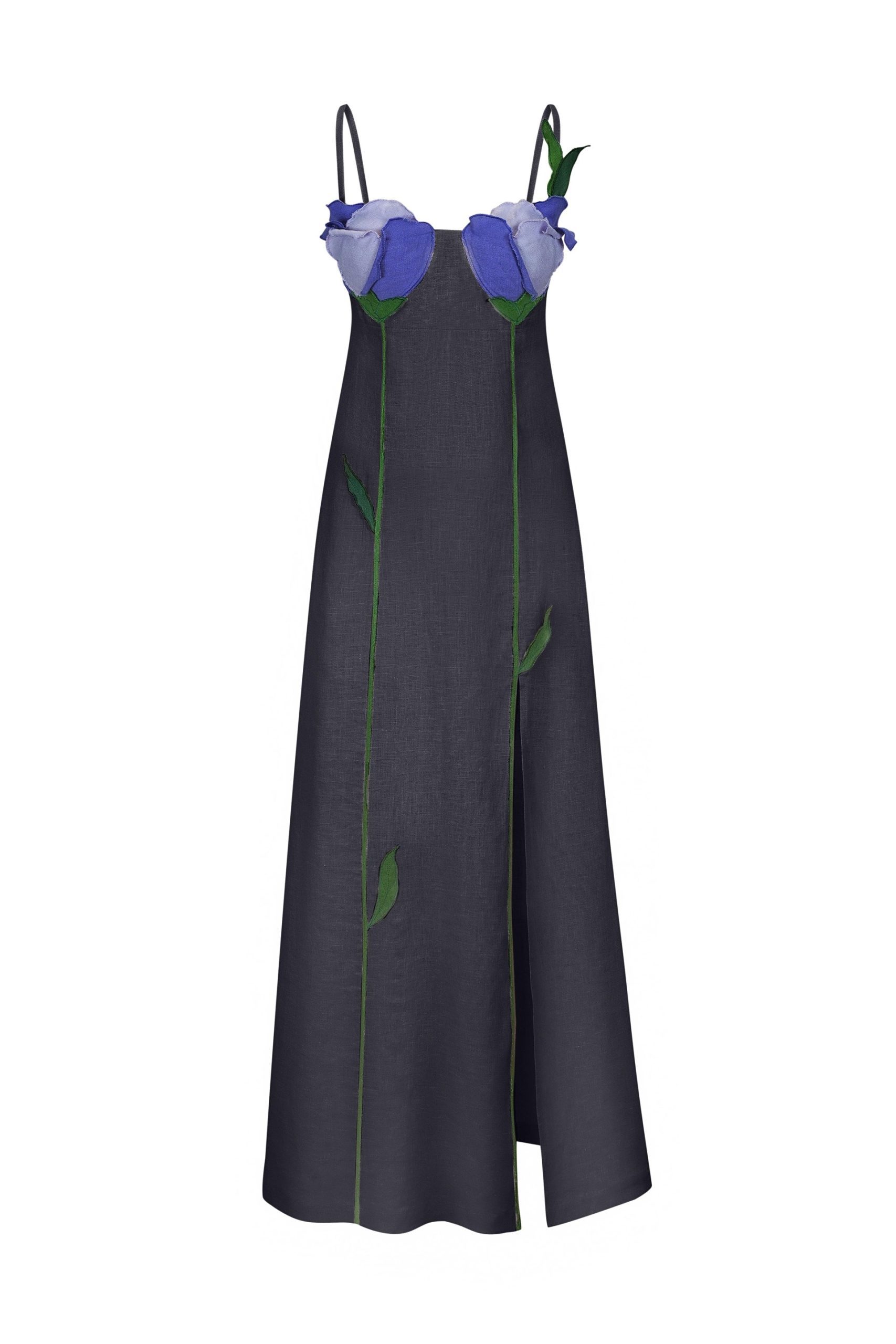 Лляний сарафан в довжині максі з чашками у вигляді квіток маків або льону на тонких бретелях. Квіти, листки та стеблі виконані вручну у вигляді аплікації з залишків виробництва. Бретелі регулюються, позаду в області бюсту сукня на гумці для зручної посадки. Зліва на нозі розріз. Збоку на сарафані є потайна блискавка для зручного вдягання.