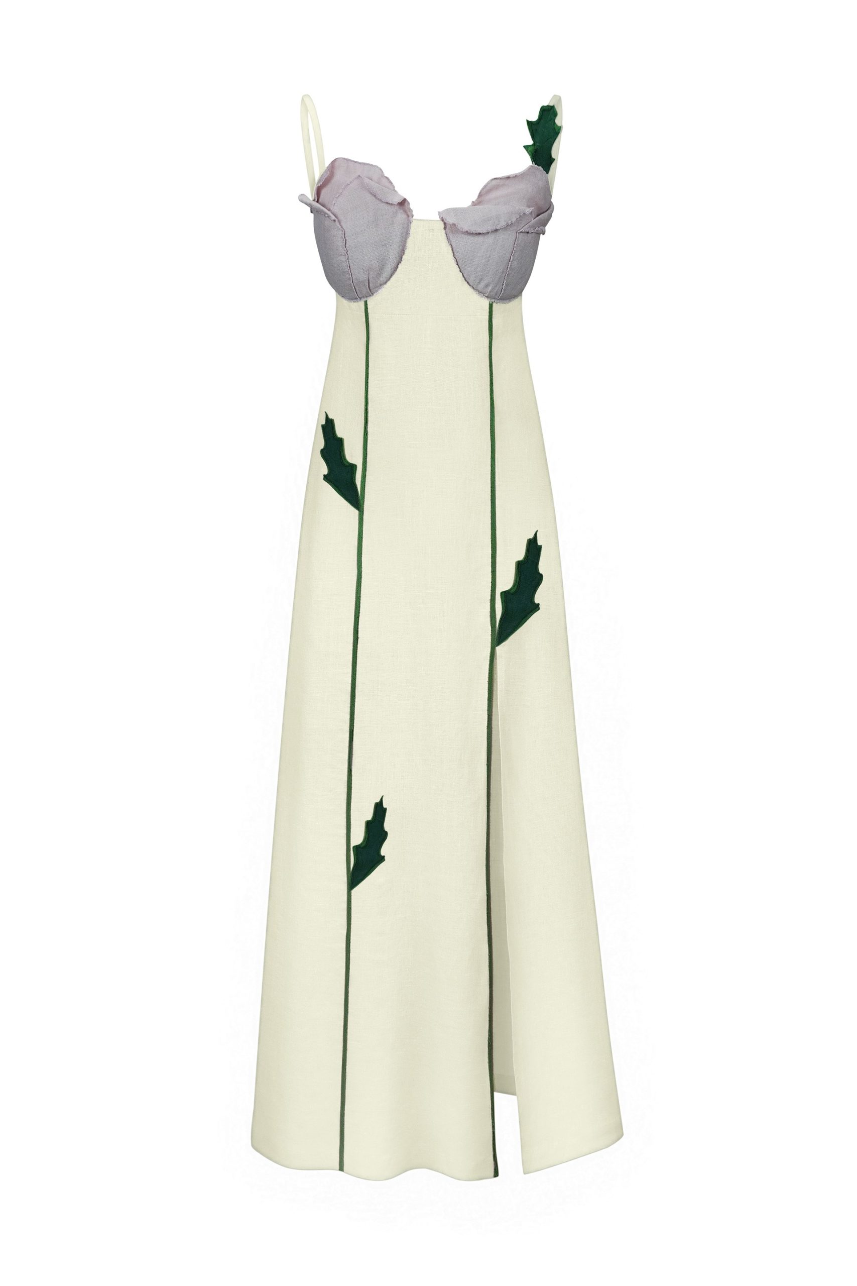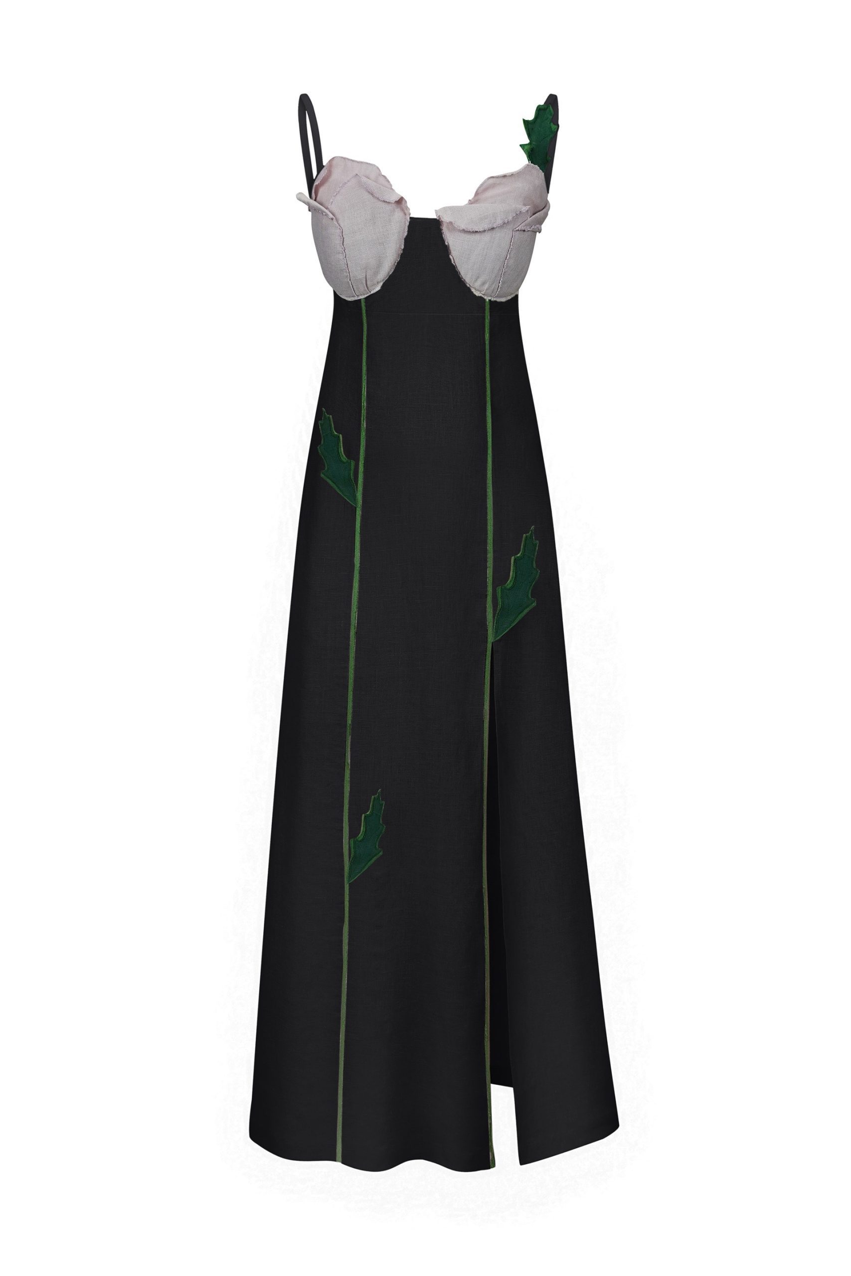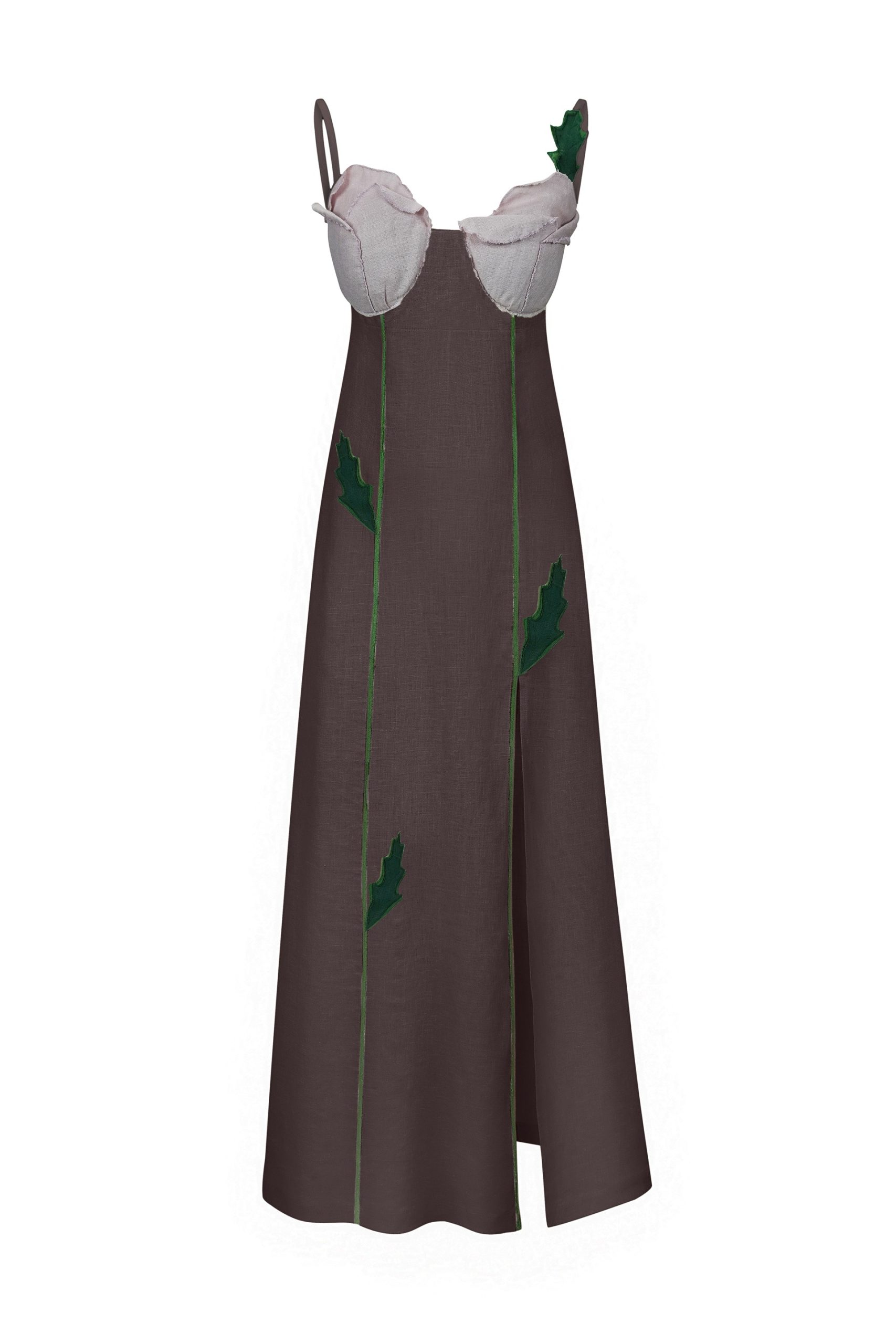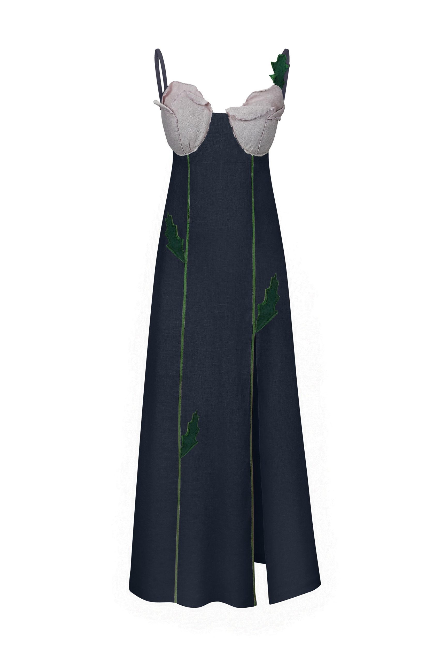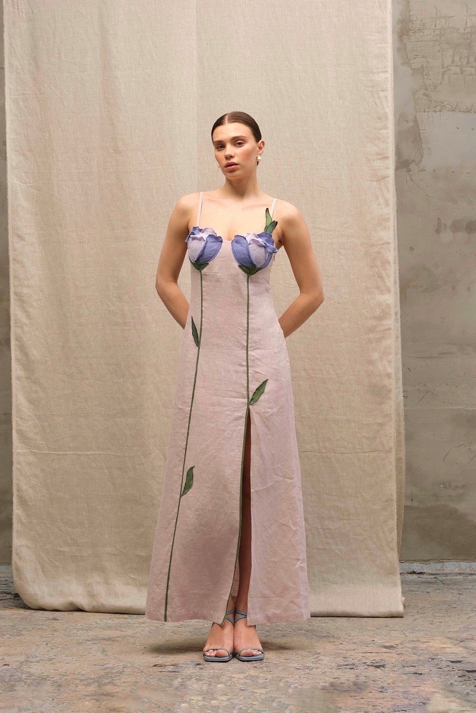 Лляний сарафан в довжині максі з чашками у вигляді квіток маків або льону на тонких бретелях. Квіти, листки та стеблі виконані вручну у вигляді аплікації з залишків виробництва. Бретелі регулюються, позаду в області бюсту сукня на гумці для зручної посадки. Зліва на нозі розріз. Збоку на сарафані є потайна блискавка для зручного вдягання.