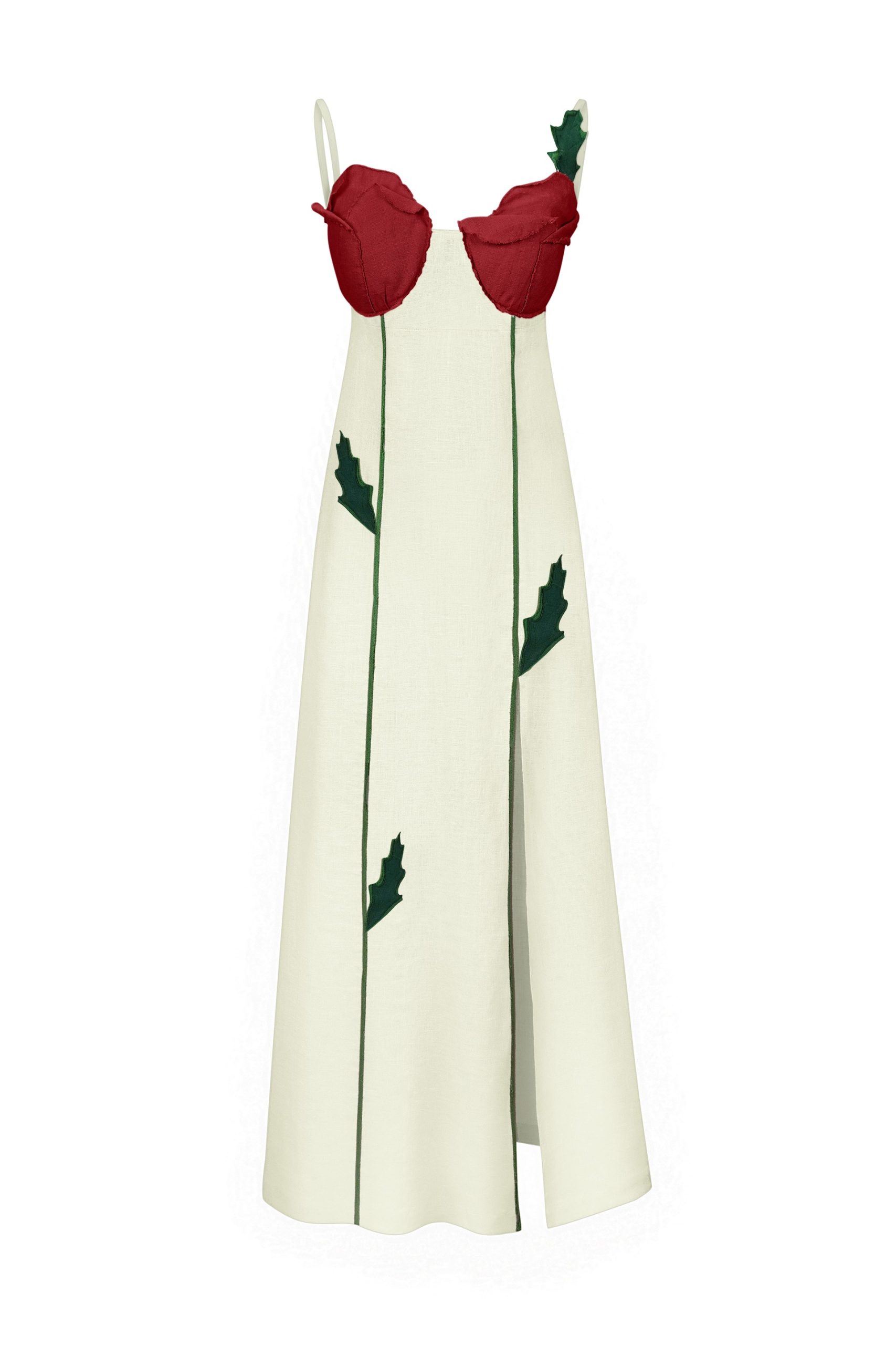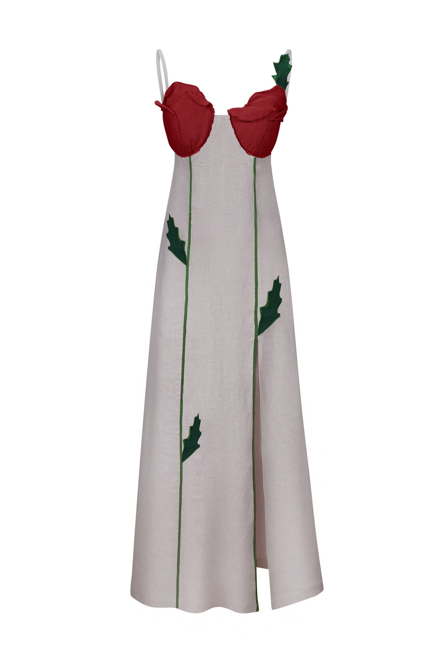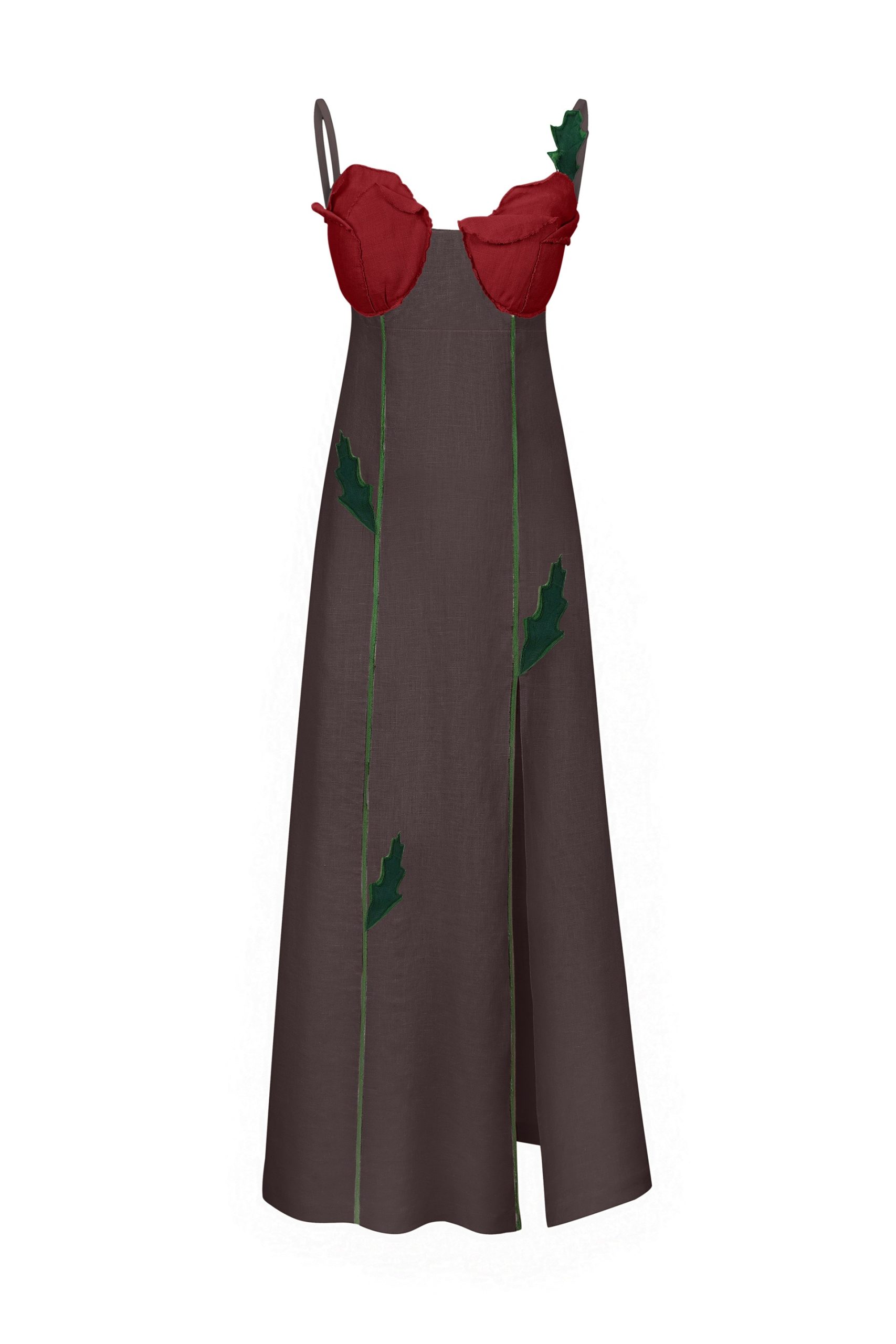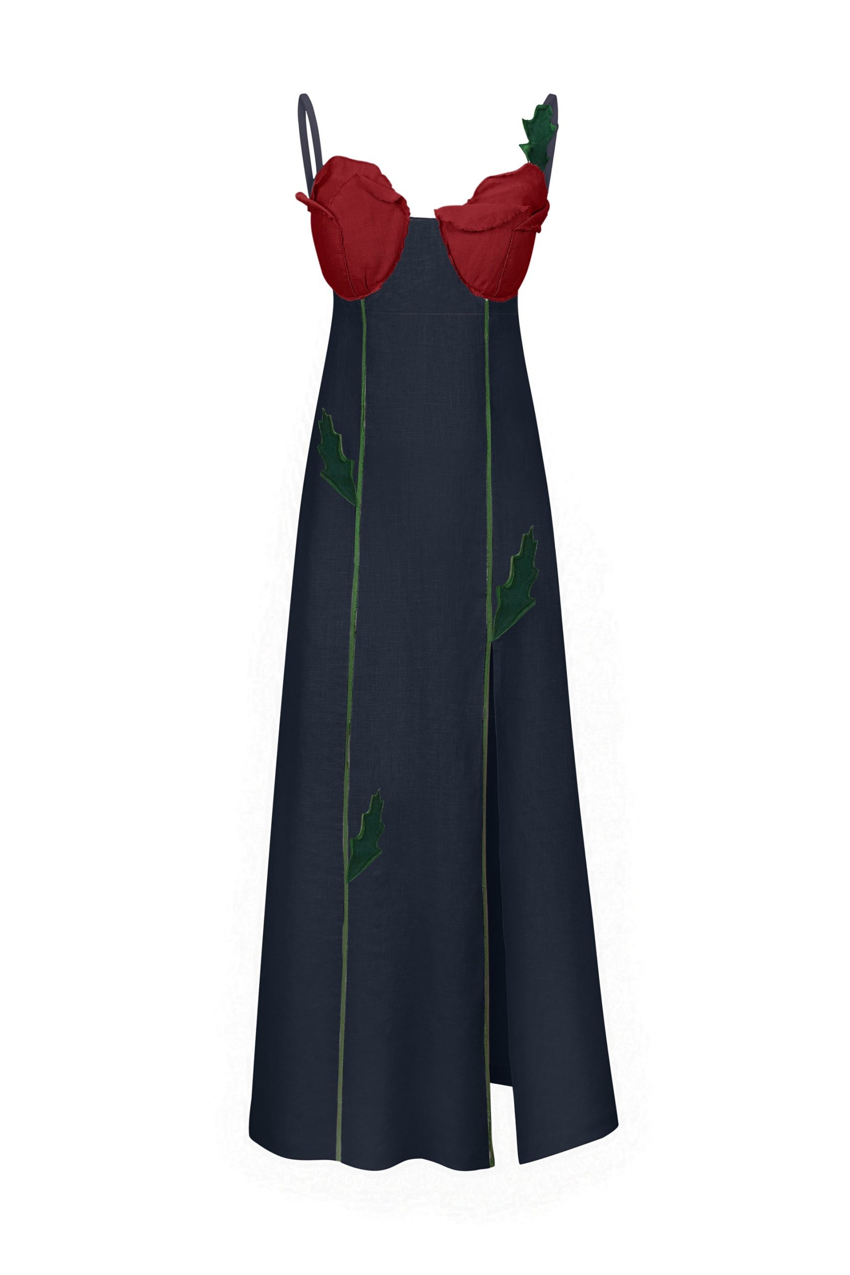 Лляний сарафан в довжині максі з чашками у вигляді квіток маків або льону на тонких бретелях. Квіти, листки та стеблі виконані вручну у вигляді аплікації з залишків виробництва. Бретелі регулюються, позаду в області бюсту сукня на гумці для зручної посадки. Зліва на нозі розріз. Збоку на сарафані є потайна блискавка для зручного вдягання.