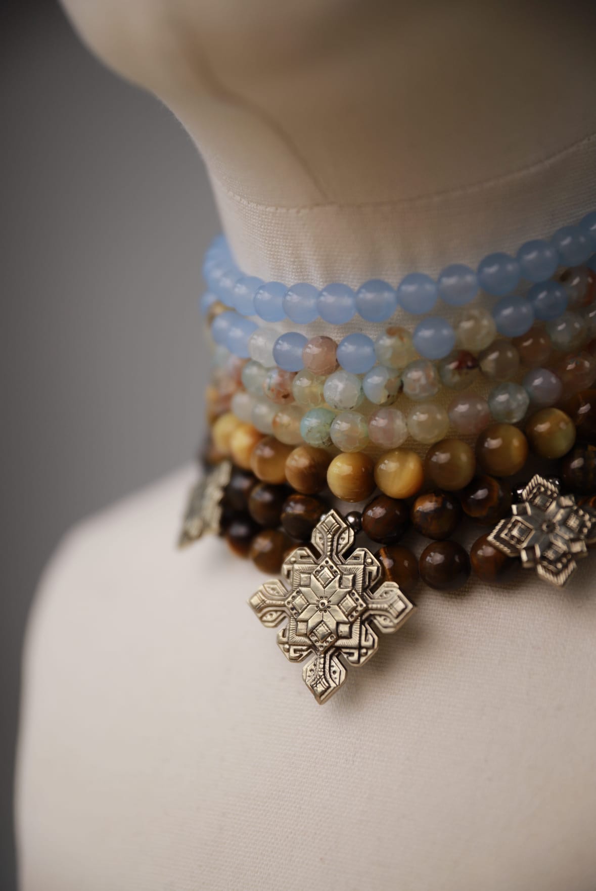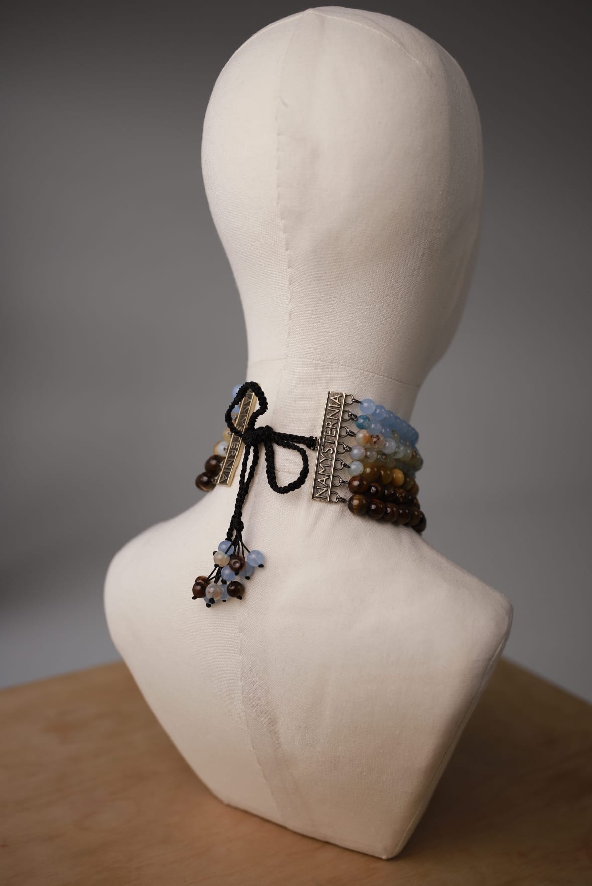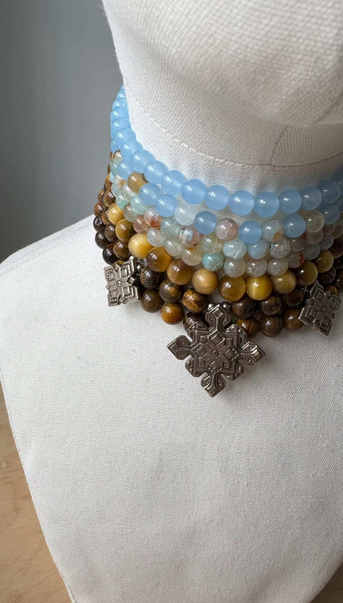 Семирядний градієнтний чокер з агату та тигрового ока з трьома підвісами ручнох роботи. Позаду корди (завʼязки), сплетені вручну, для регулювання під будь-який обхват шиї. Надійна металева фурнітура відлита на замовлення.