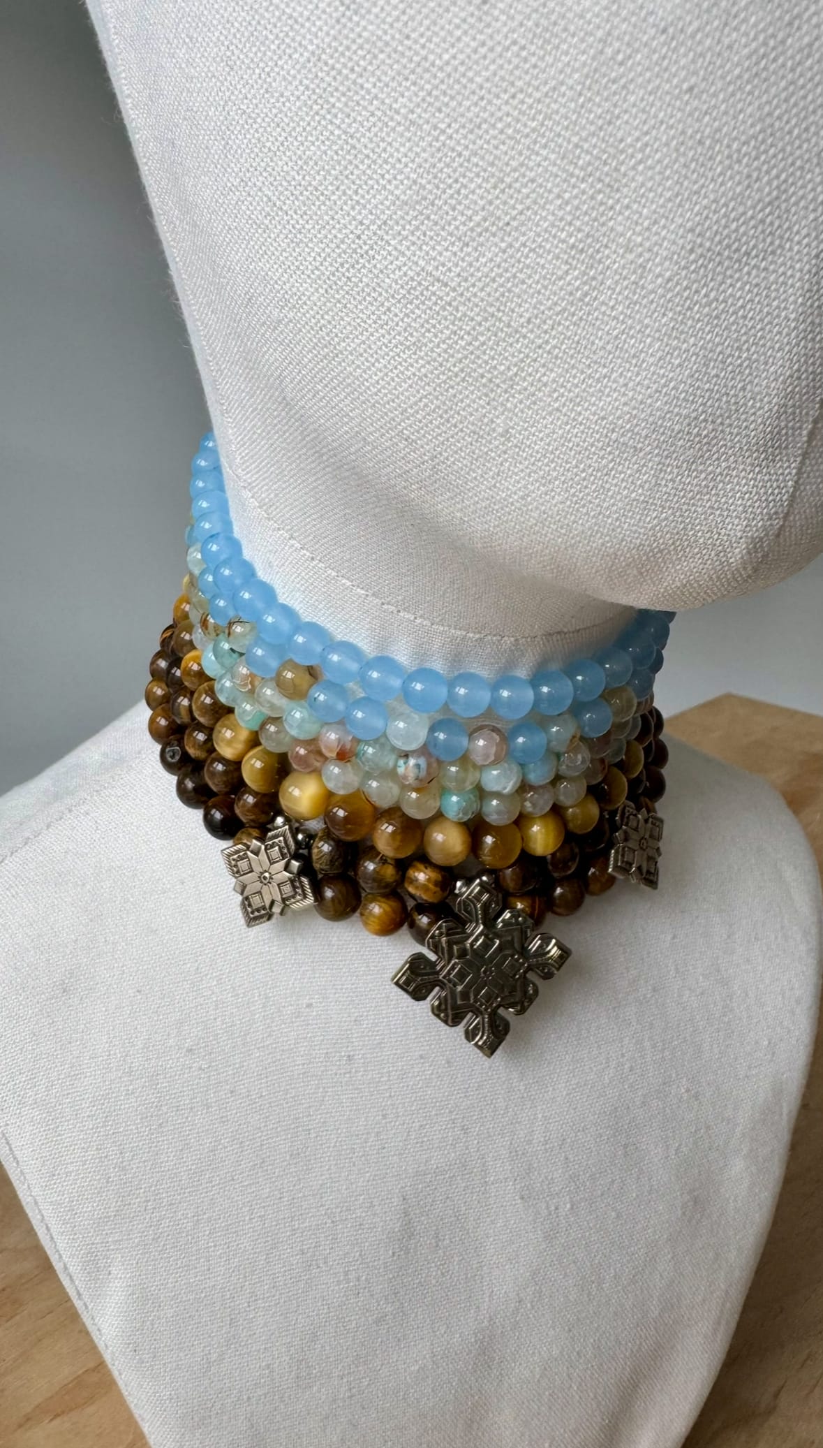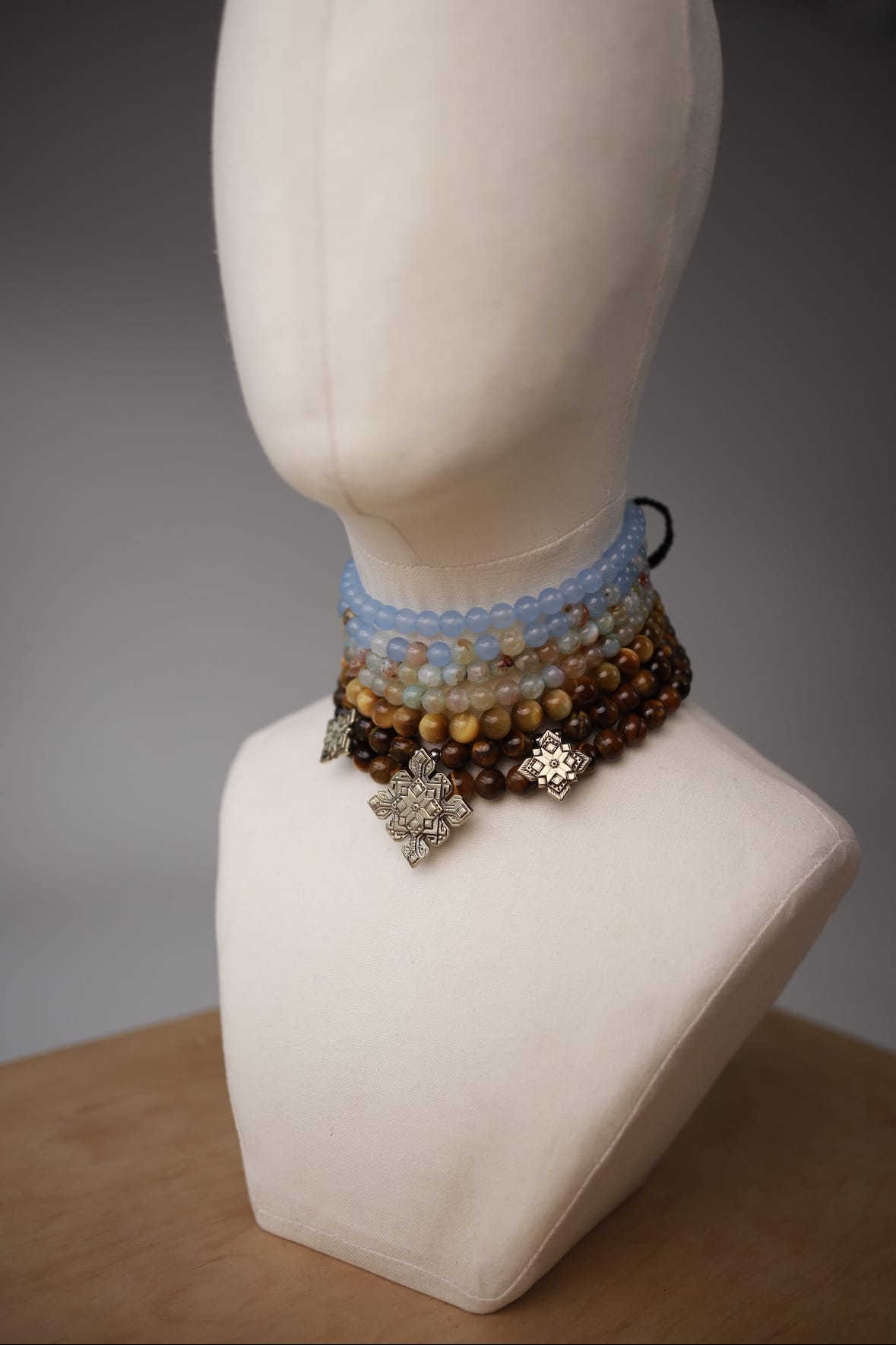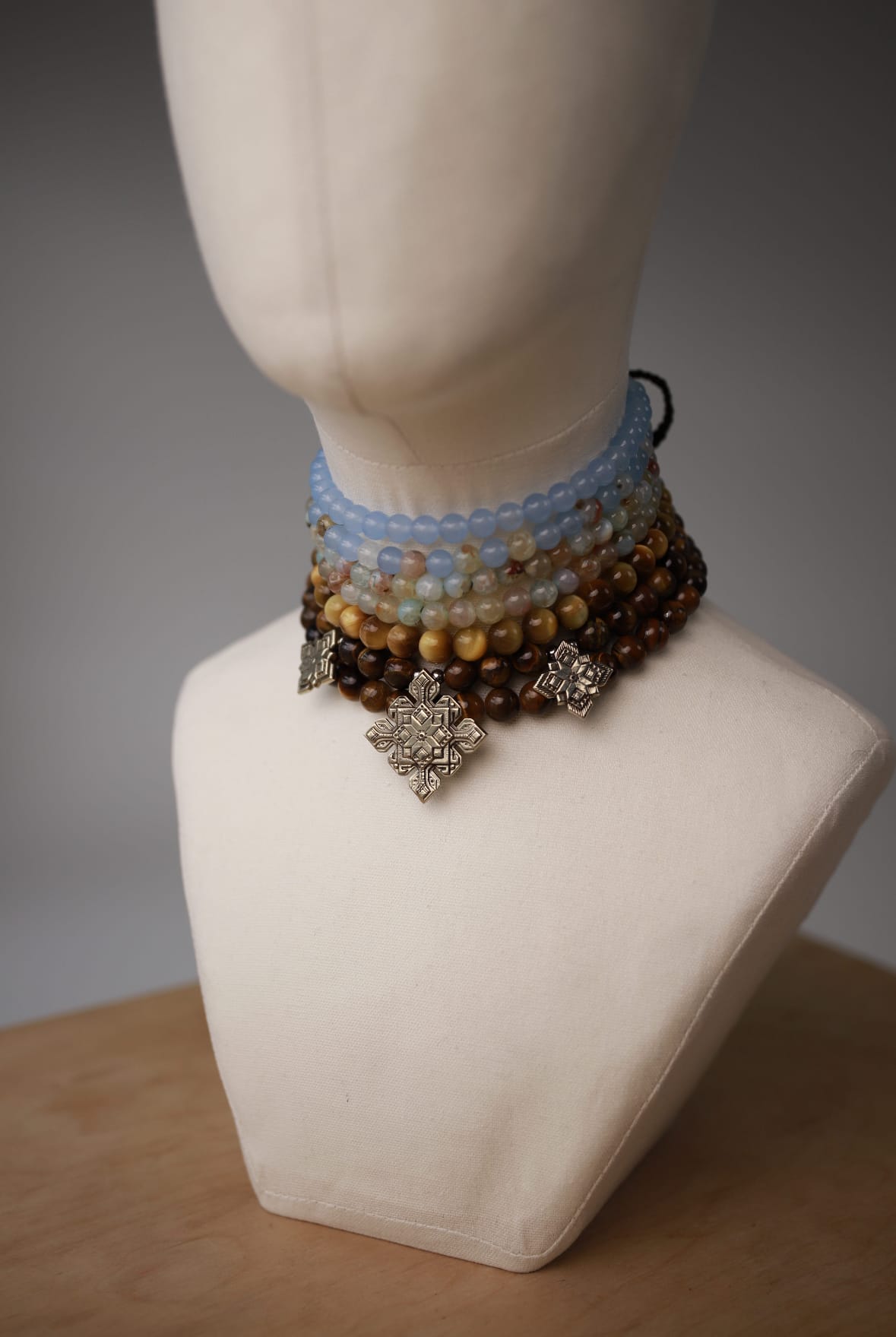 Семирядний градієнтний чокер з агату та тигрового ока з трьома підвісами ручнох роботи. Позаду корди (завʼязки), сплетені вручну, для регулювання під будь-який обхват шиї. Надійна металева фурнітура відлита на замовлення.