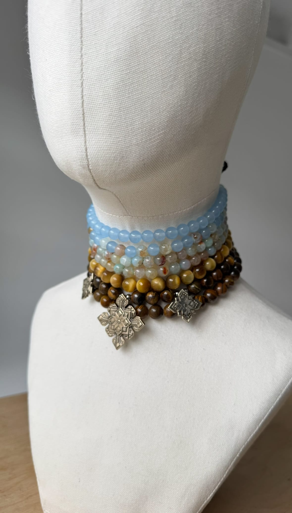 Seven-Strand Gradient Choker in Agate and Tiger’s Eye with Handmade Pendants.