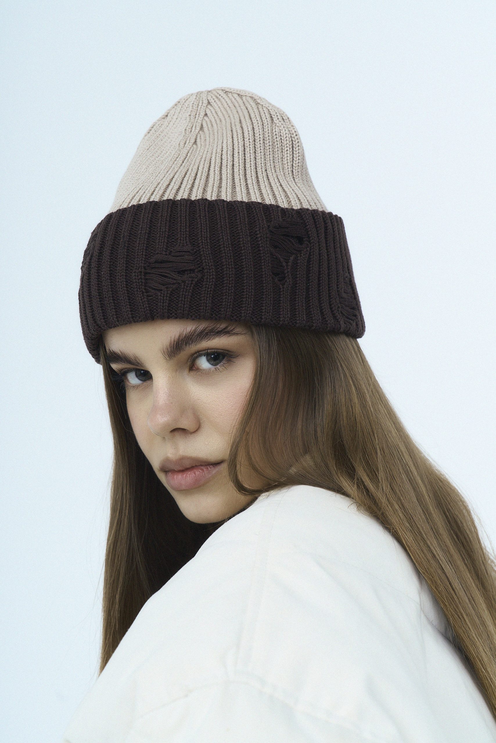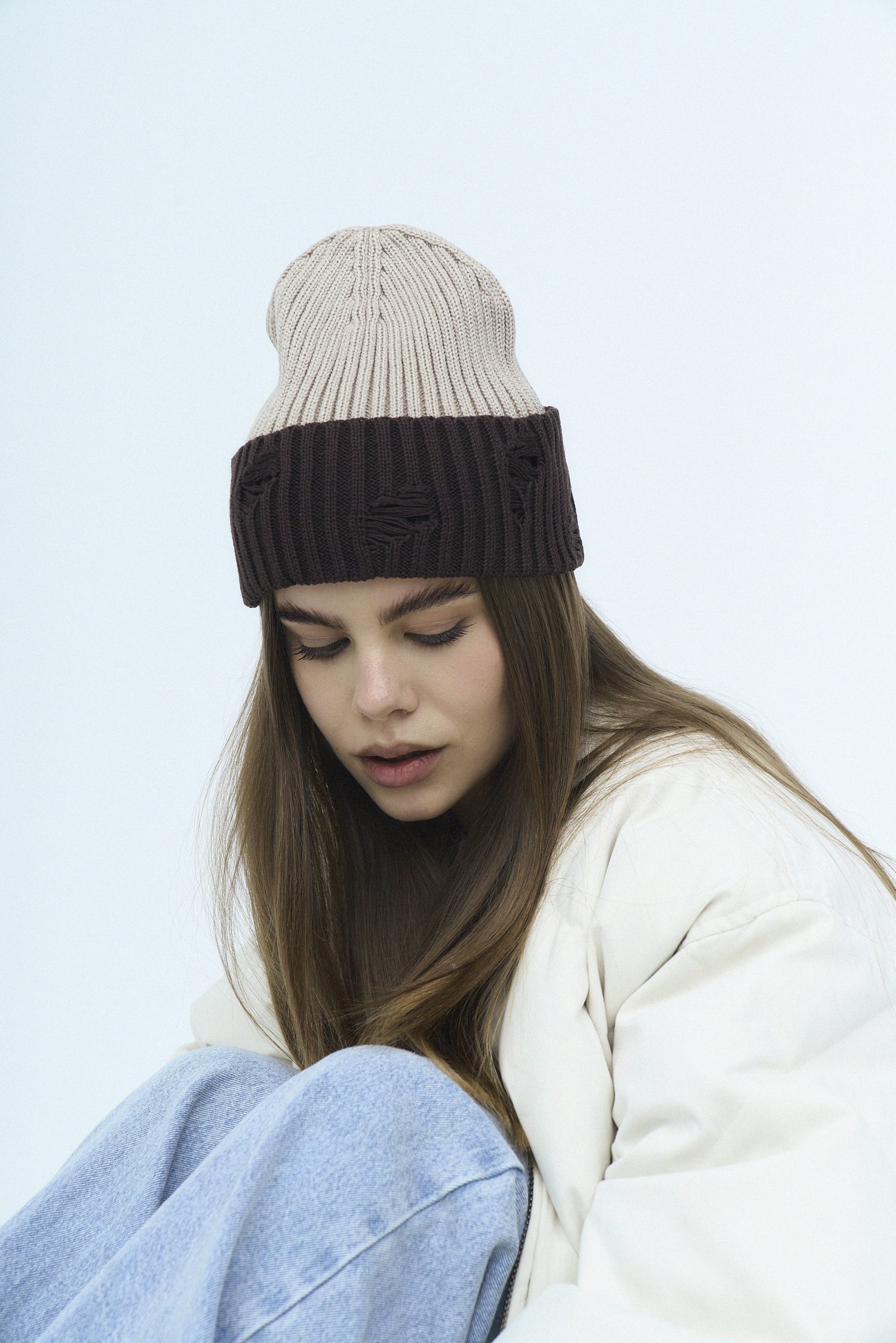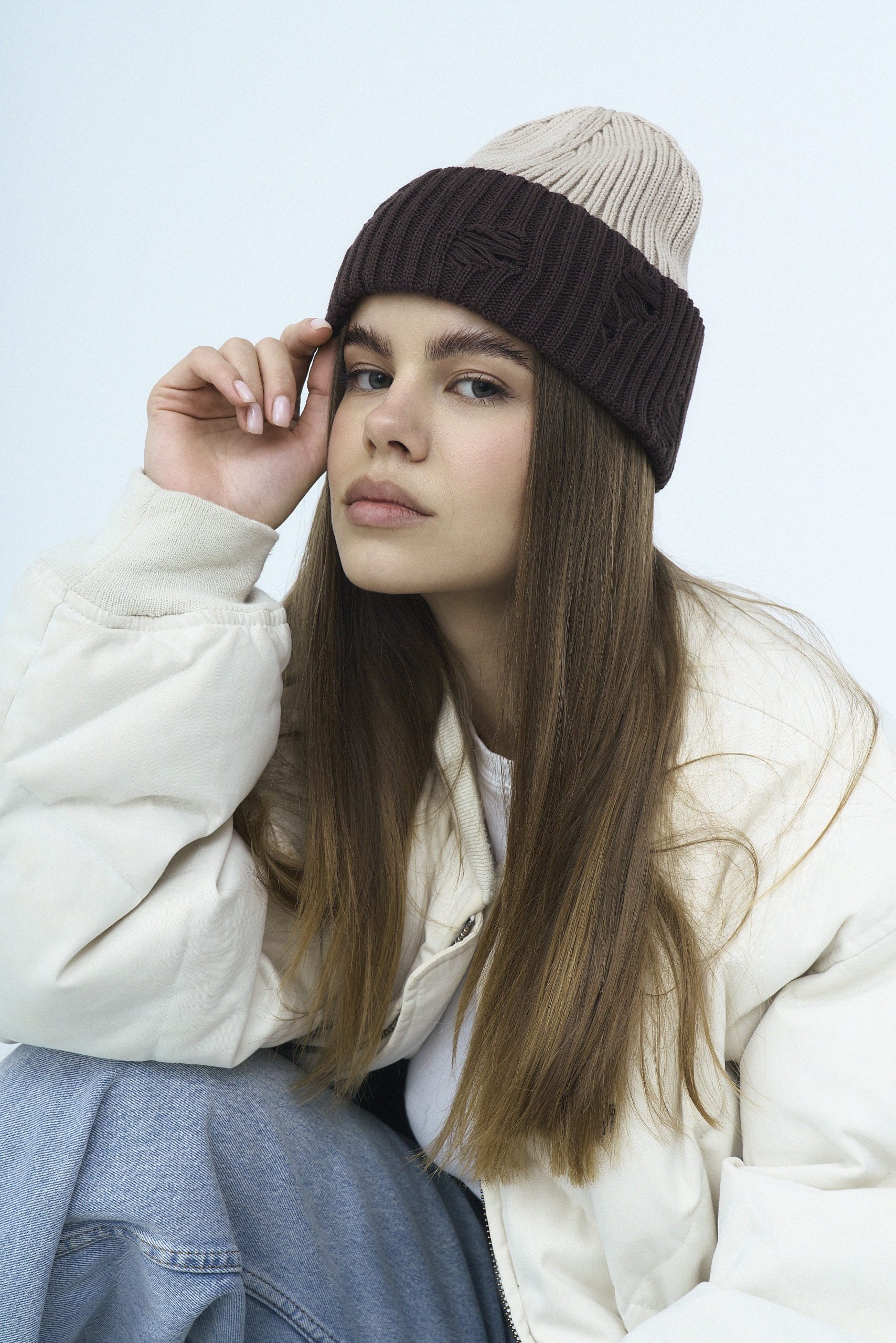 Бежево-коричнева шапка “Пухкýр” — це ваш персональний затишок у холодну пору. Виконана зі 100% бавовни, вона ніжно огортає голову, даруючи комфорт і дихаюче тепло.