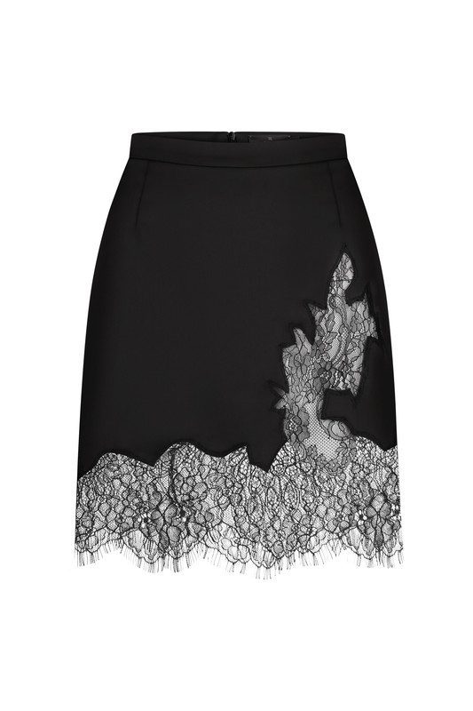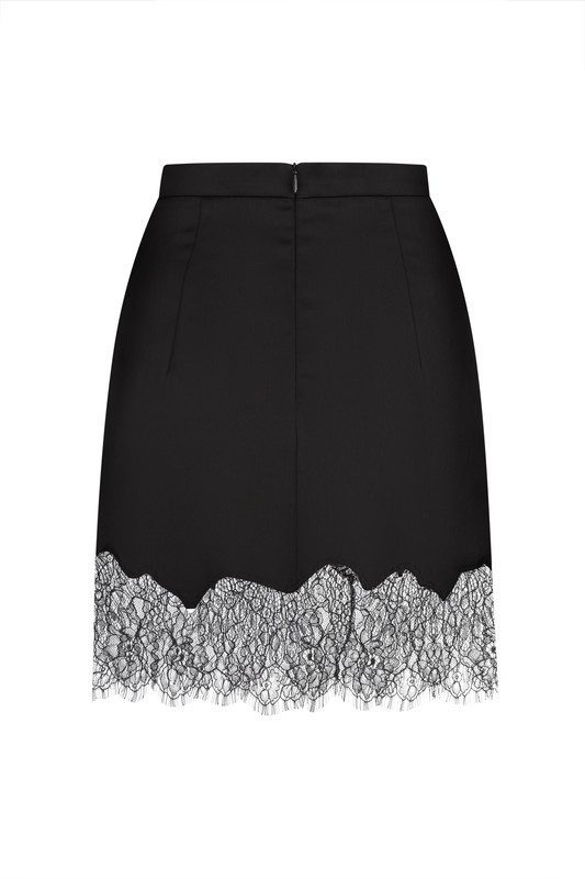 Вишукана міні-спідниця з шовку та мережива — елегантний акцент у гардеробі сучасної жінки. Лаконічний крій поєднується з вишуканим французьким мереживом шантильє, що додає образу жіночності та витонченості. Завдяки делікатному блиску тканини та акцентним мереживним деталям, ця модель однаково доречна як для вечірнього виходу, так і для стильних денних луків.