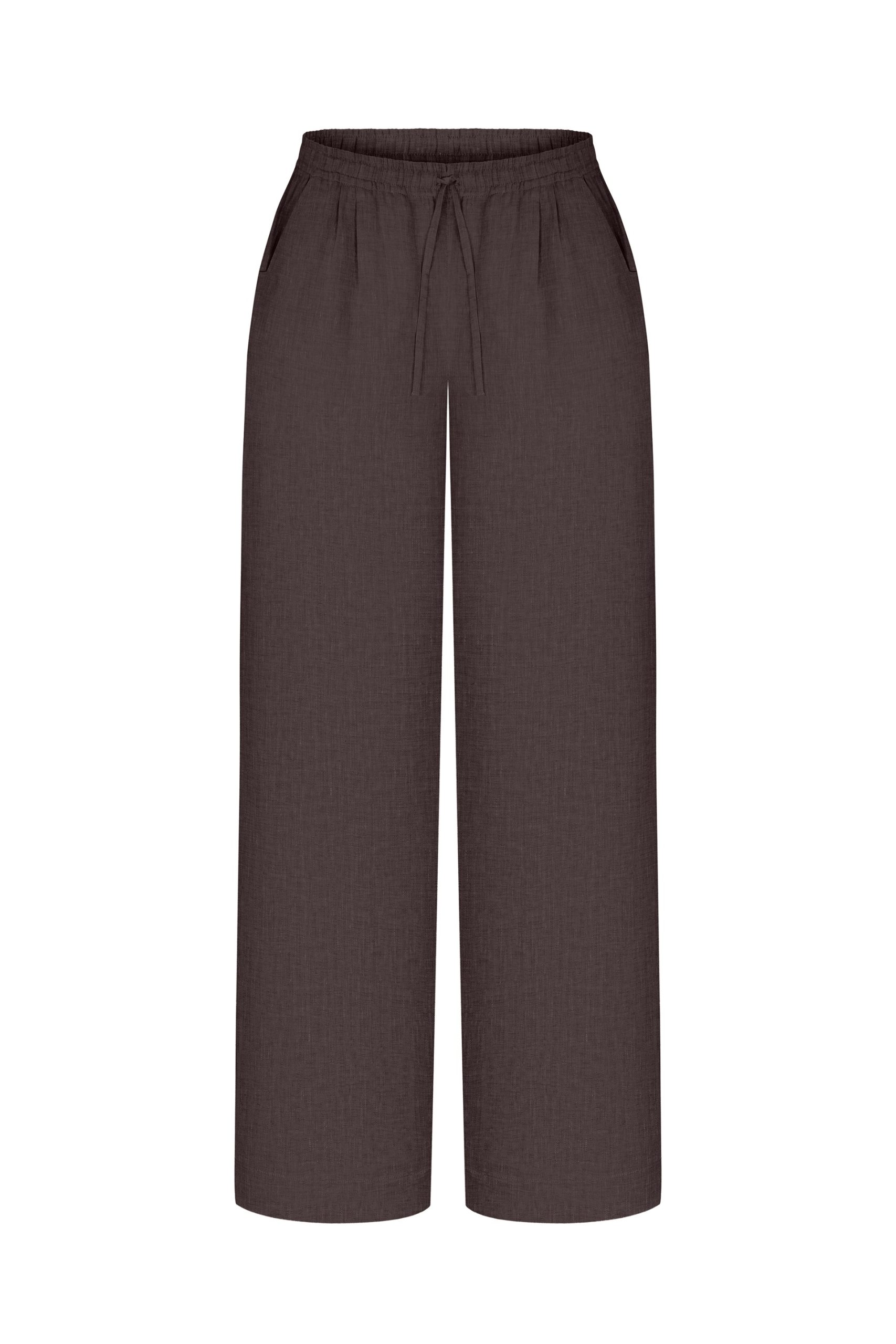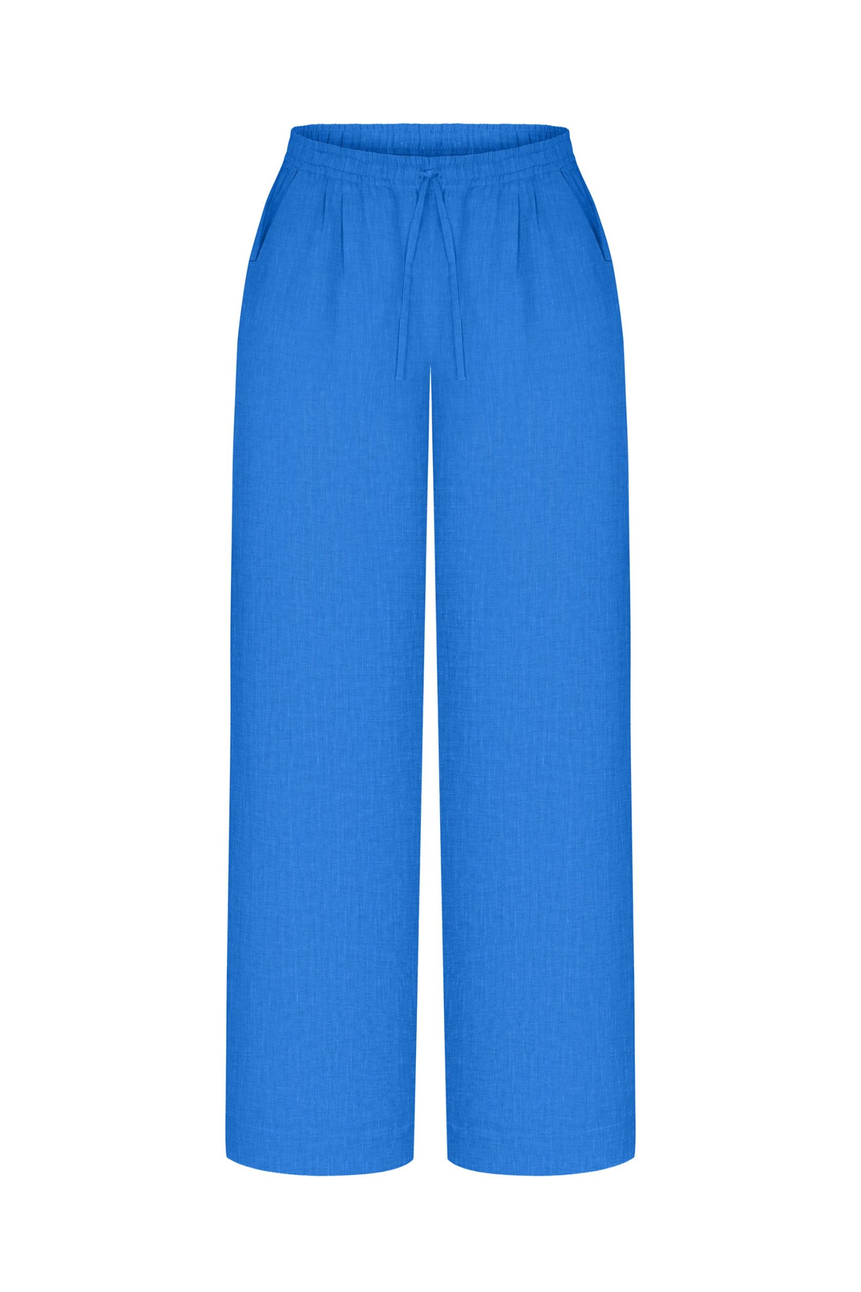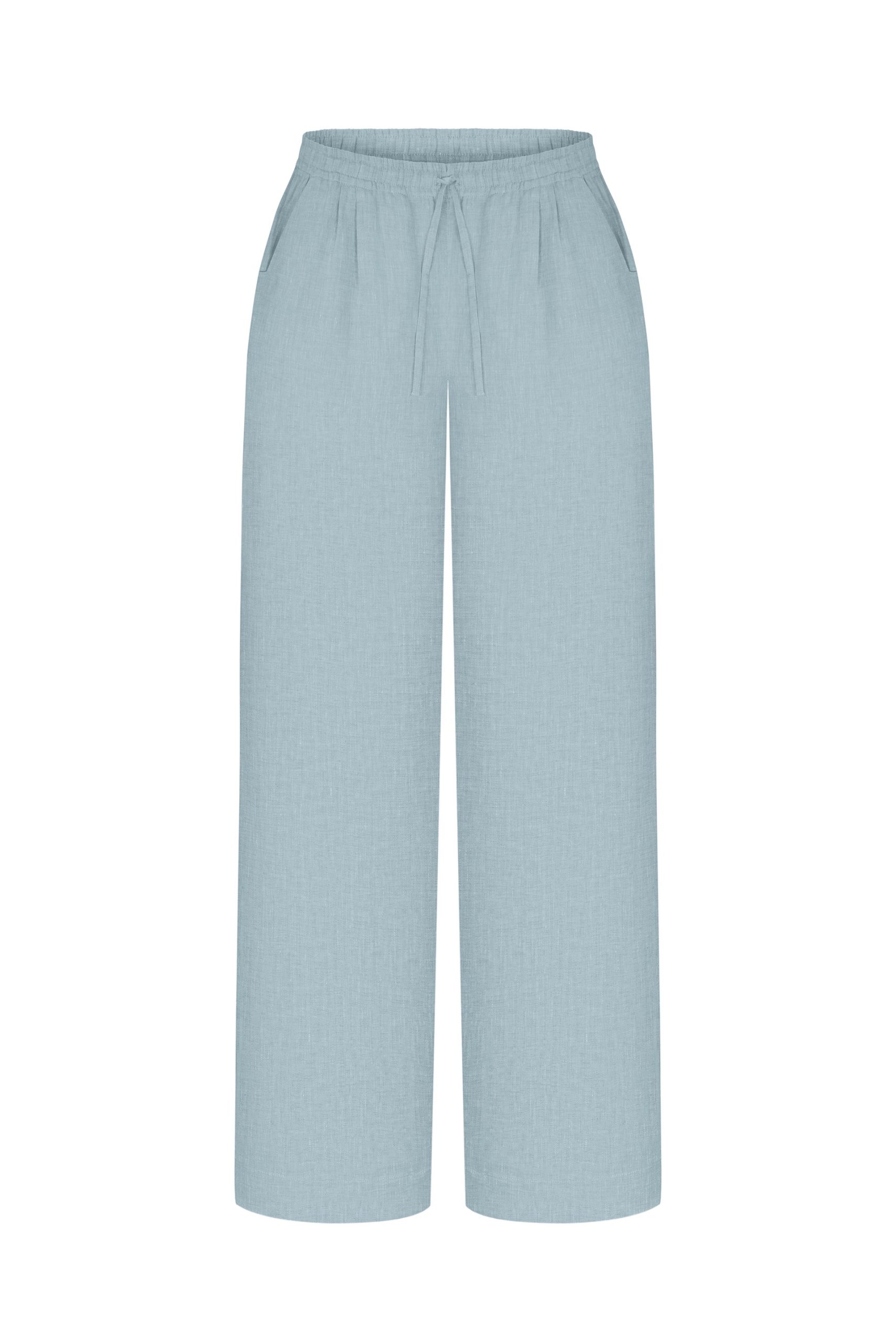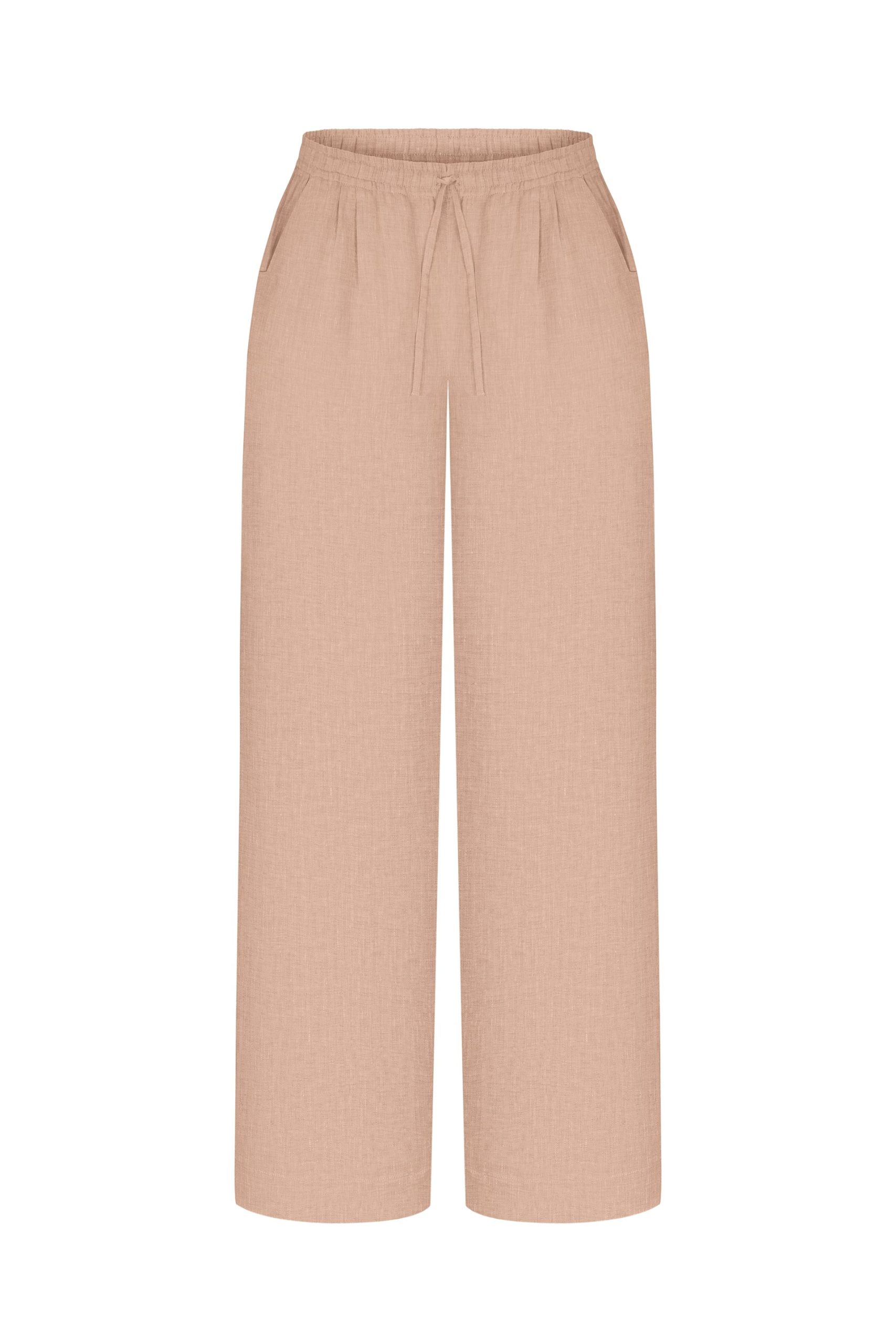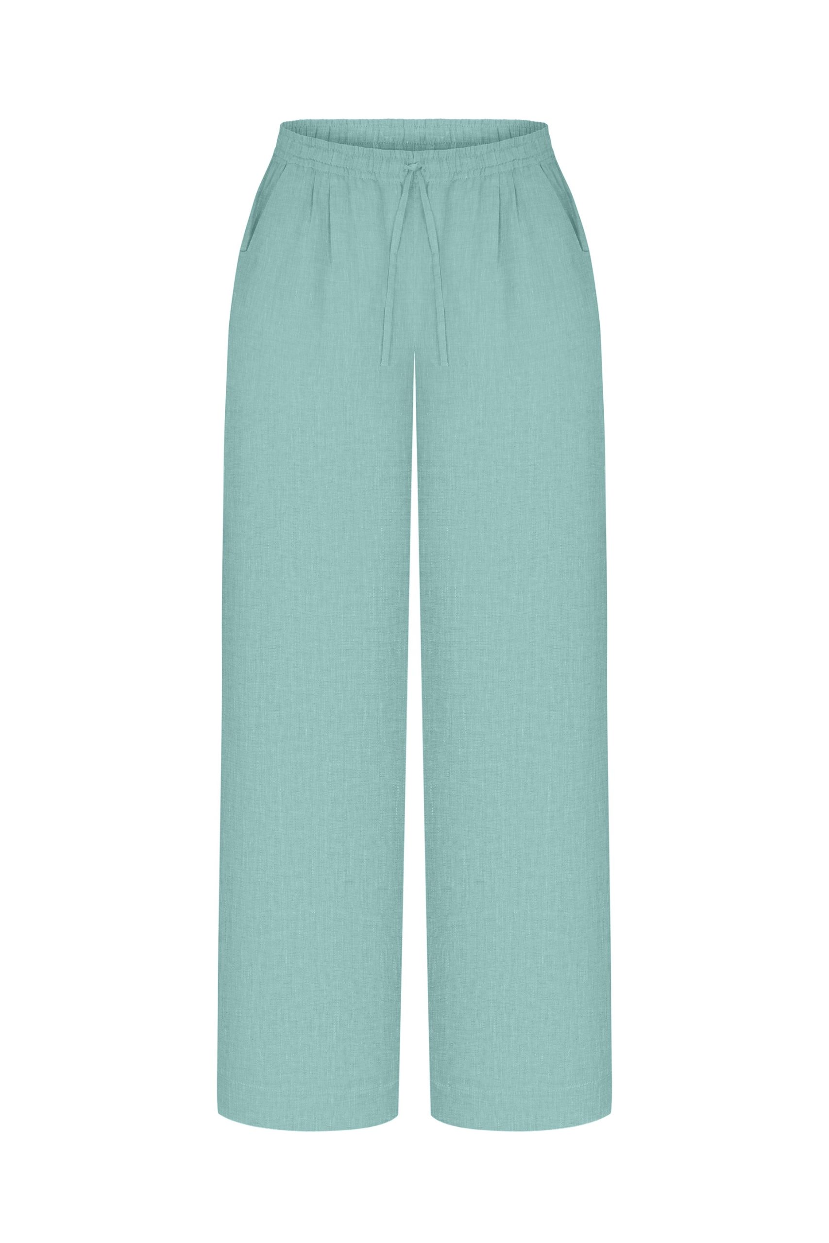 Штани широкі палаццо в підлогу на поясі-гумці та кулісою для затягування. Мають два защипи та дві кишені попереду.