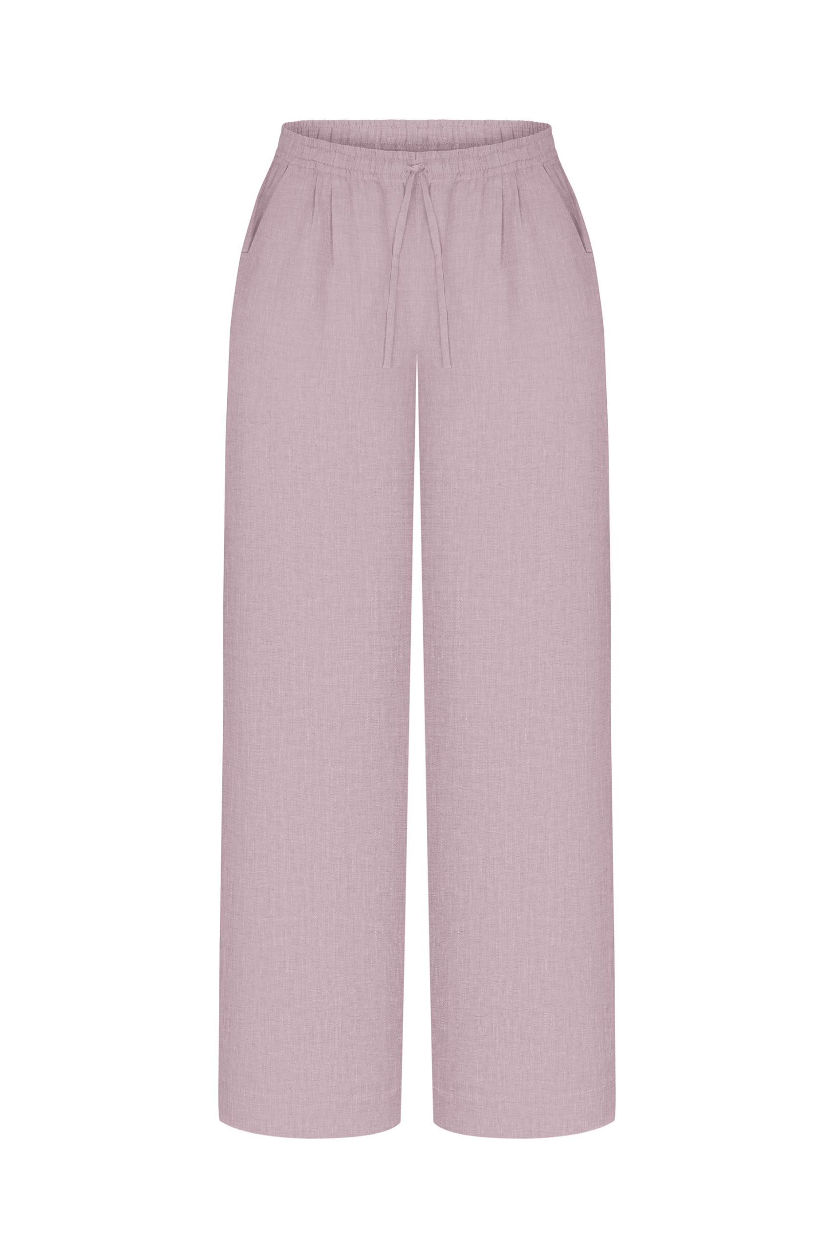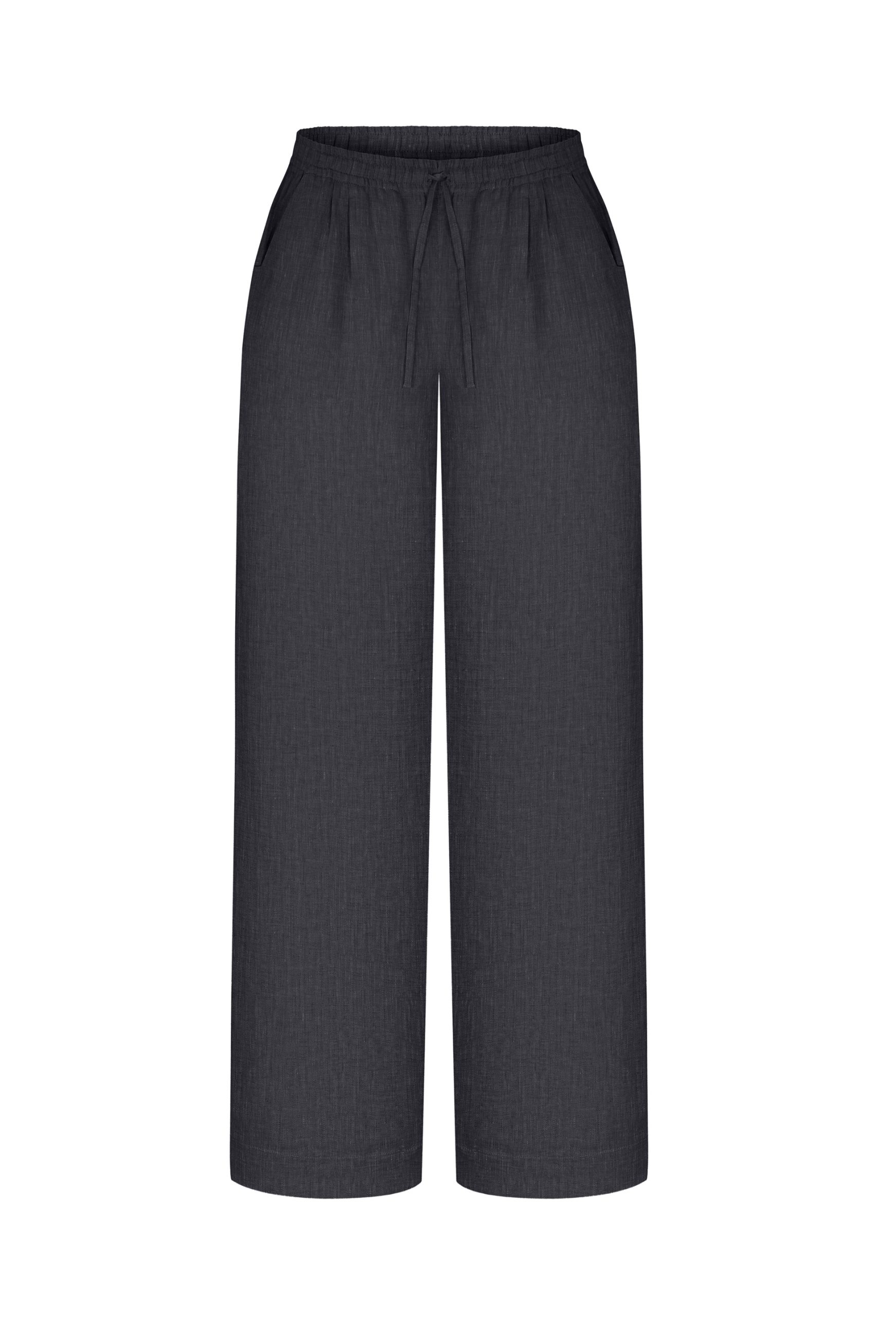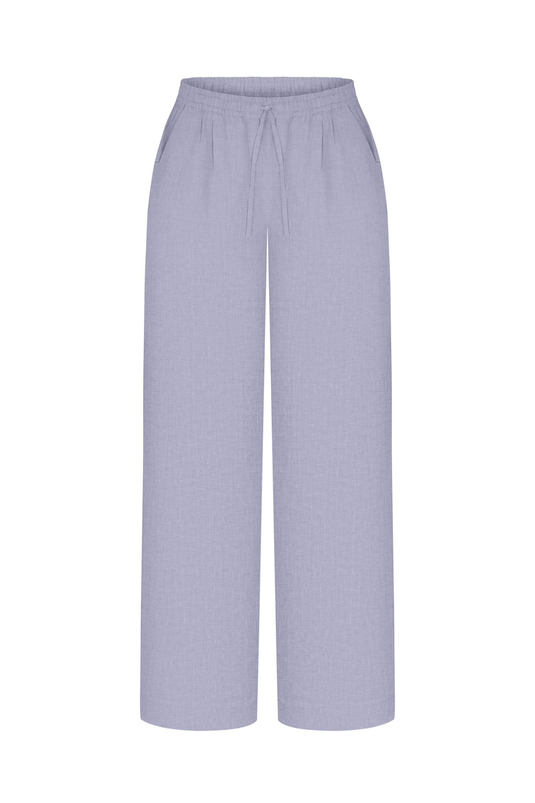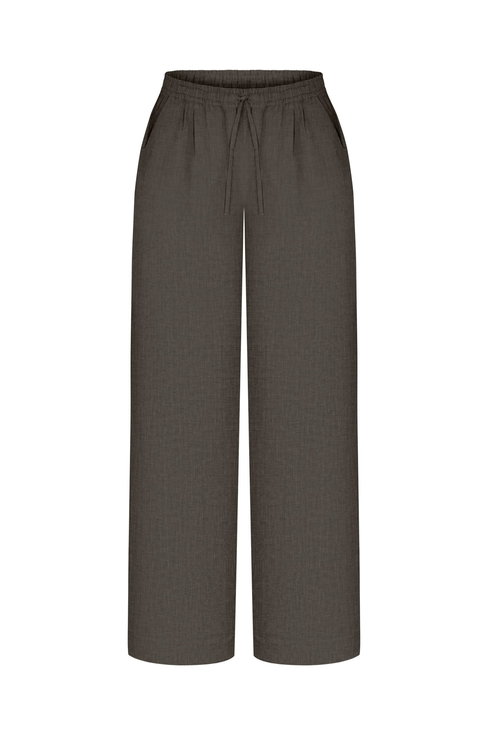 Штани широкі палаццо в підлогу на поясі-гумці та кулісою для затягування. Мають два защипи та дві кишені попереду.