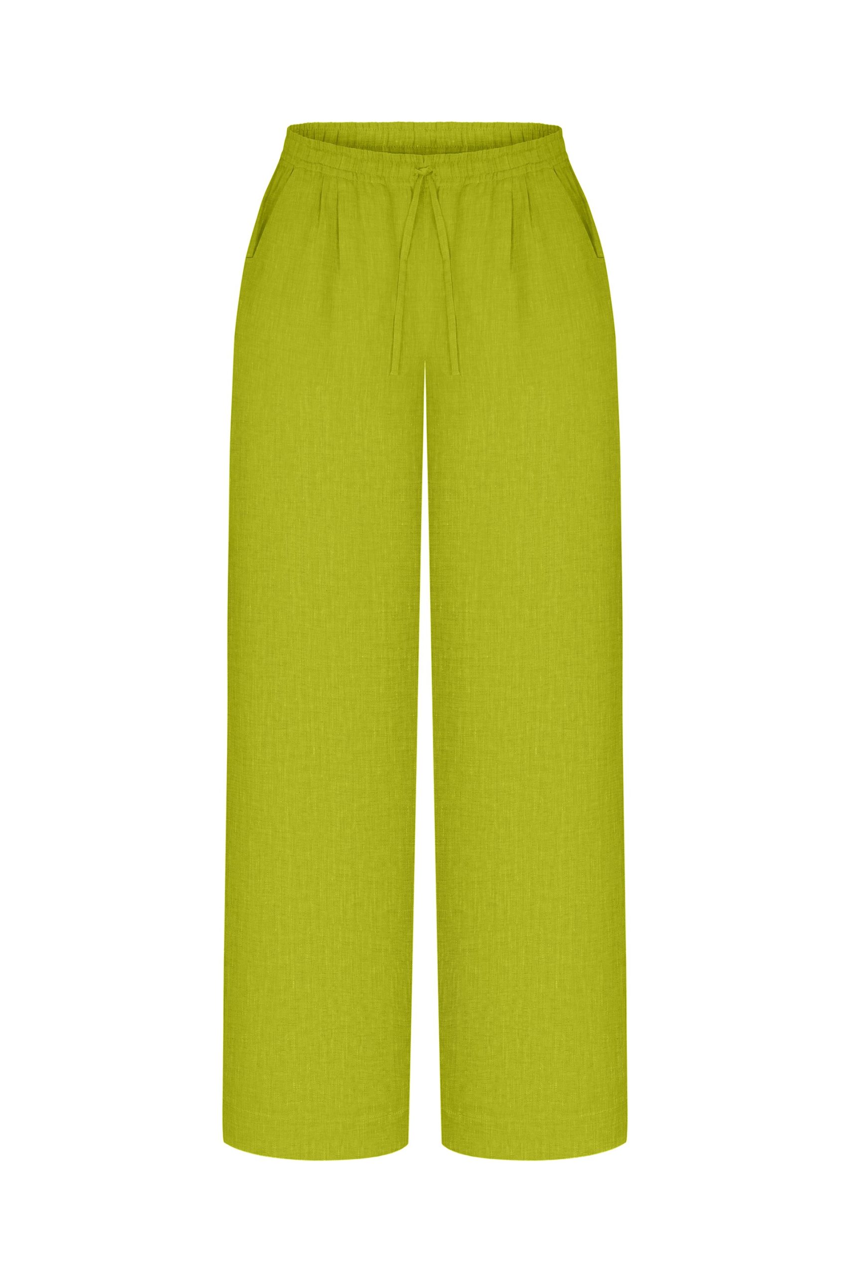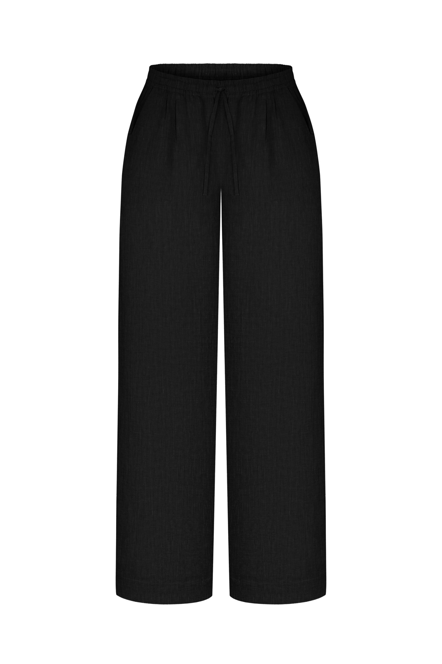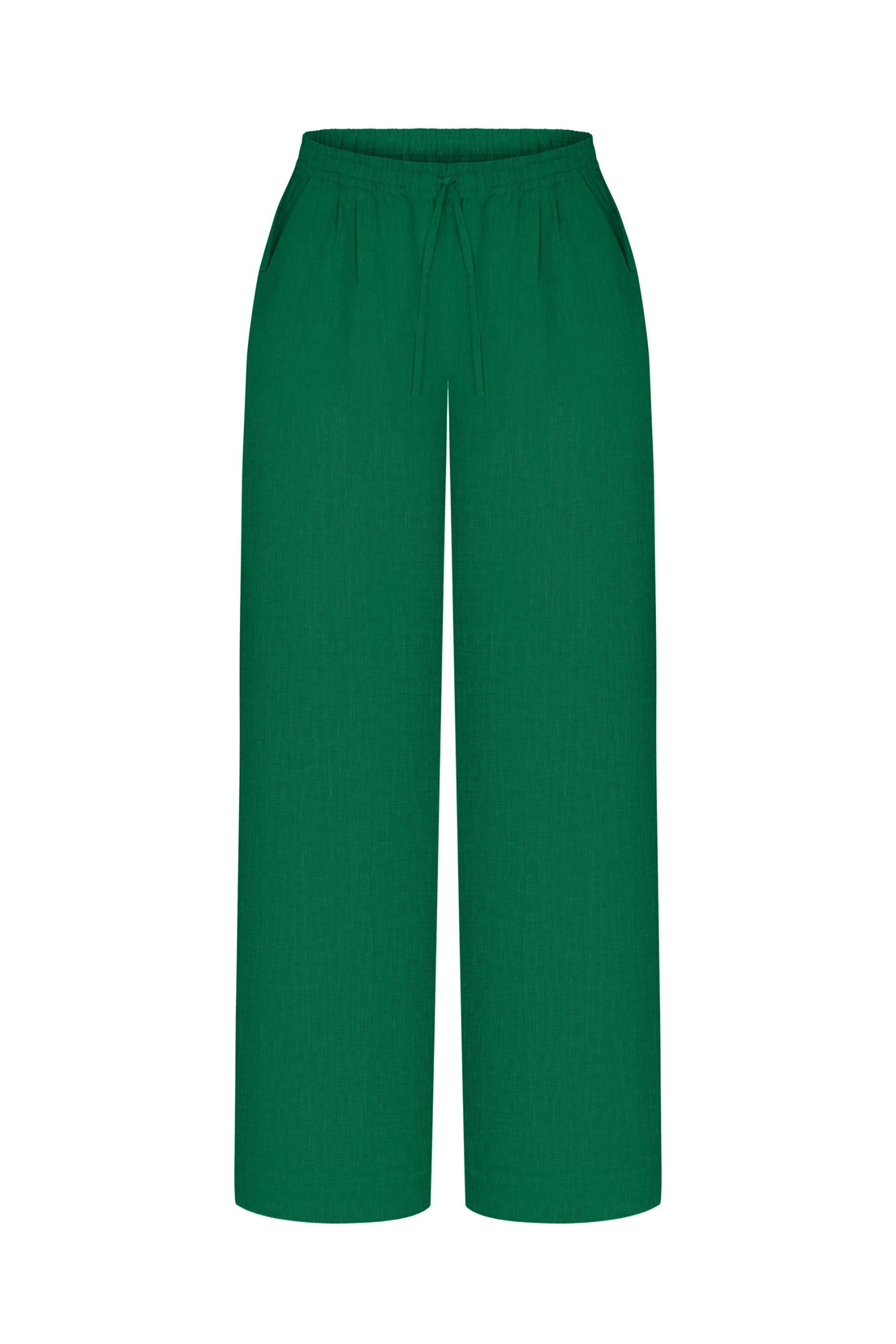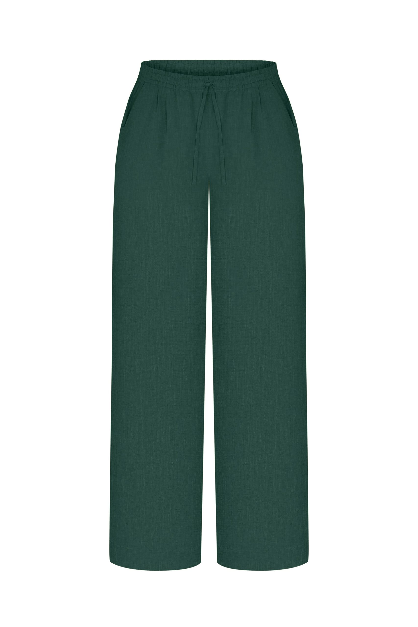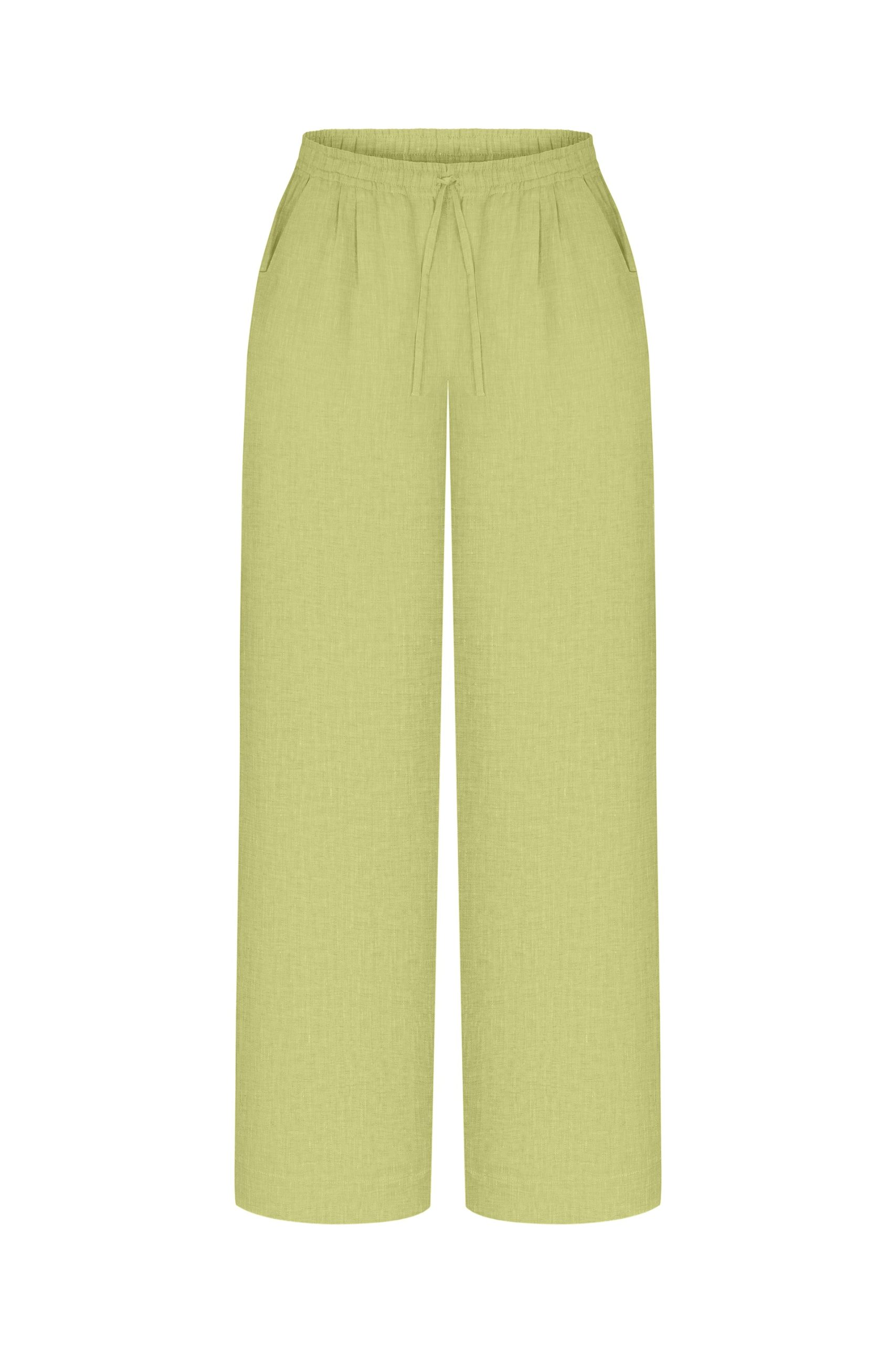 Штани широкі палаццо в підлогу на поясі-гумці та кулісою для затягування. Мають два защипи та дві кишені попереду.