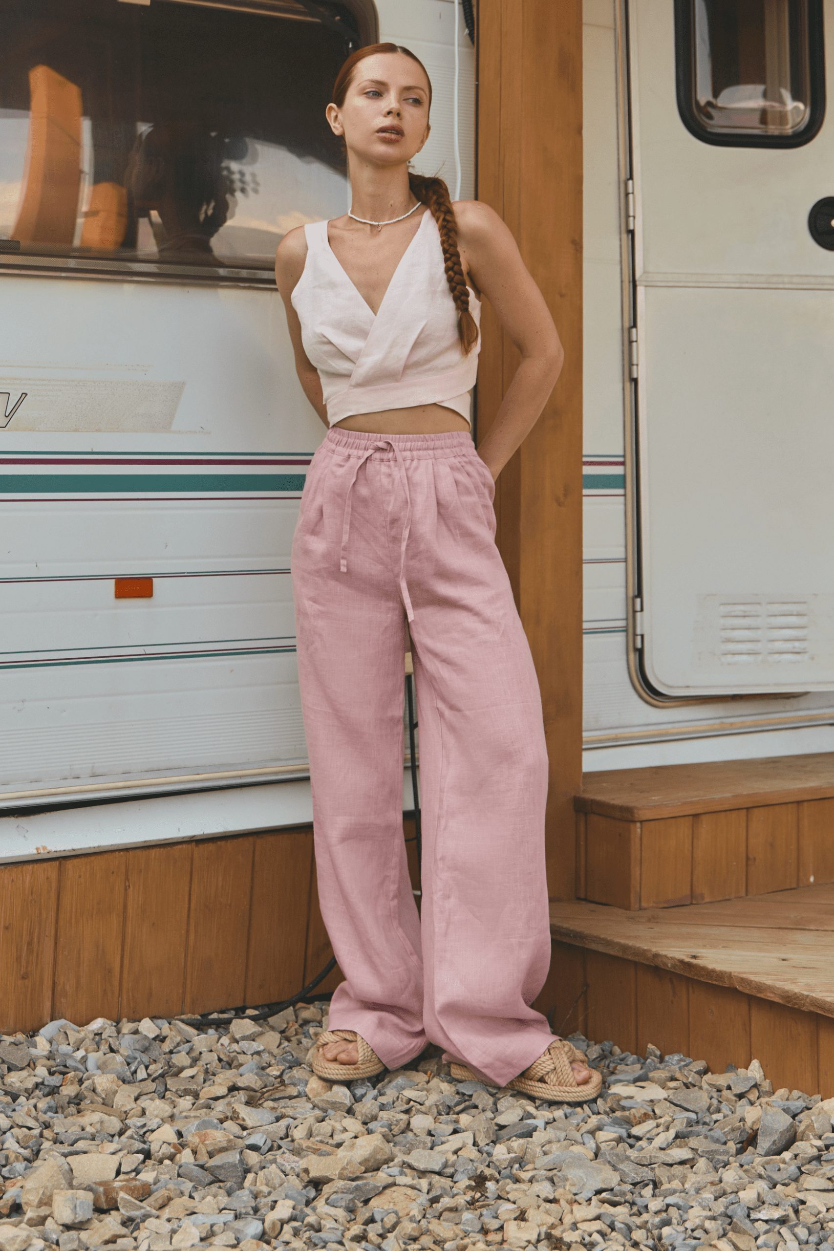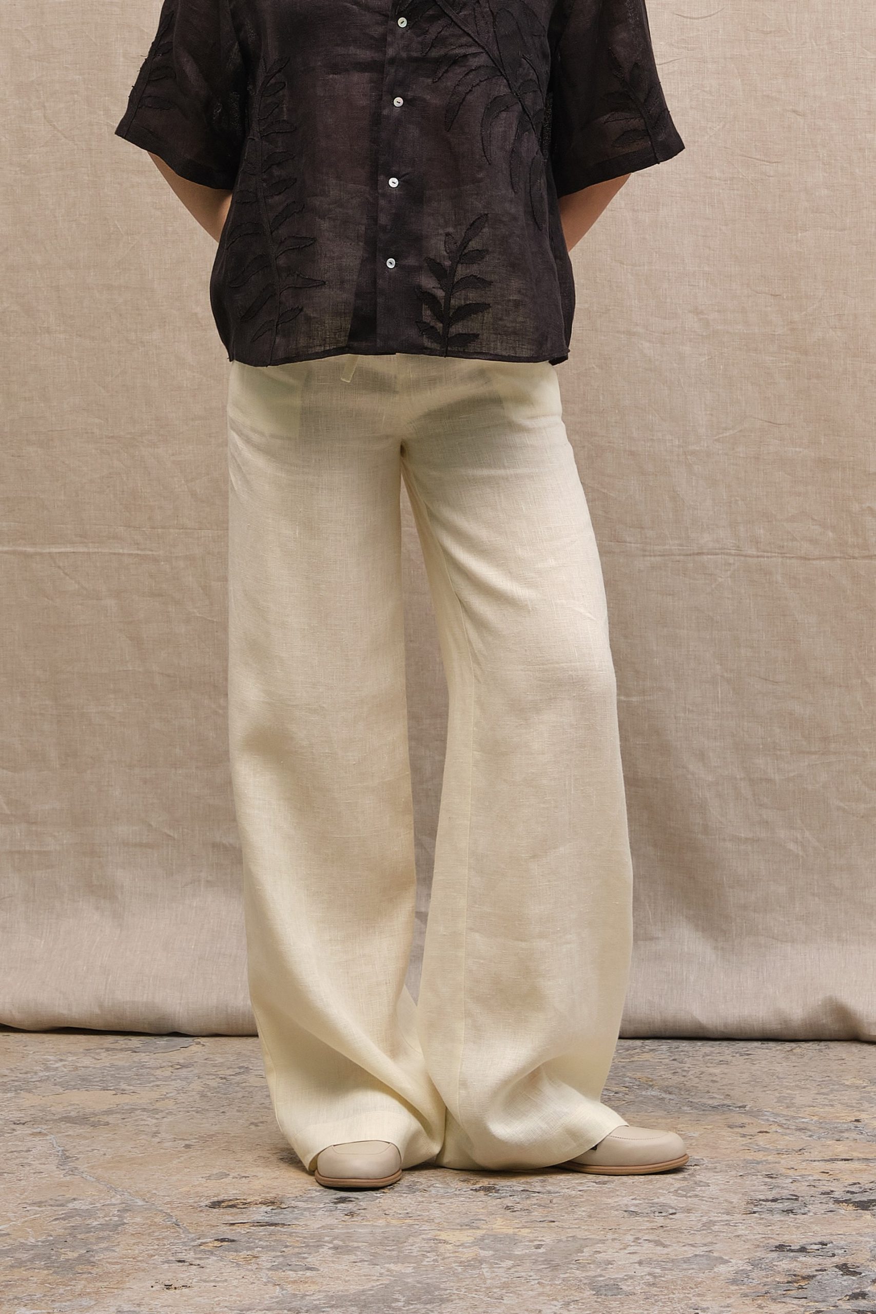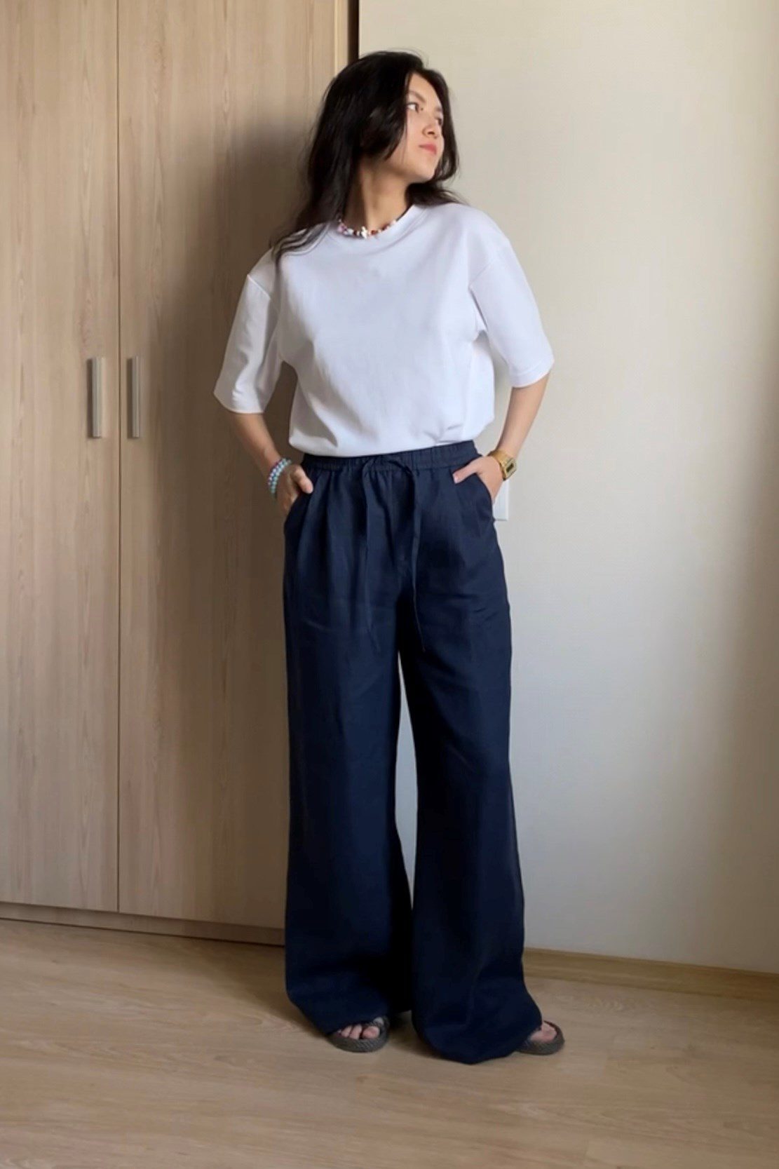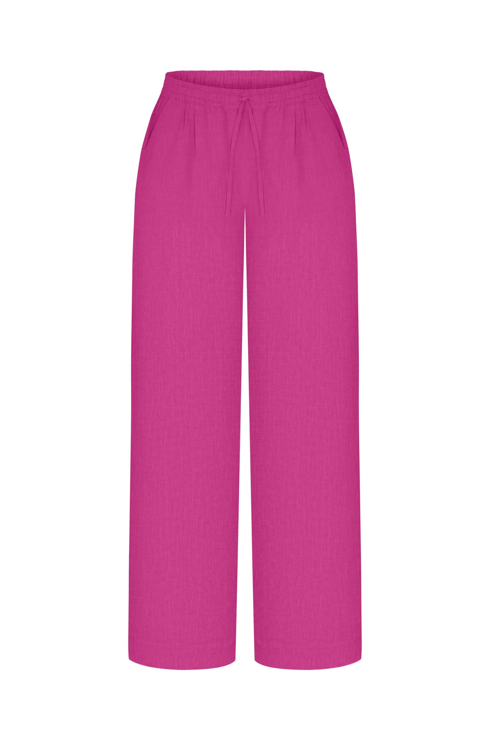 Штани широкі палаццо в підлогу на поясі-гумці та кулісою для затягування. Мають два защипи та дві кишені попереду.