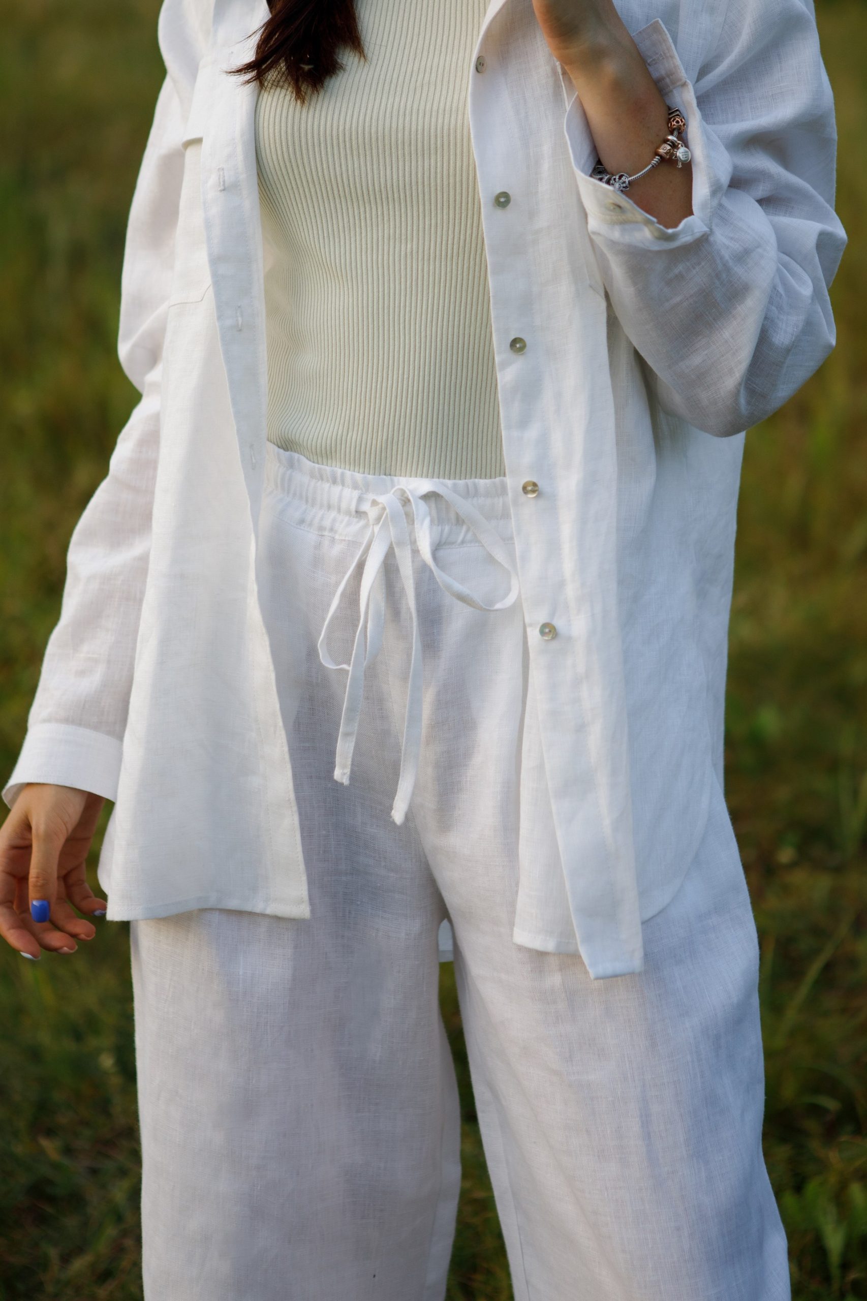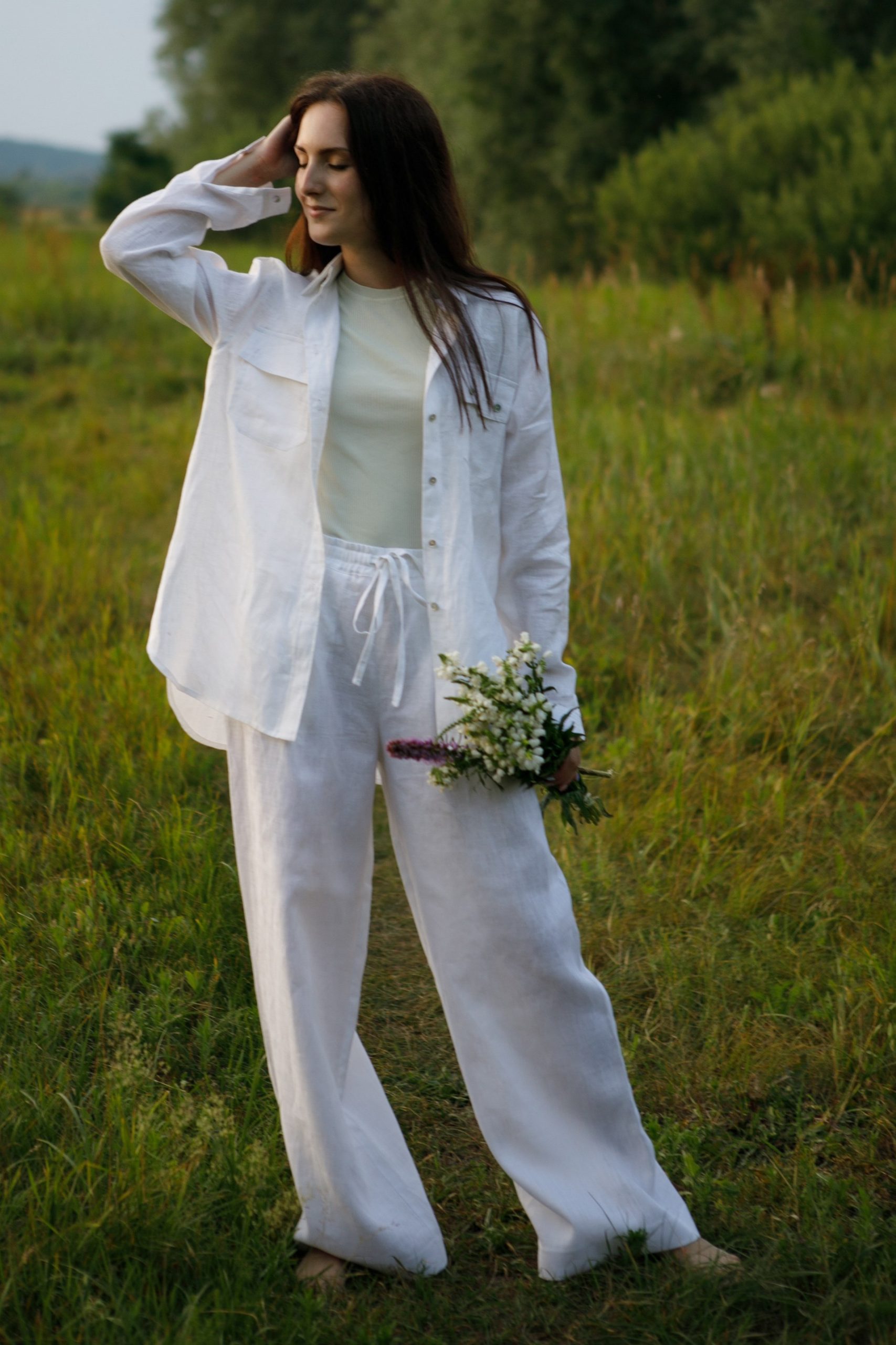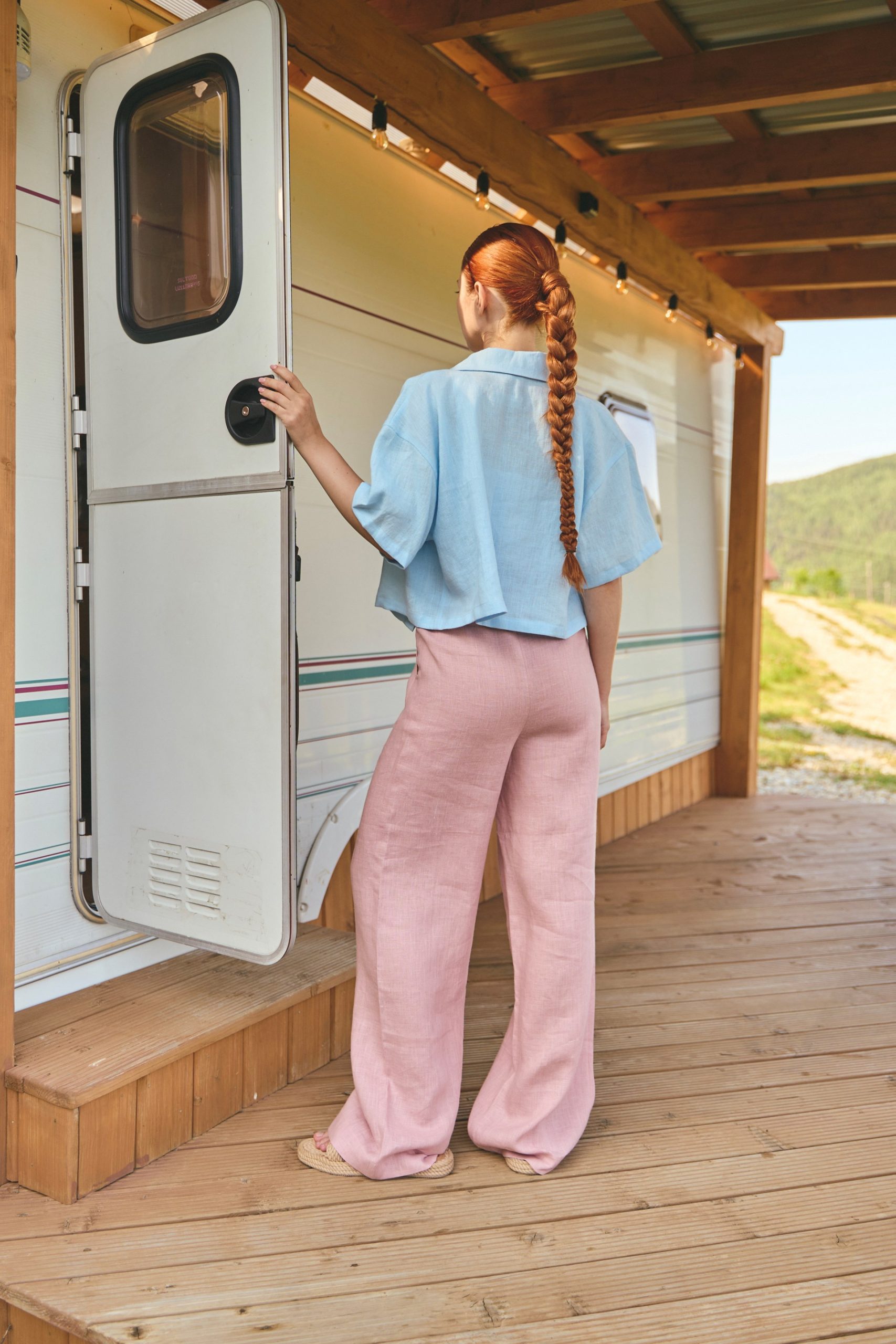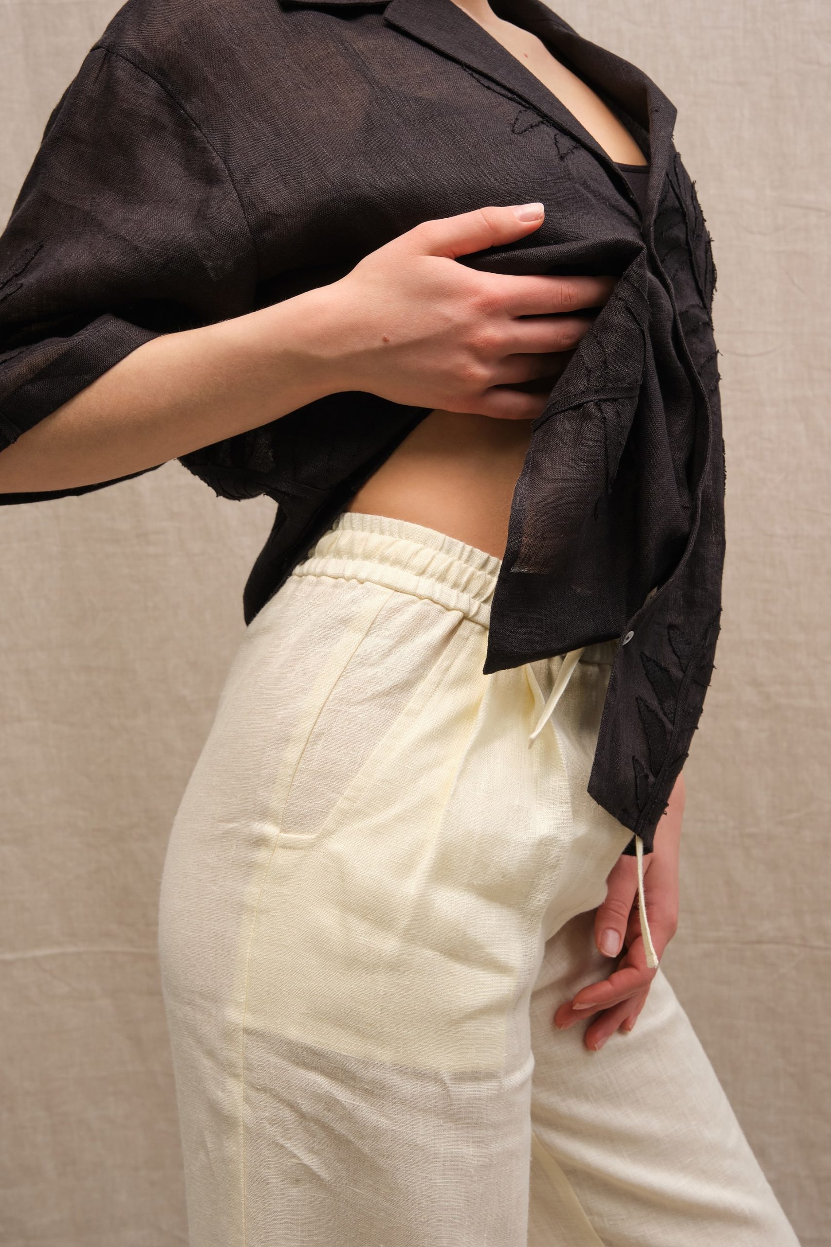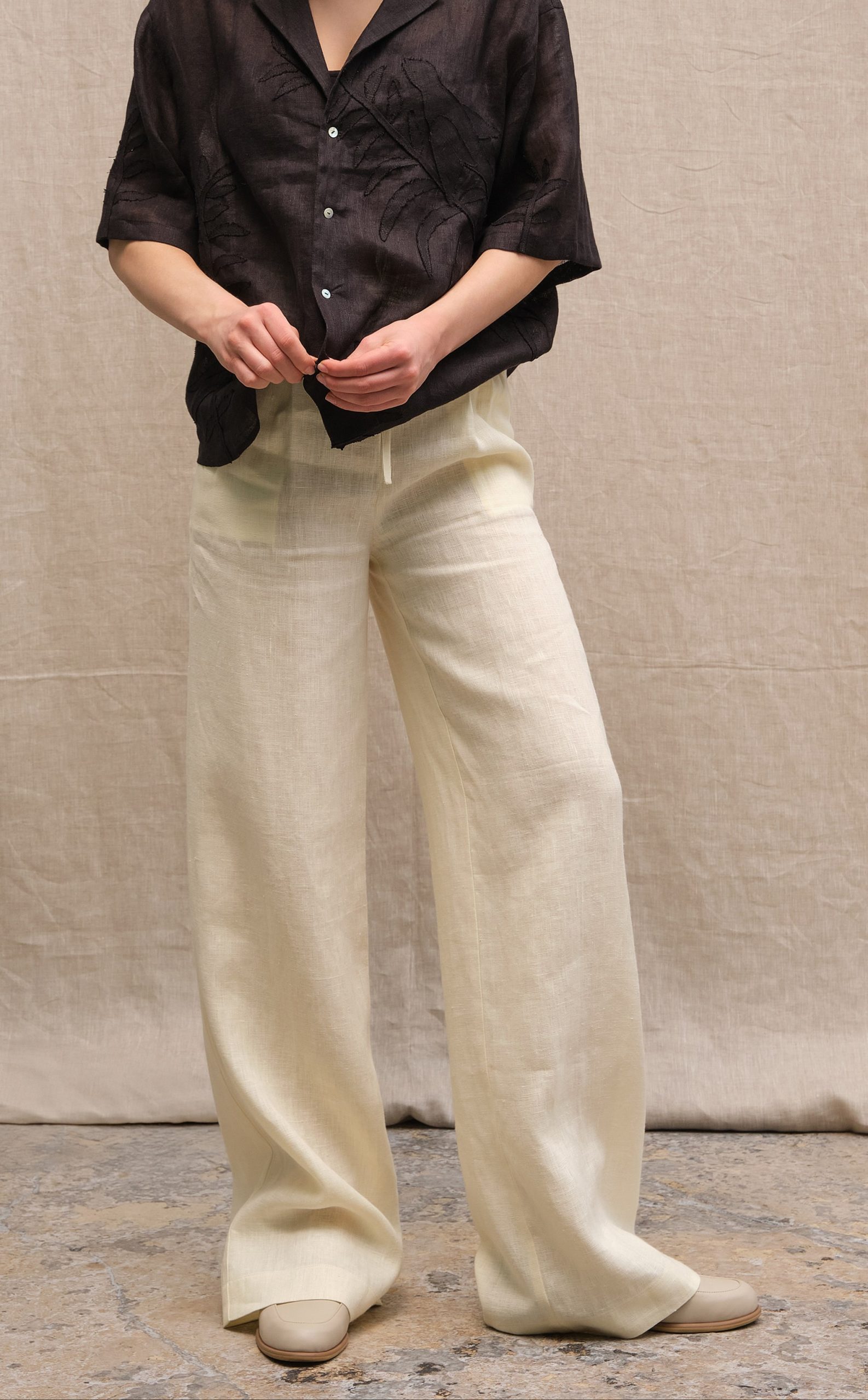 Штани широкі палаццо в підлогу на поясі-гумці та кулісою для затягування. Мають два защипи та дві кишені попереду.