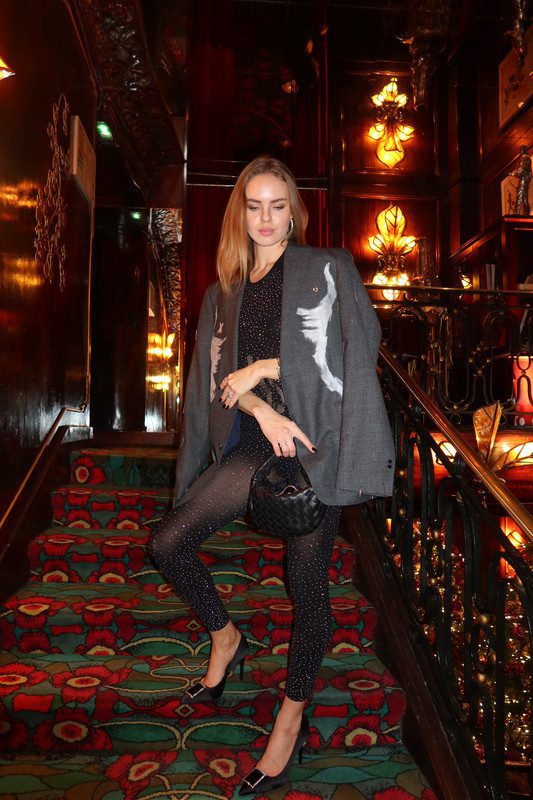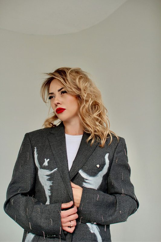 Сірий піджак вільного крою оздоблений пришивними деталями на рукавах та ручним малюнком кольору металік