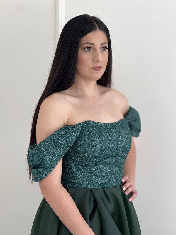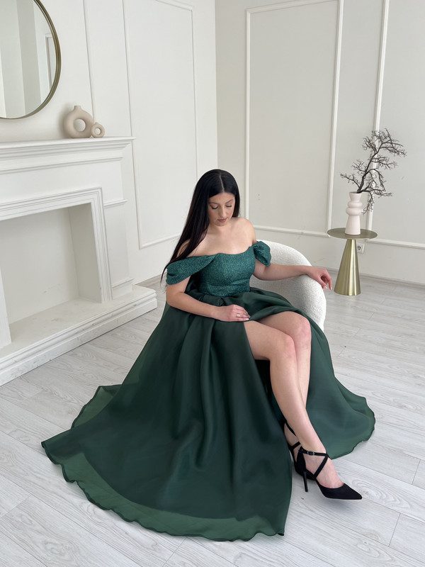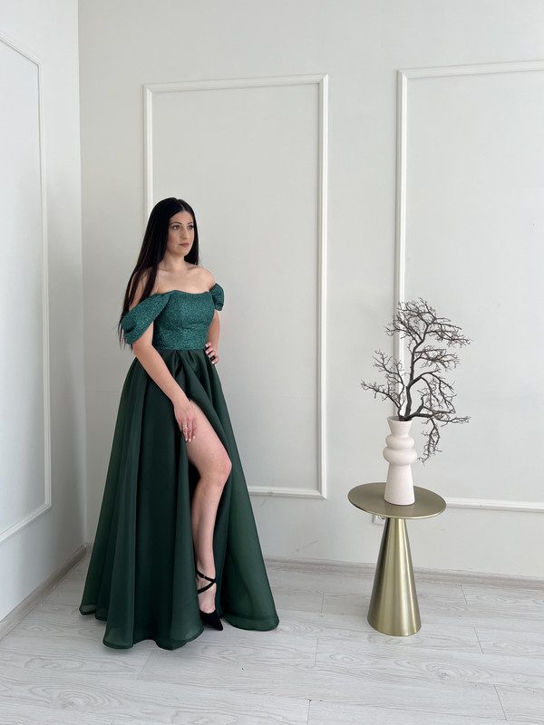 на суцільному корсеті з глітером, зі спушеними рукавами. Елегантна максі спідничка з розрізом, яка спадає м’якими складками. Ззаду корсет зі шнуруванням.