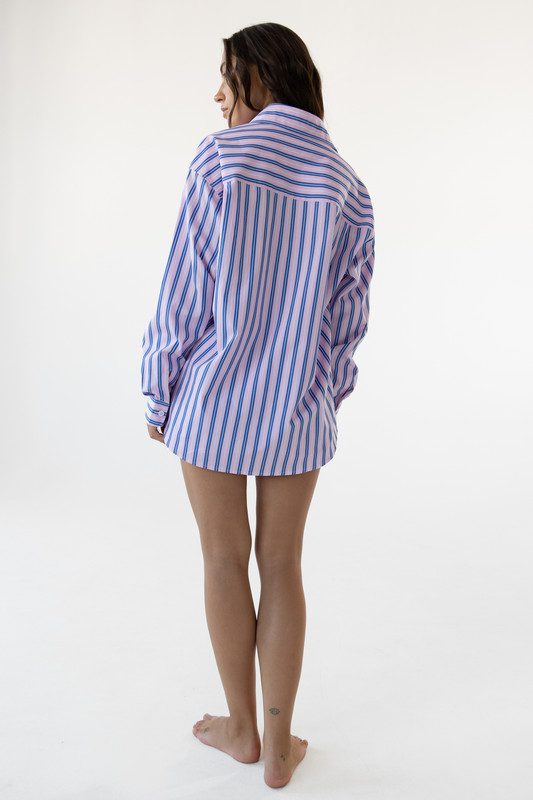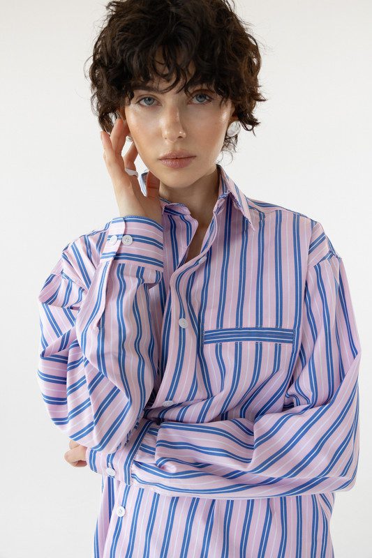 Ця сорочка — про ніжність і впевненість водночас. Легке поєднання рожевих та голубих смуг створює грайливий, але вишуканий образ. Виготовлена з 100% італійського бавовни, вона дарує відчуття легкості на шкірі й виглядає бездоганно навіть у спекотний день.