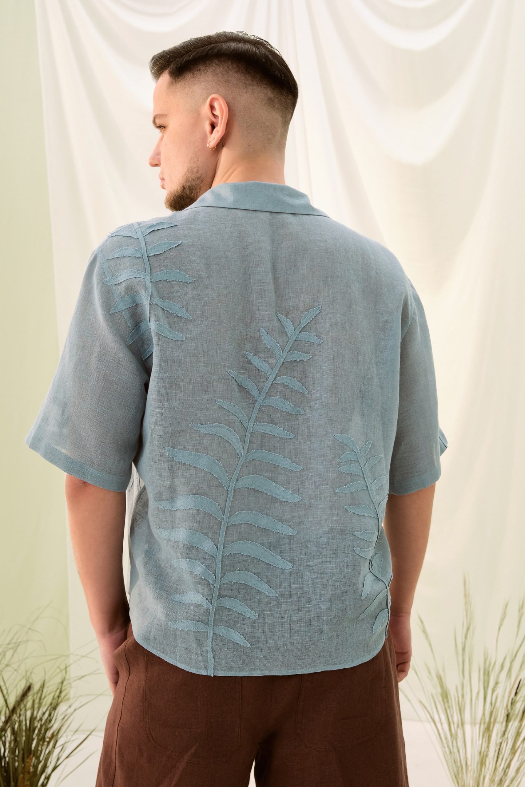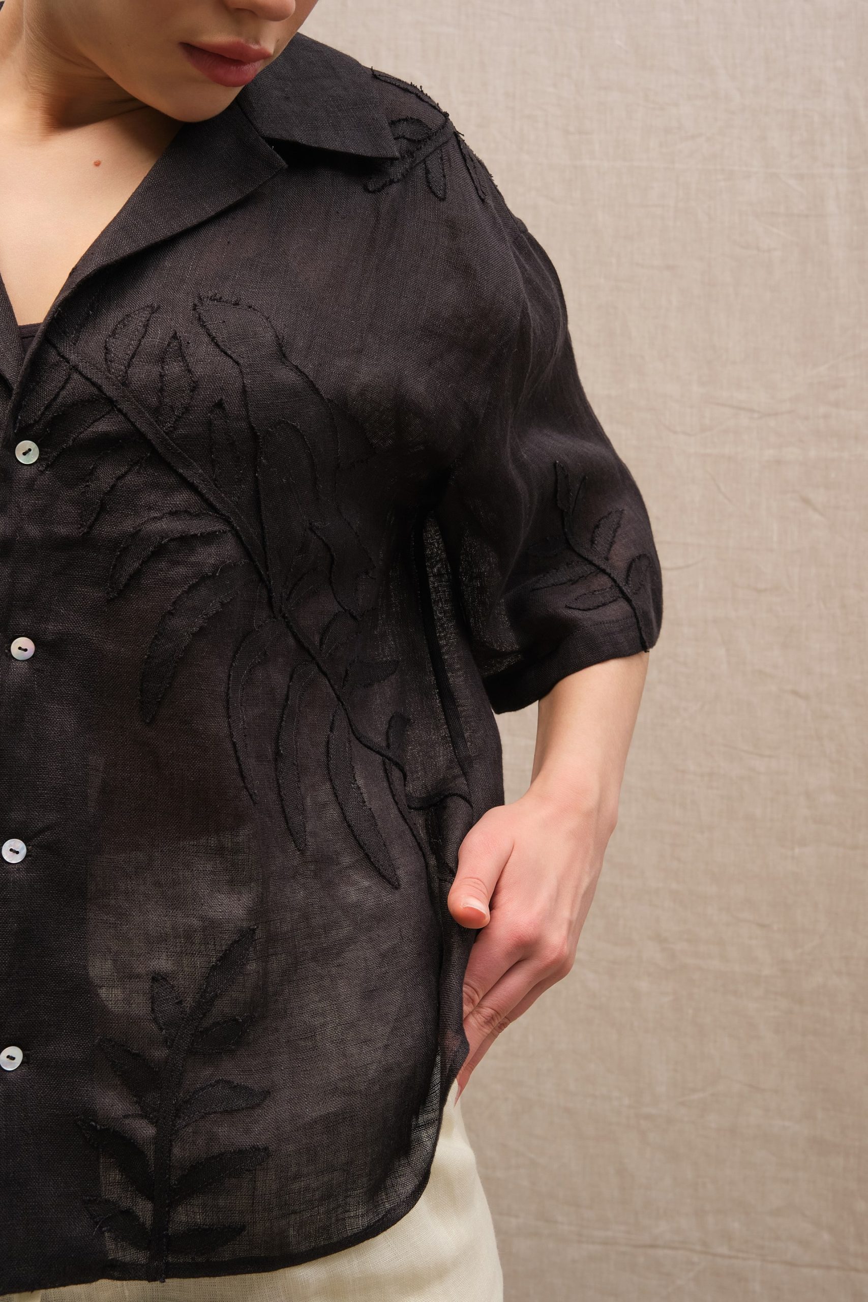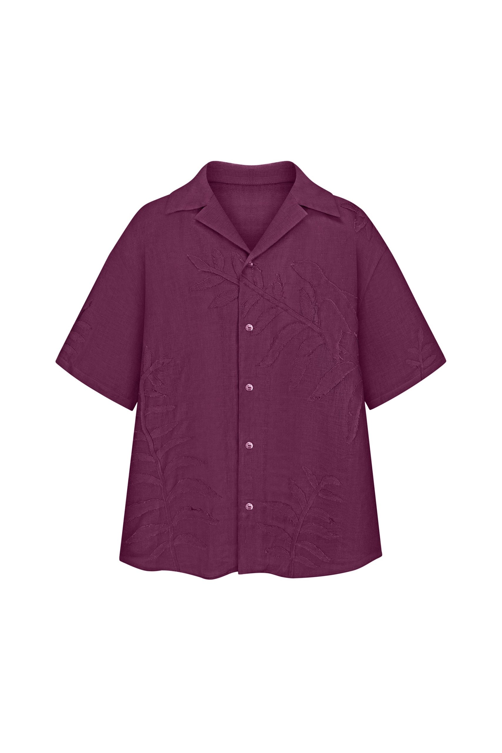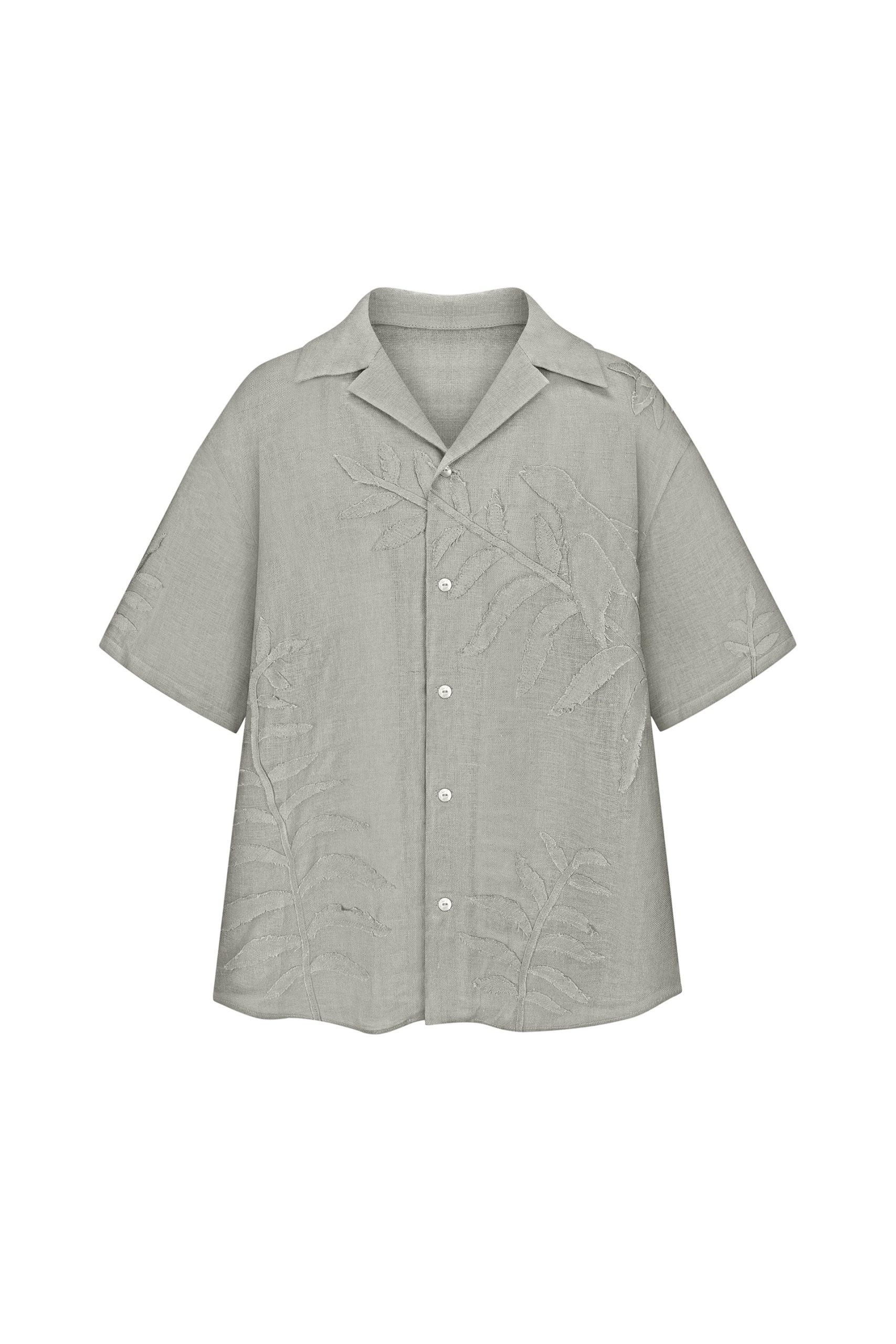 Сорочка з коротким рукавом вільного крою з відкладним коміром. Виконана з тоненького льону вуаль, сорочка оздоблена вручну зробленою аплікацією листям папороті та зозулею зліва попереду.