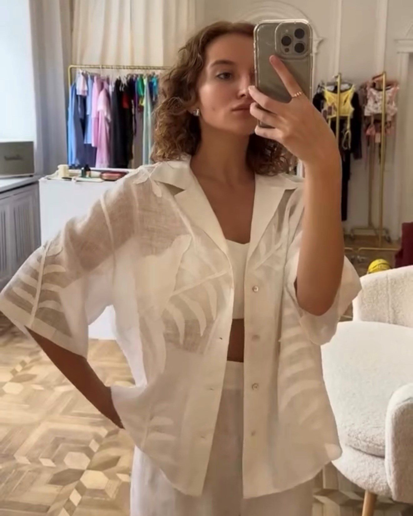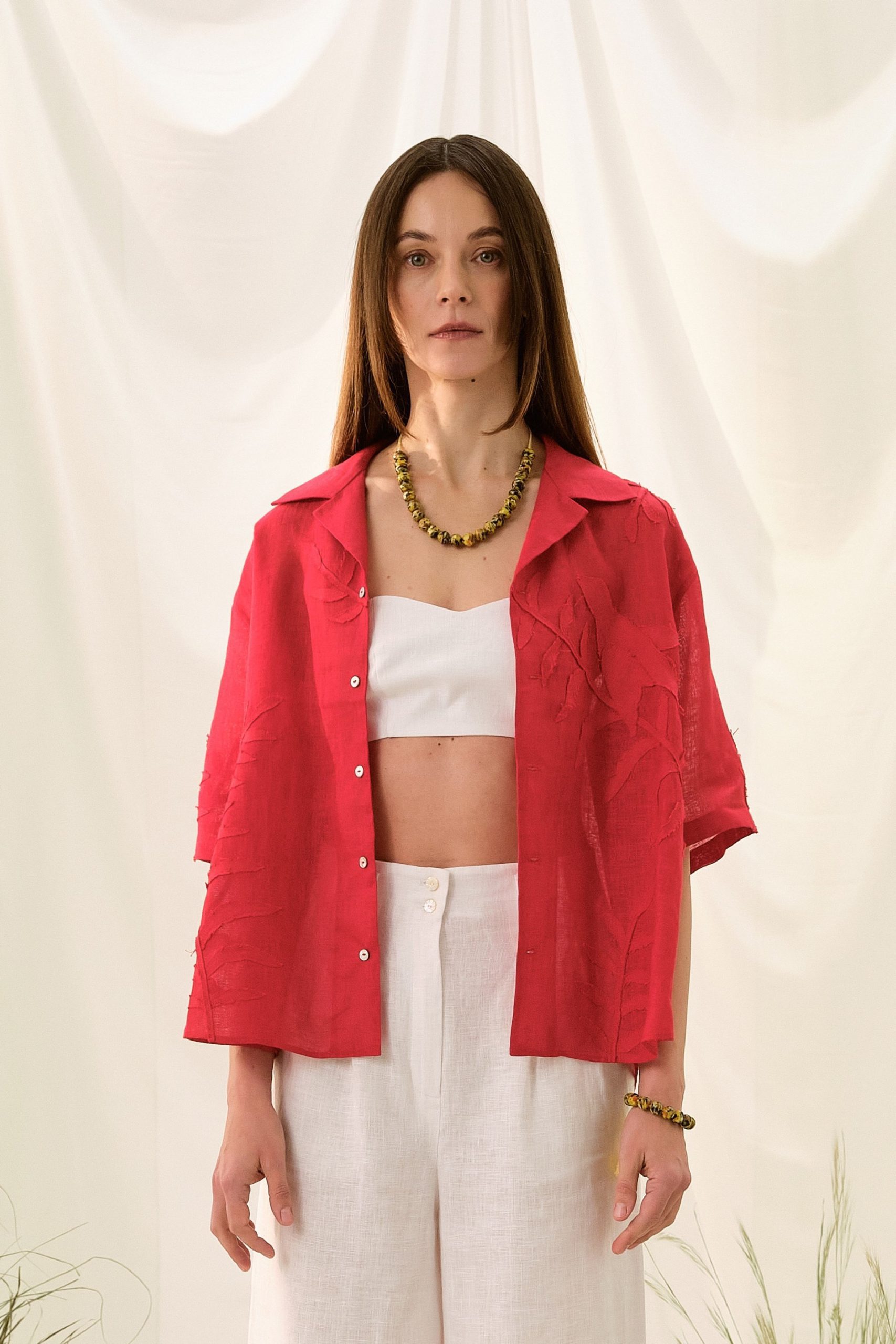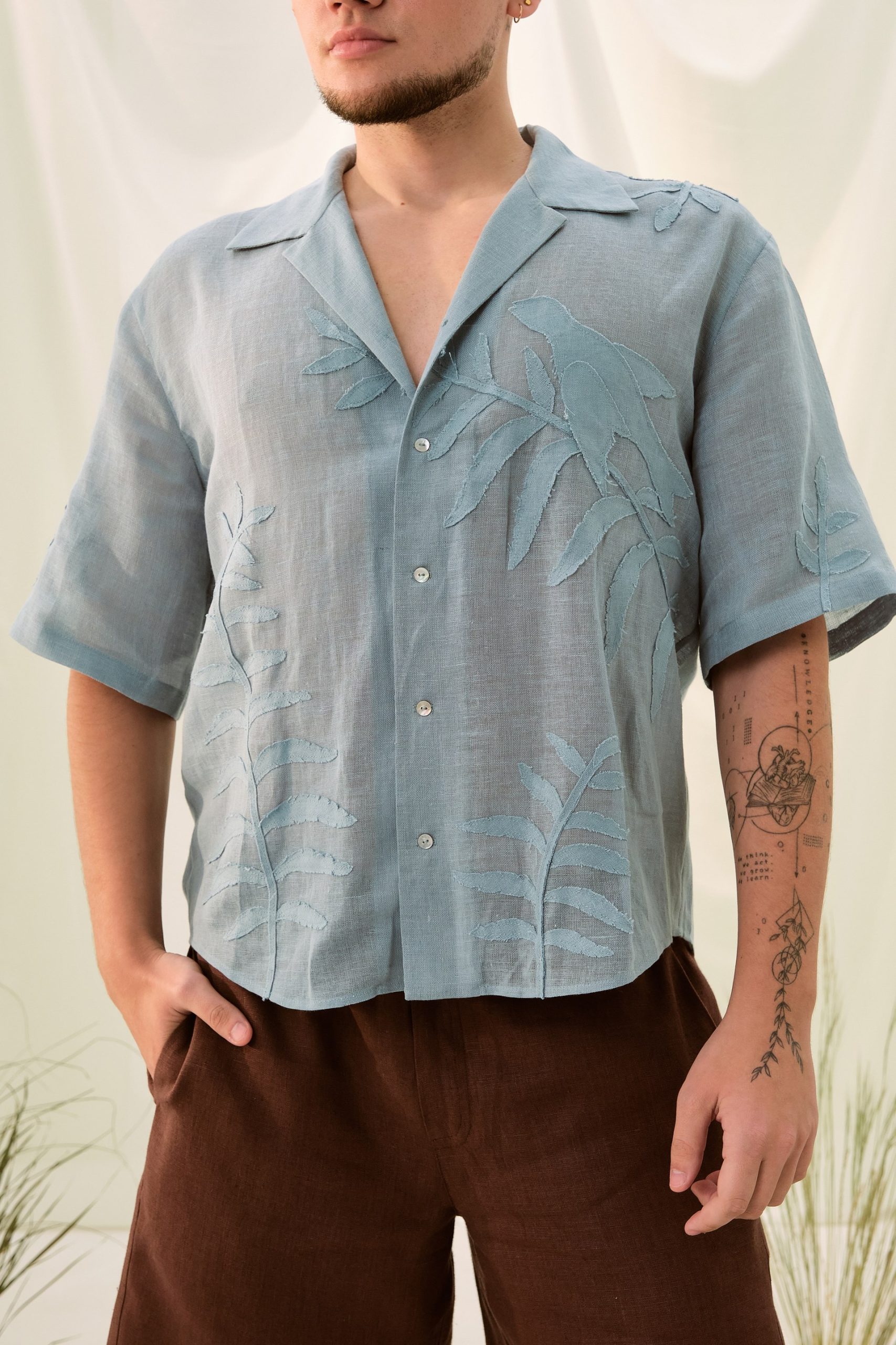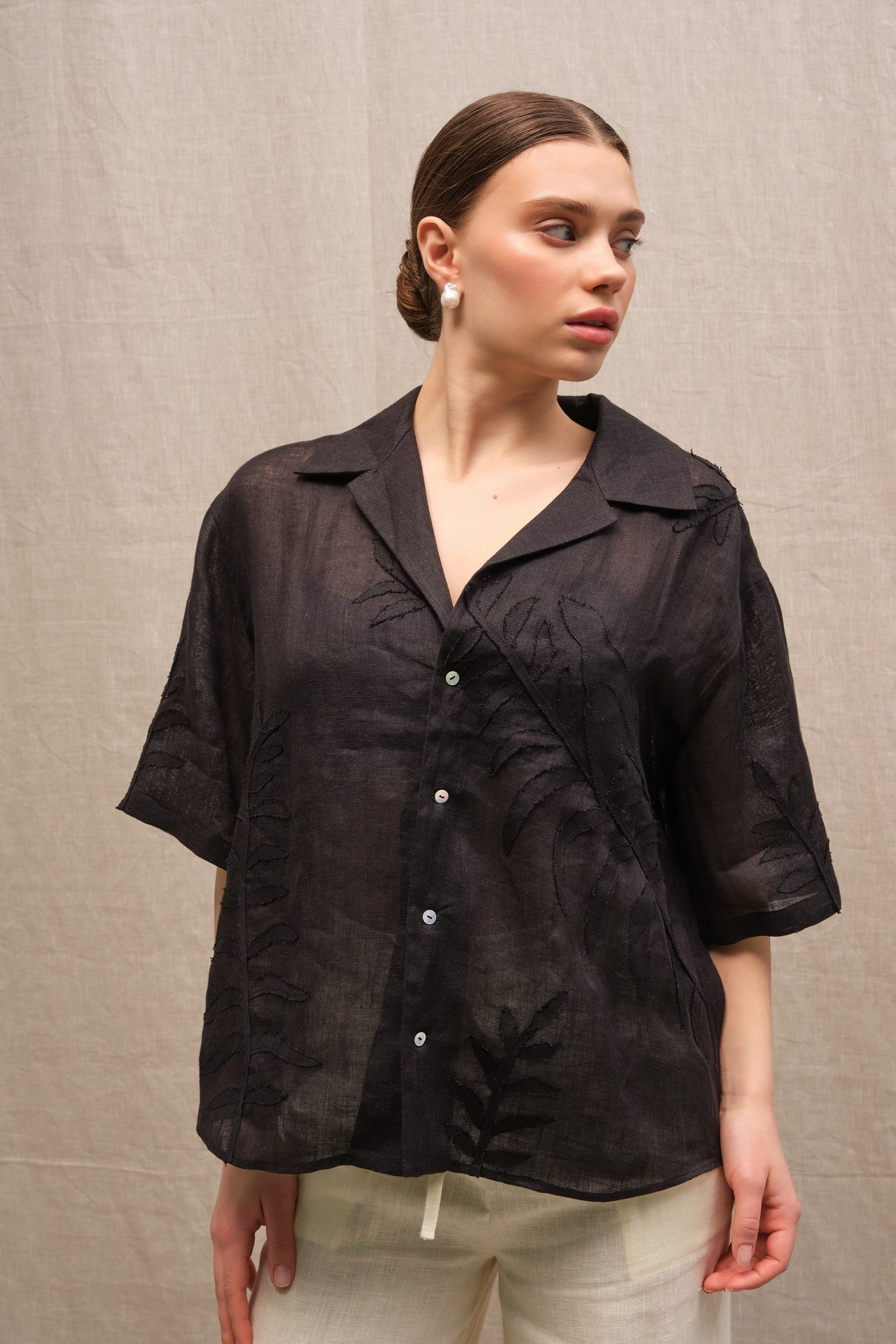 Сорочка з коротким рукавом вільного крою з відкладним коміром. Виконана з тоненького льону вуаль, сорочка оздоблена вручну зробленою аплікацією листям папороті та зозулею зліва попереду.
