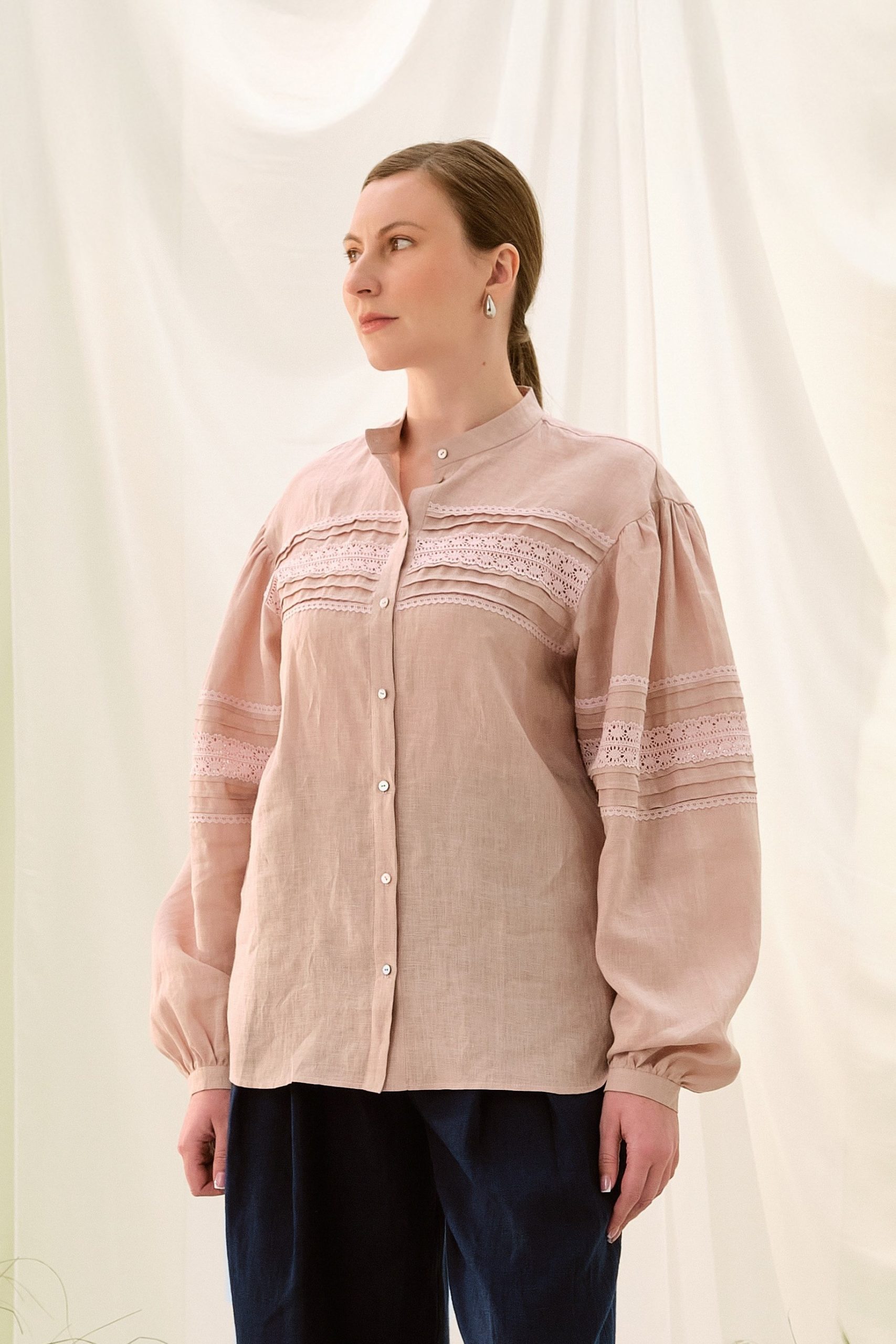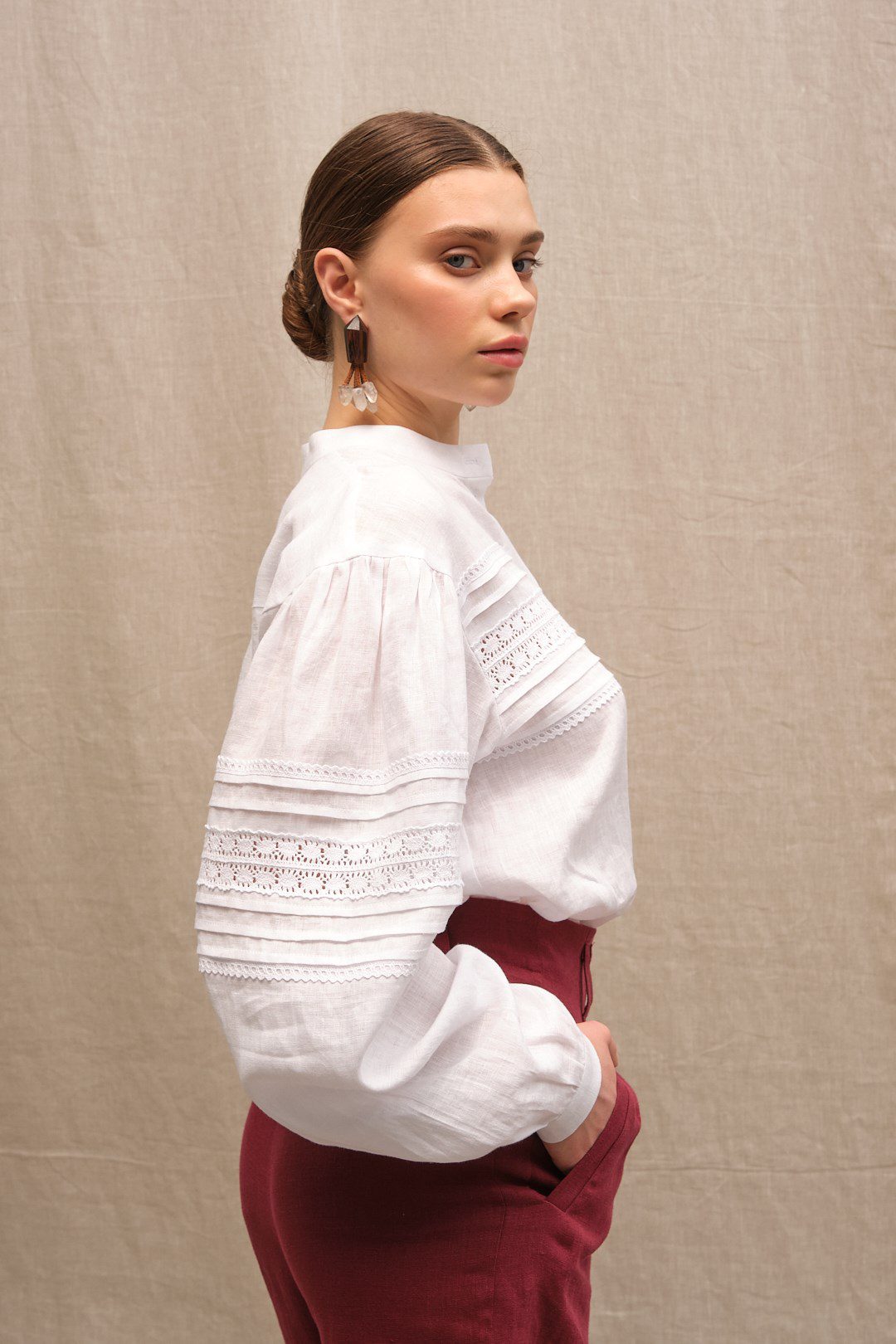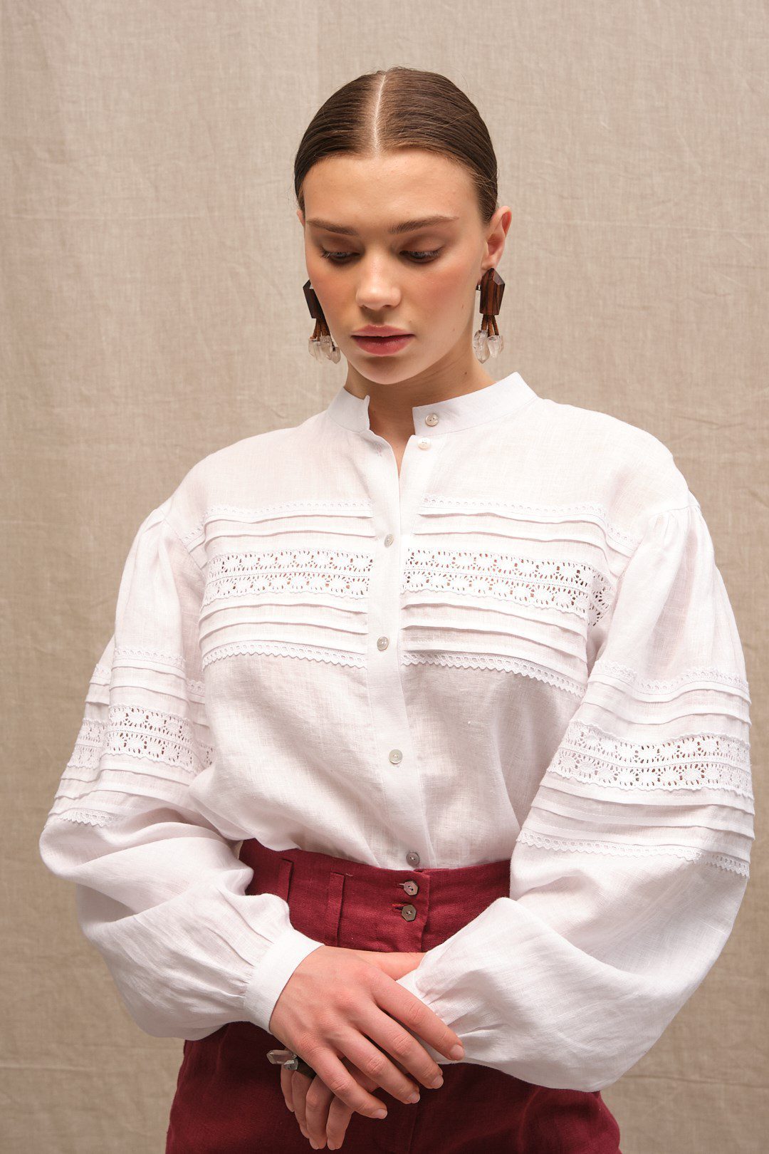 Cорочка вільного крою з трохи спущеним плечем з пишними повітряними рукавам. Має комір стійку, вузькі манжети та застібку на ґудзики з мушлі. Оздоблена защипами та мереживом.