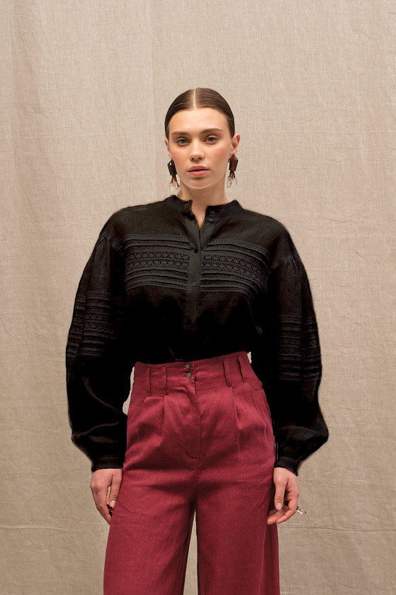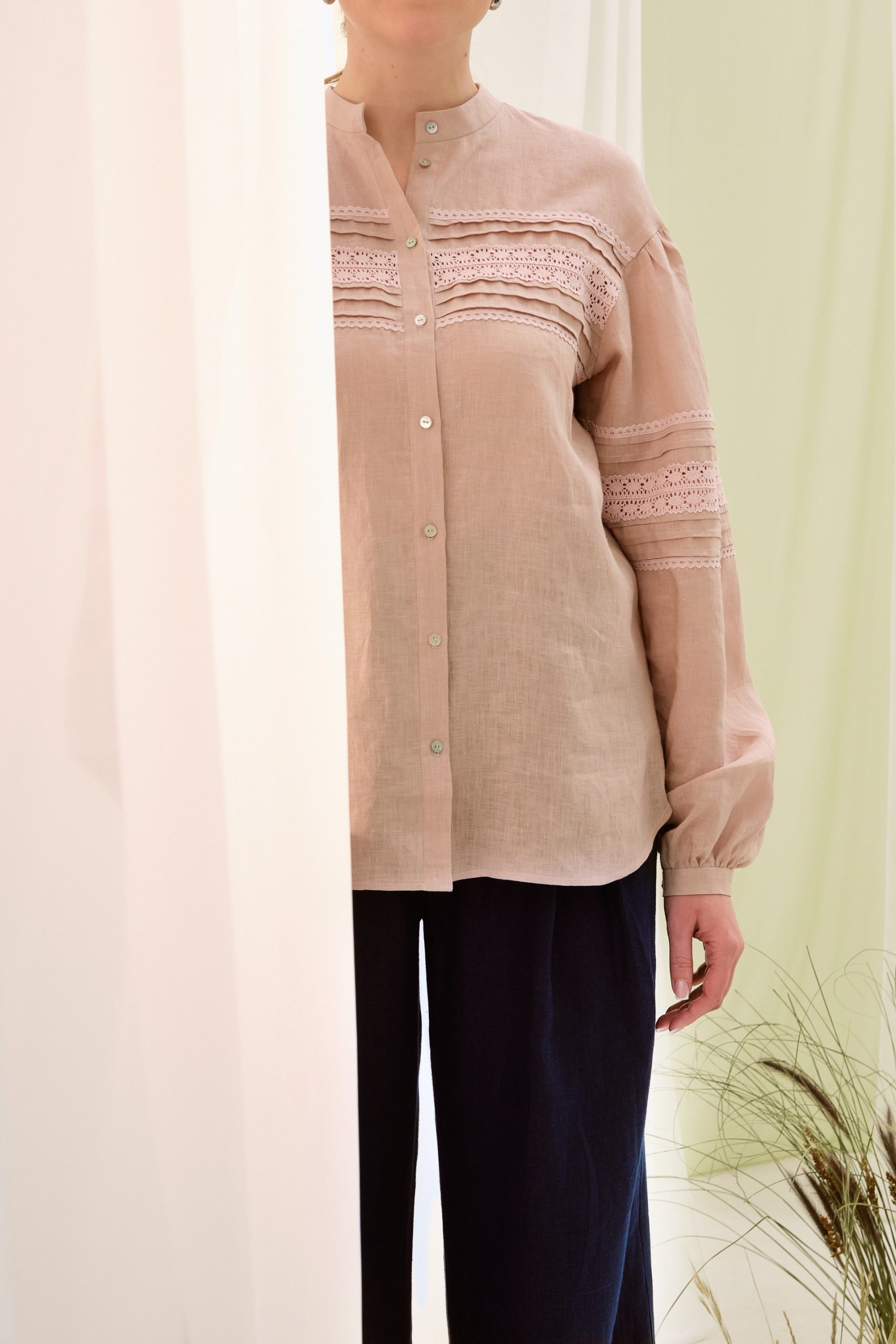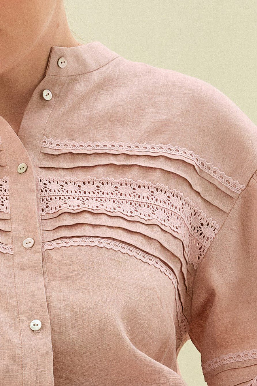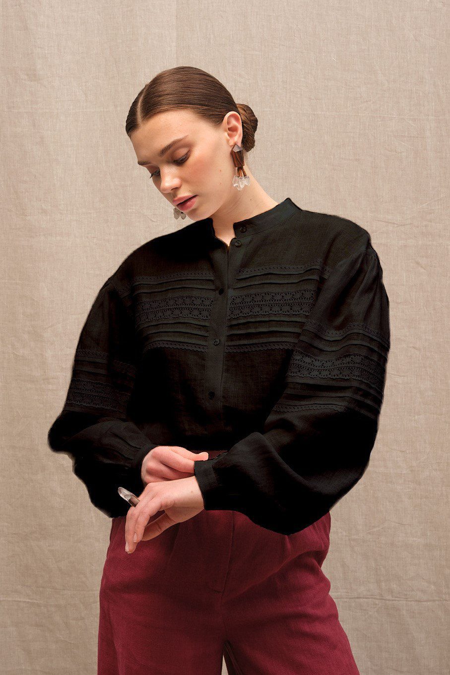 Cорочка вільного крою з трохи спущеним плечем з пишними повітряними рукавам. Має комір стійку, вузькі манжети та застібку на ґудзики з мушлі. Оздоблена защипами та мереживом.
