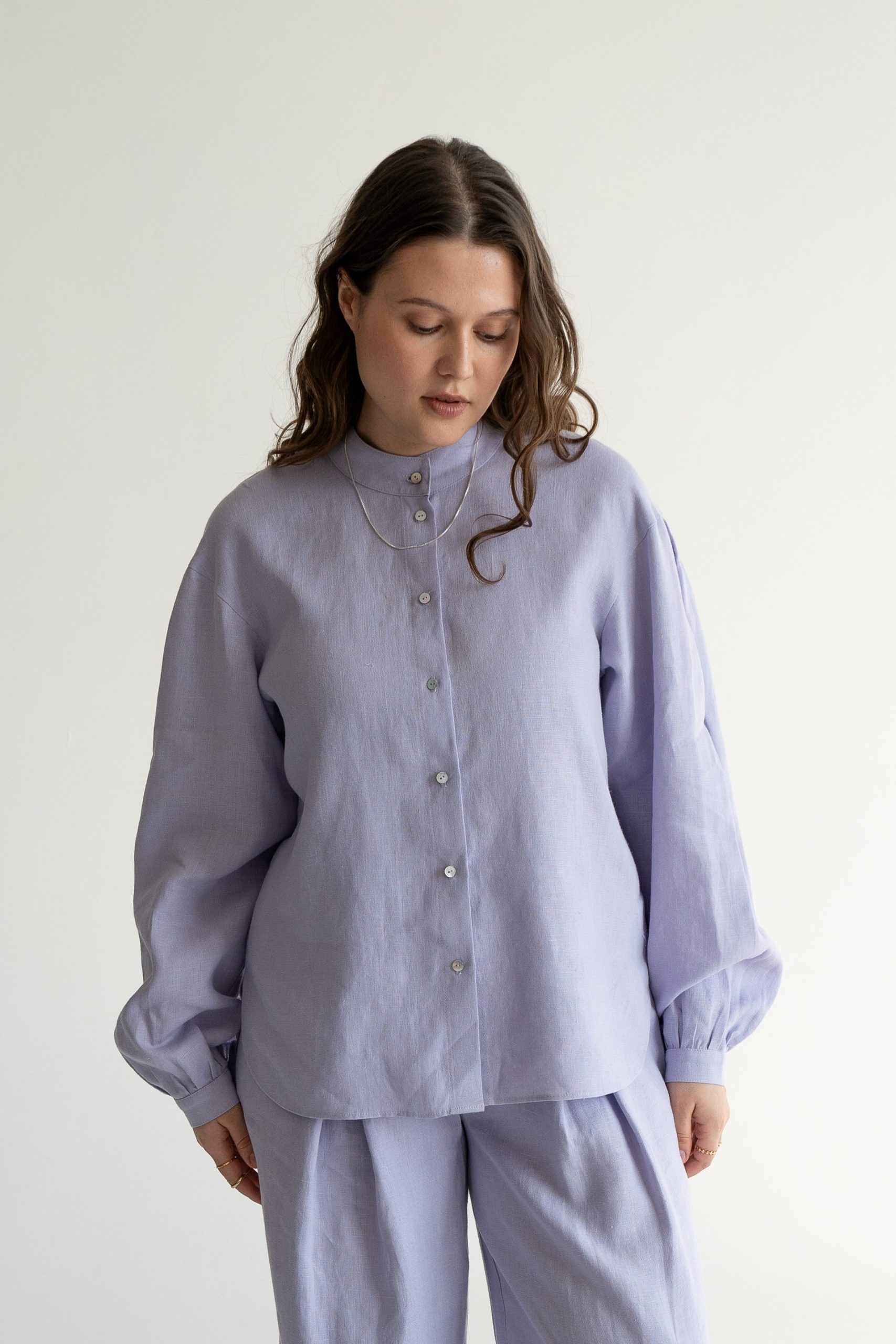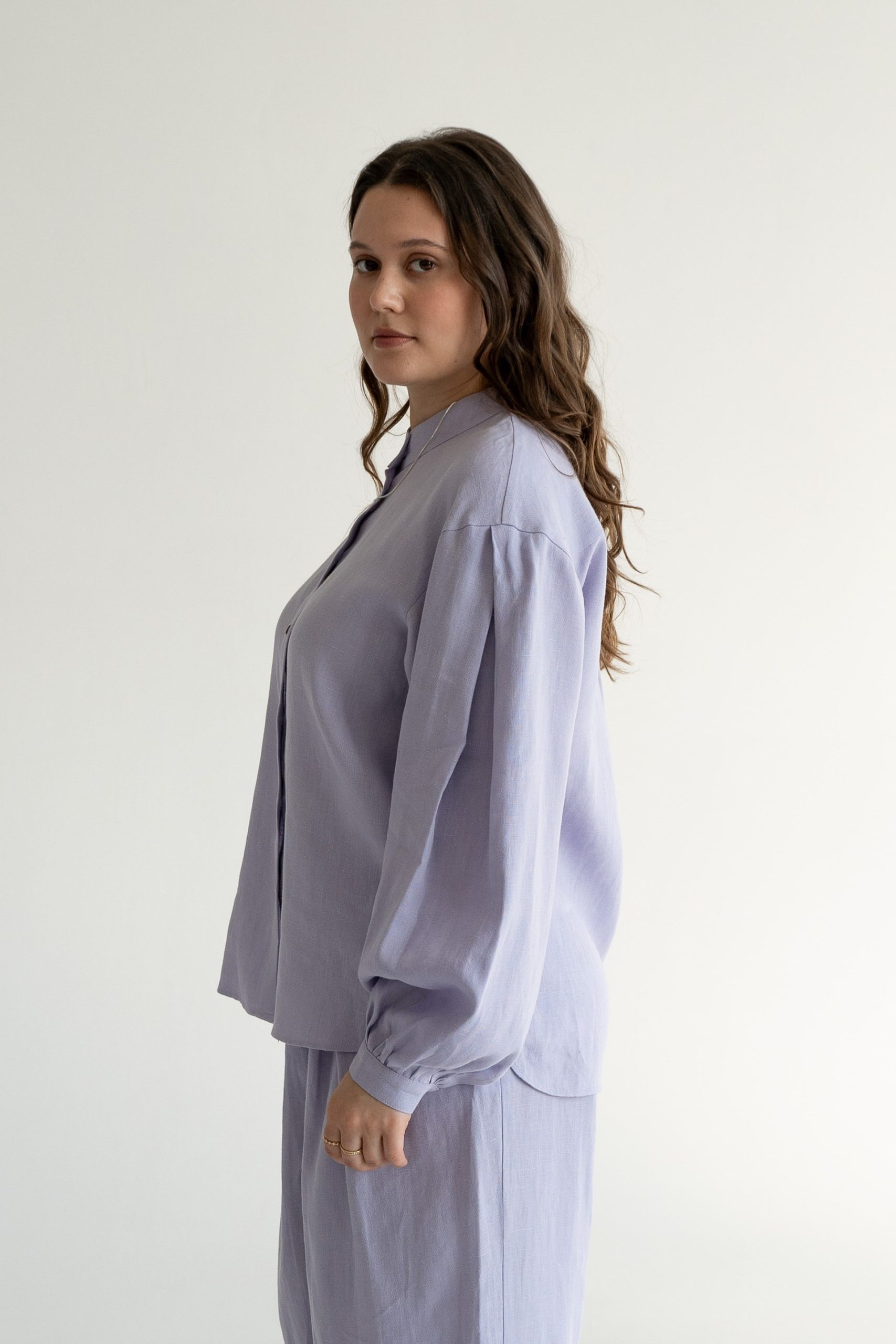 Сорочка вільного крою оверсайз з трохи спущеним плечем з коміром стійкою та вузькою манжетою. Рукав пишний, по центру біля плеча зустрічна складка, за рахунок якої візуально зменшується плечовий пояс.