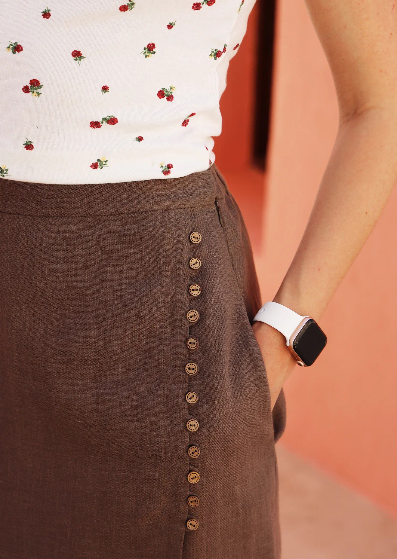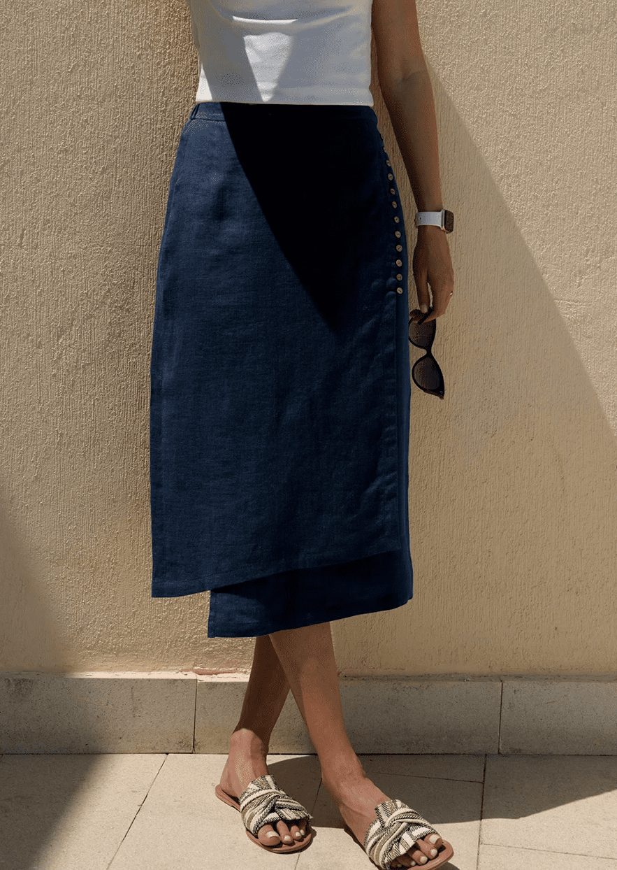 Спідниця на запах з асиметричним низом та декоративними гудзиками. Посадка на талії, на поясі, позаду гумка, кишені в бокових швах. Застібка: потаємна блискавка та ґудзик в боковому шві. Довжина міді.
