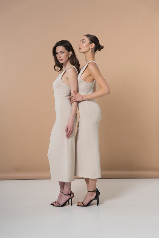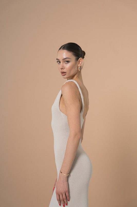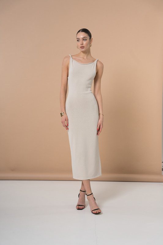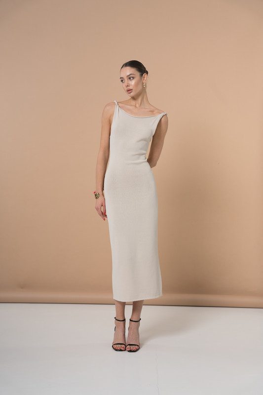 Силуетна в’язана сукня з перекрученими бретелями. Ідеально виглядає на тілі.