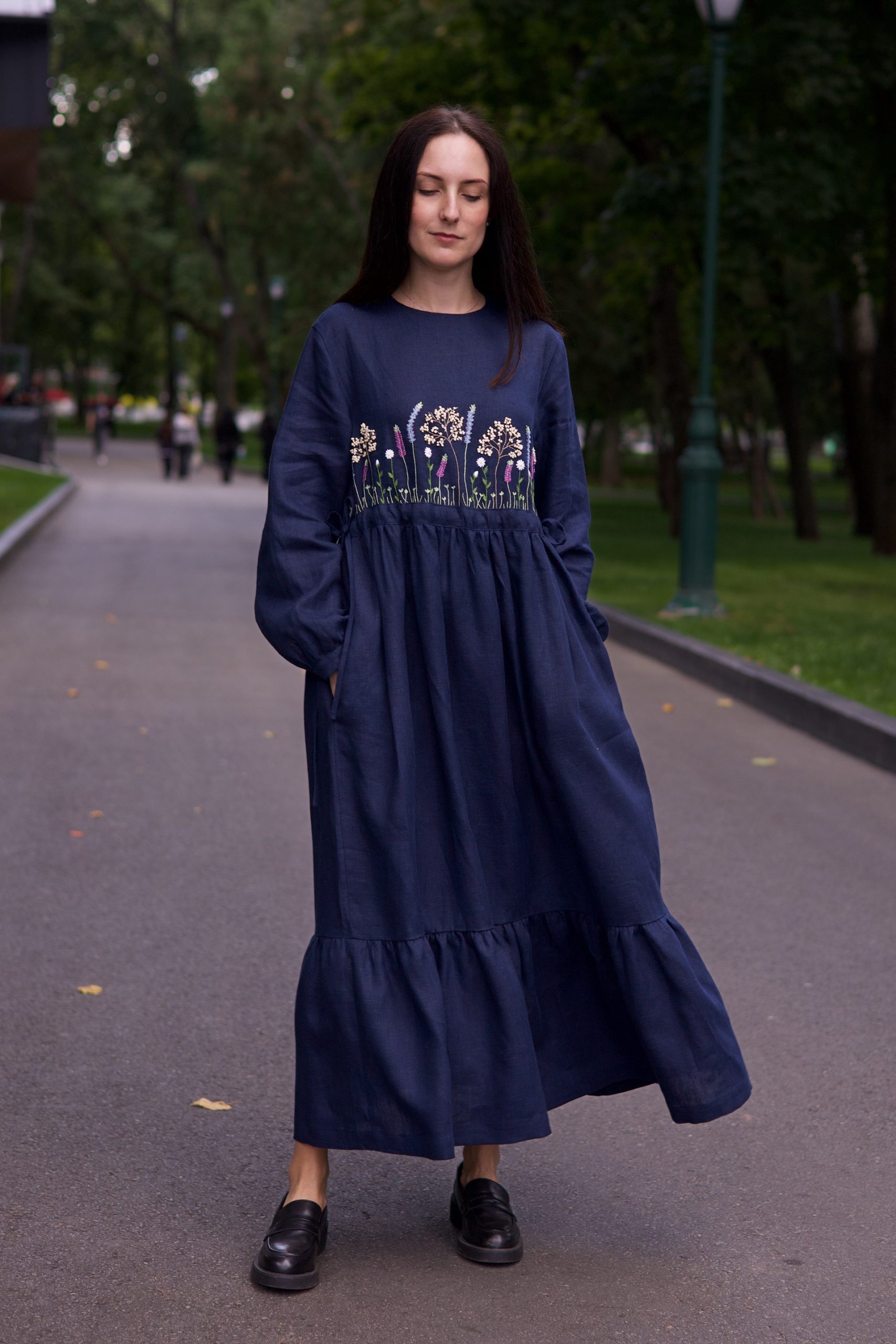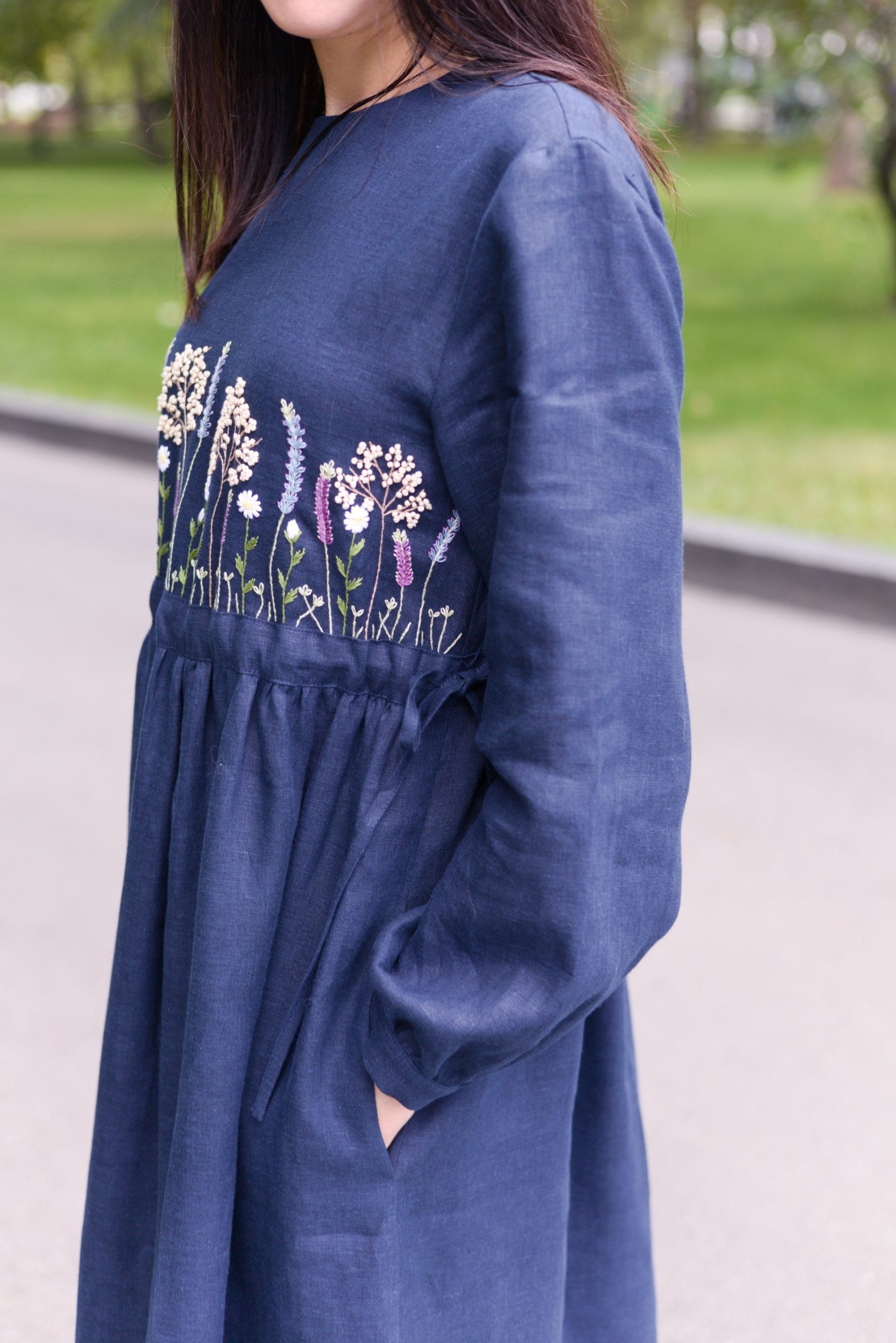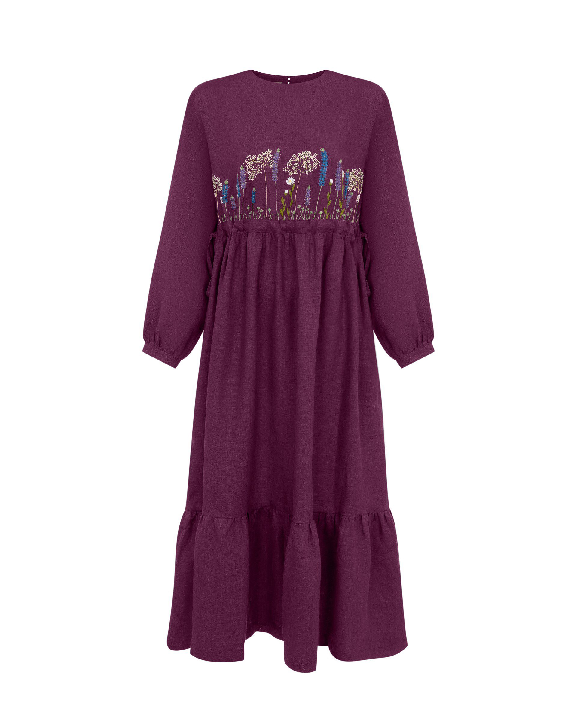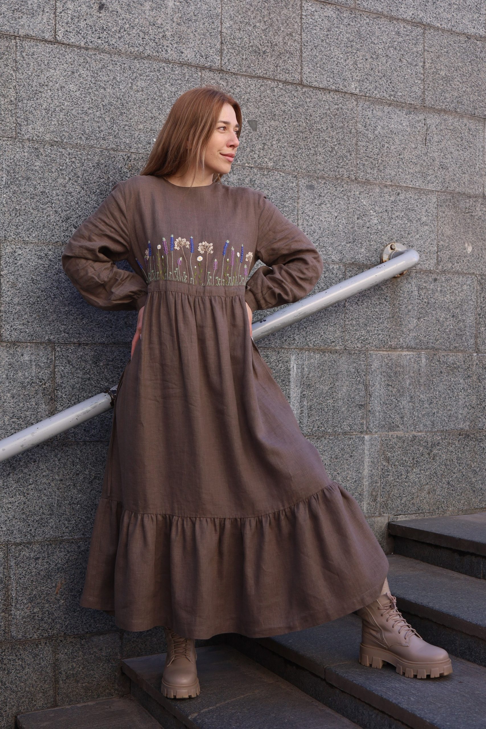Cукня з льону по кісточку з довгим рукавом та манжетою на ґудзику. Спідниця вільна, по низу рюша. Під груддю підріз з кулісою, яку можна затягувати і регулювати ступінь свободи сукні. Ззаду зверху застібка на ґудзик. Кишені в бокових швах.