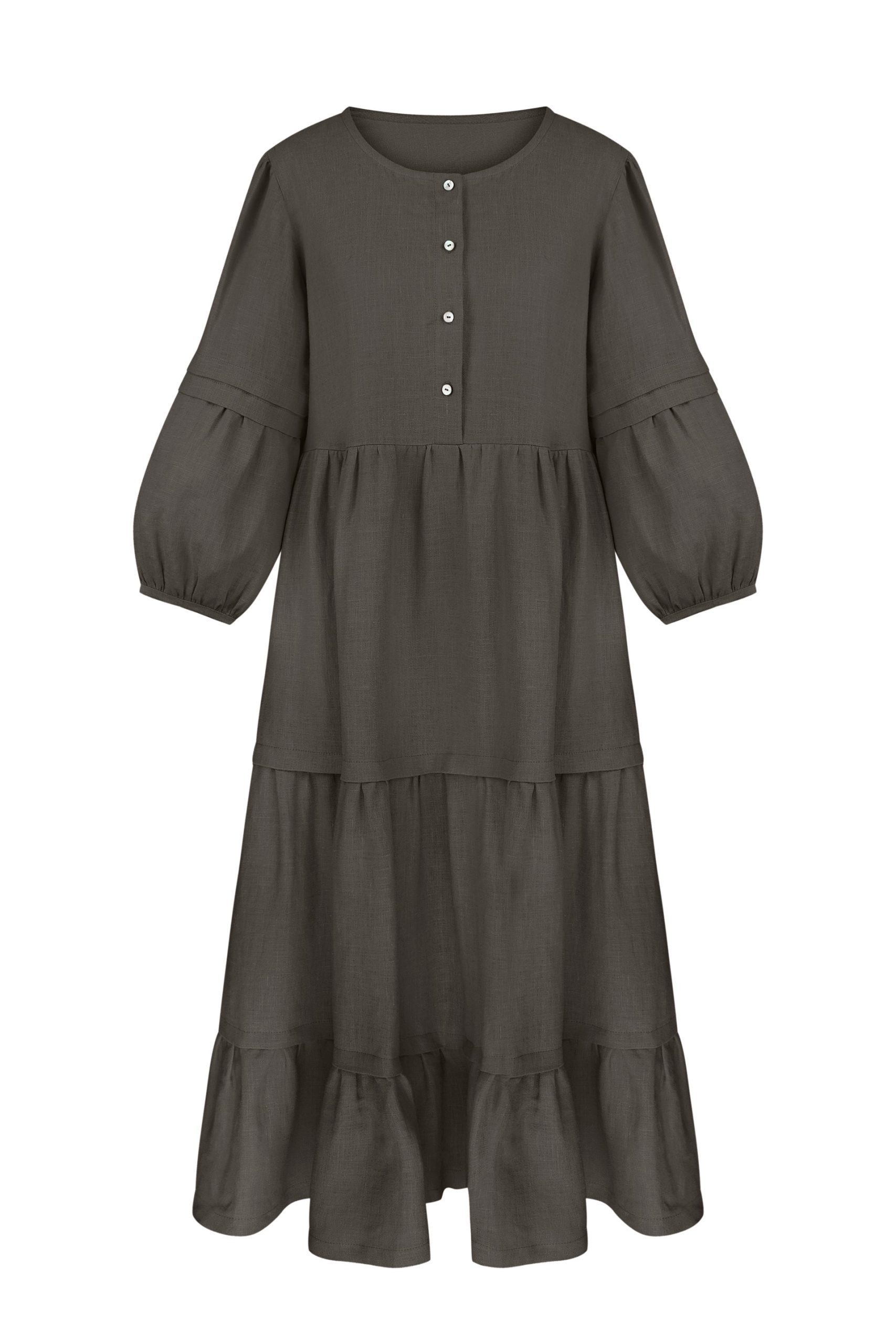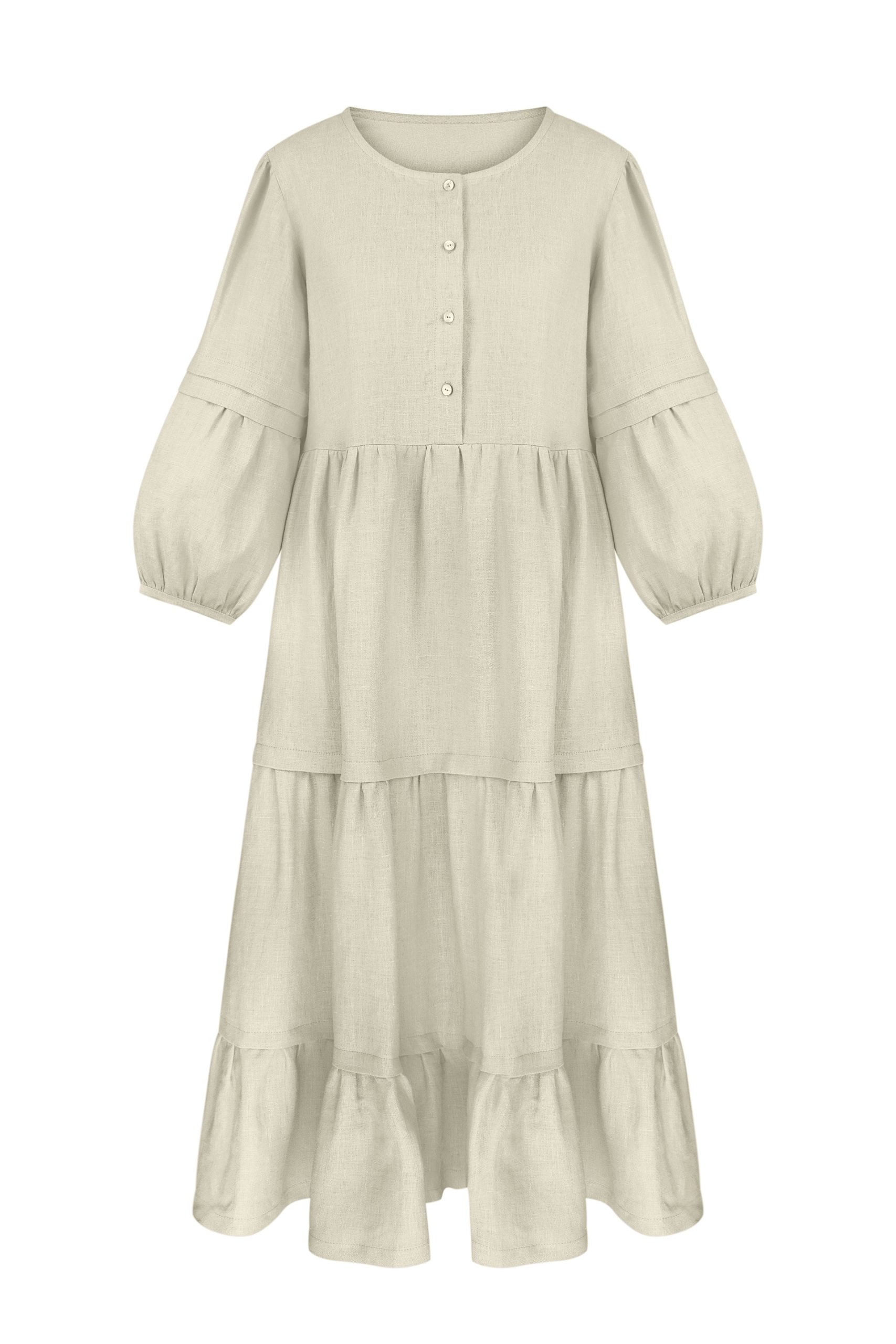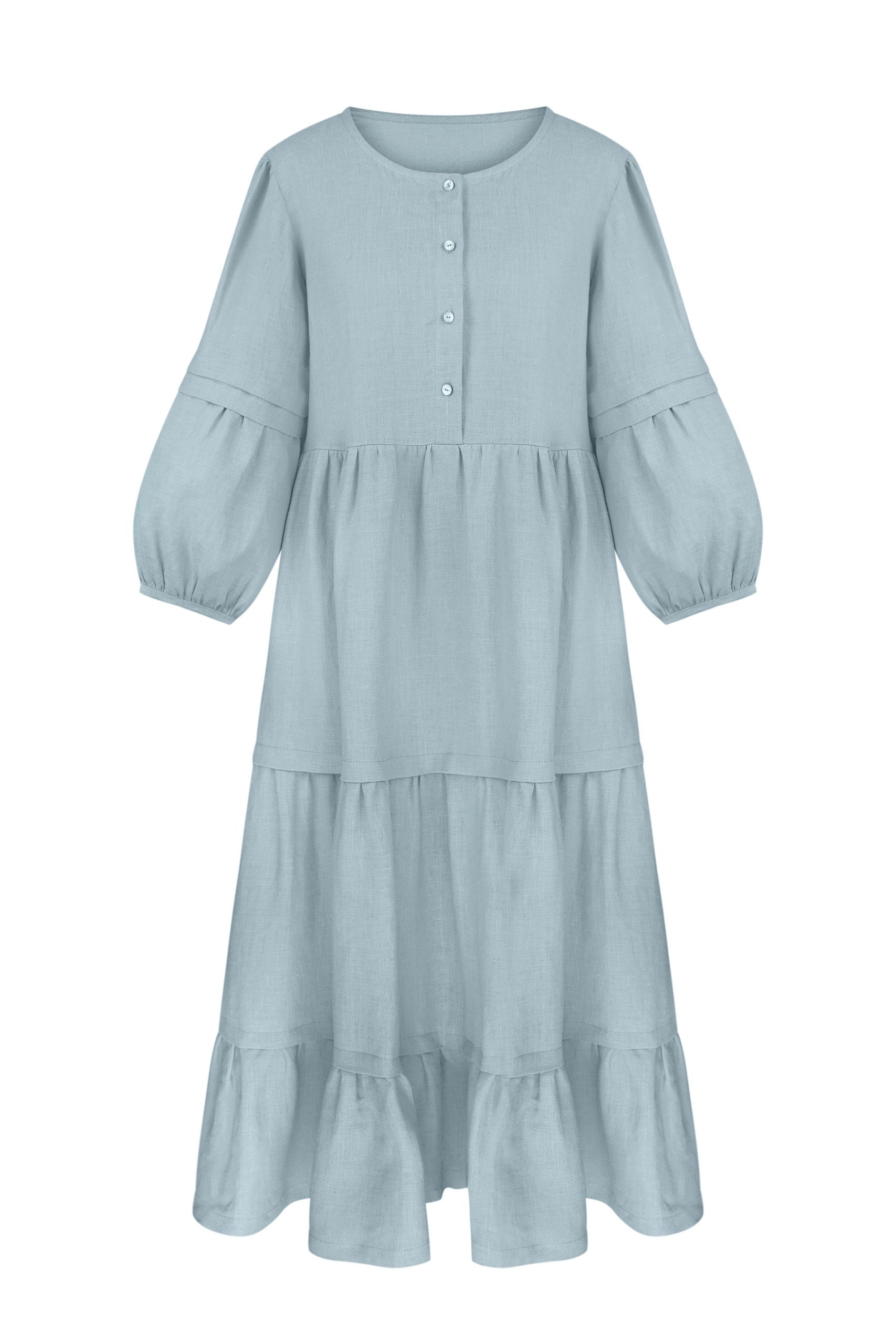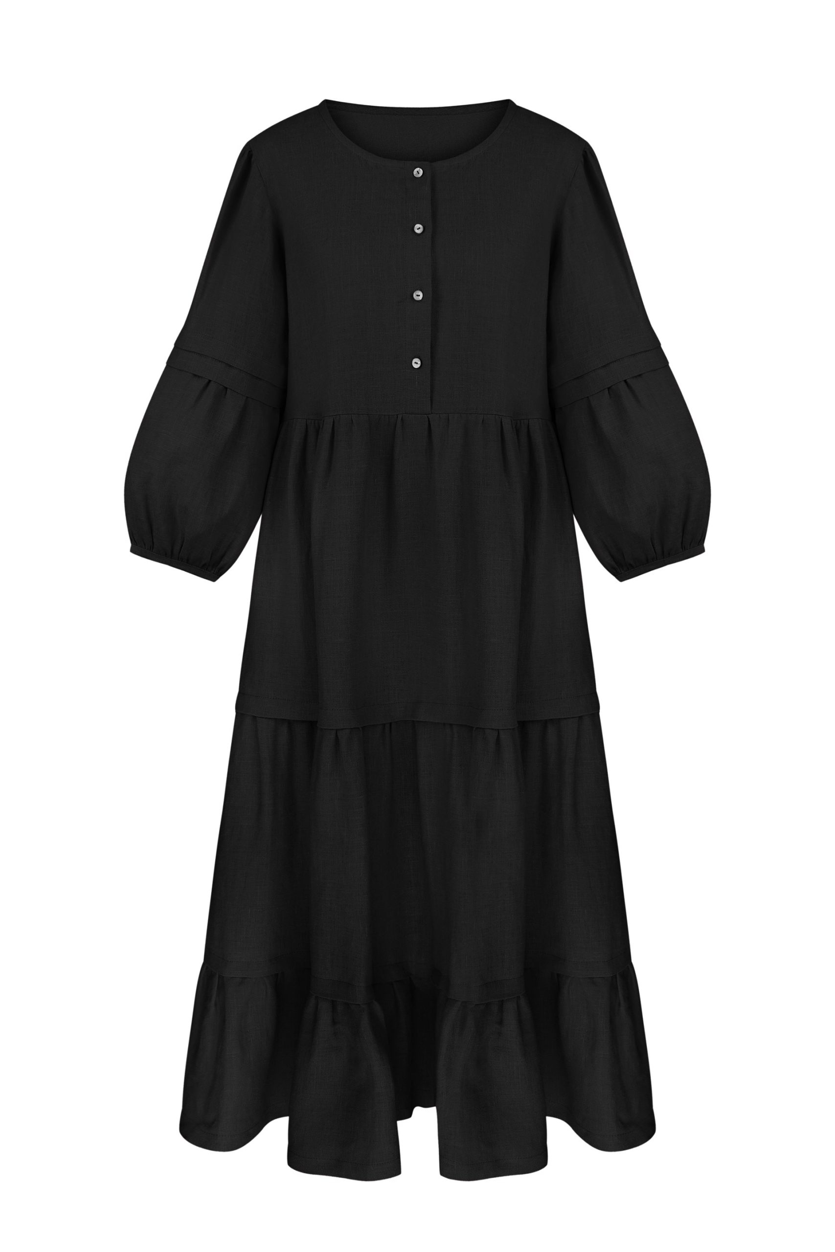 Сукня в довжині міді з вільною спідницею з трьох оборок, рукав 7/8 зі складочками на тонкому манжеті, круглий виріз, застібка на чотирьох ґудзиках з мушлі, ґудзики функціональні – розстібаються.