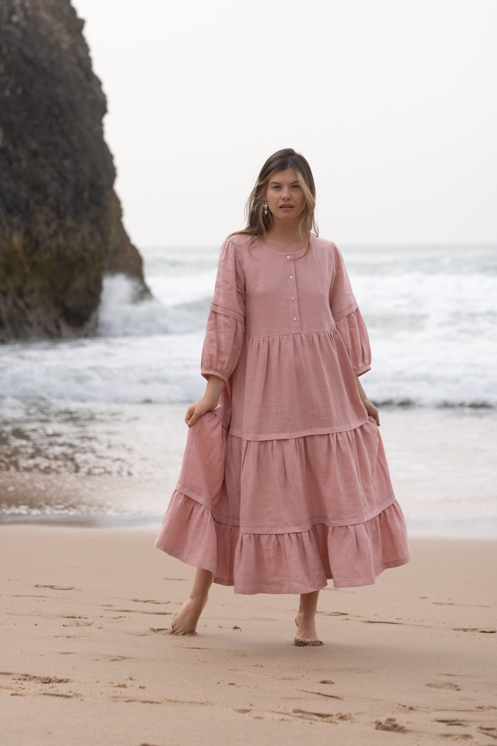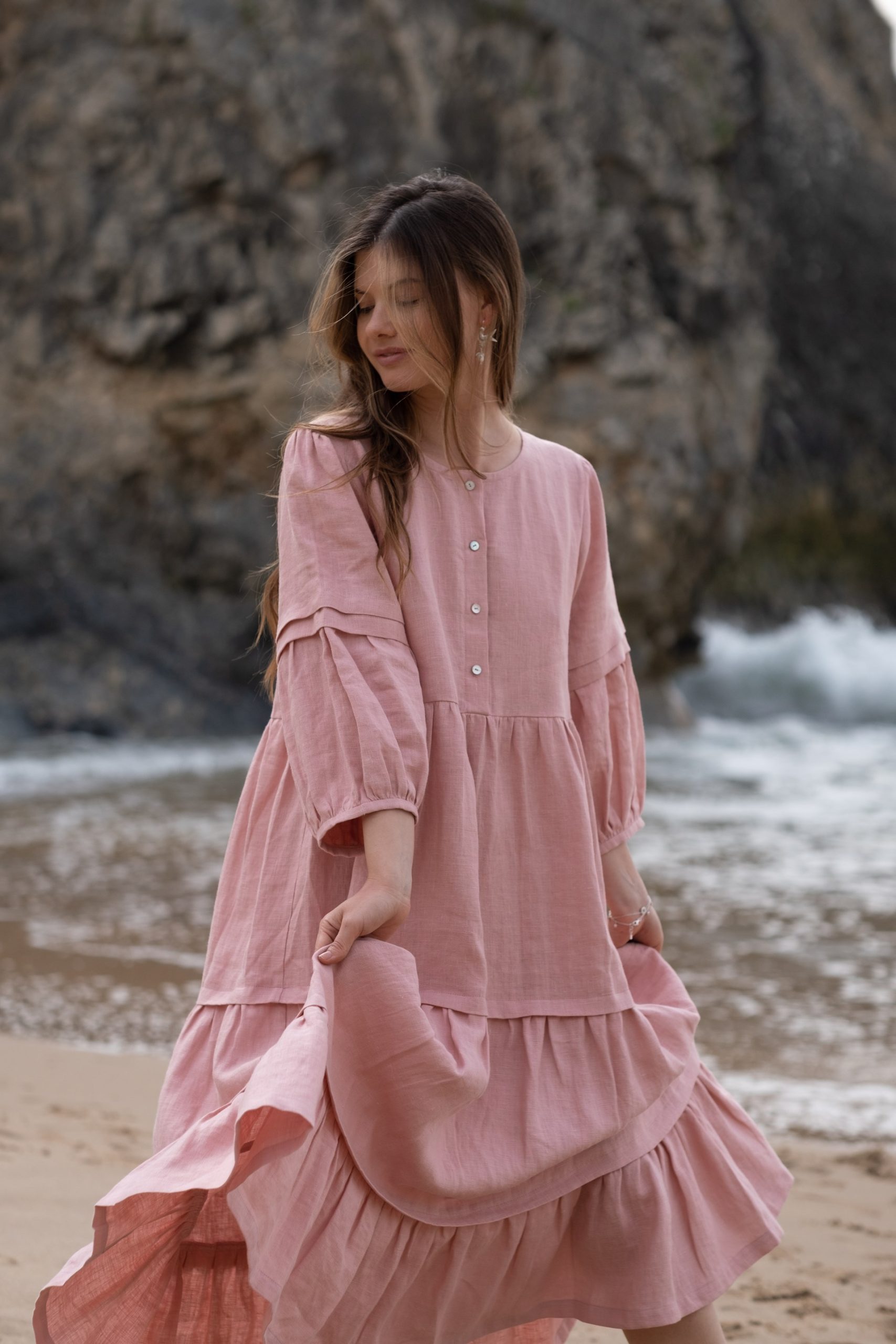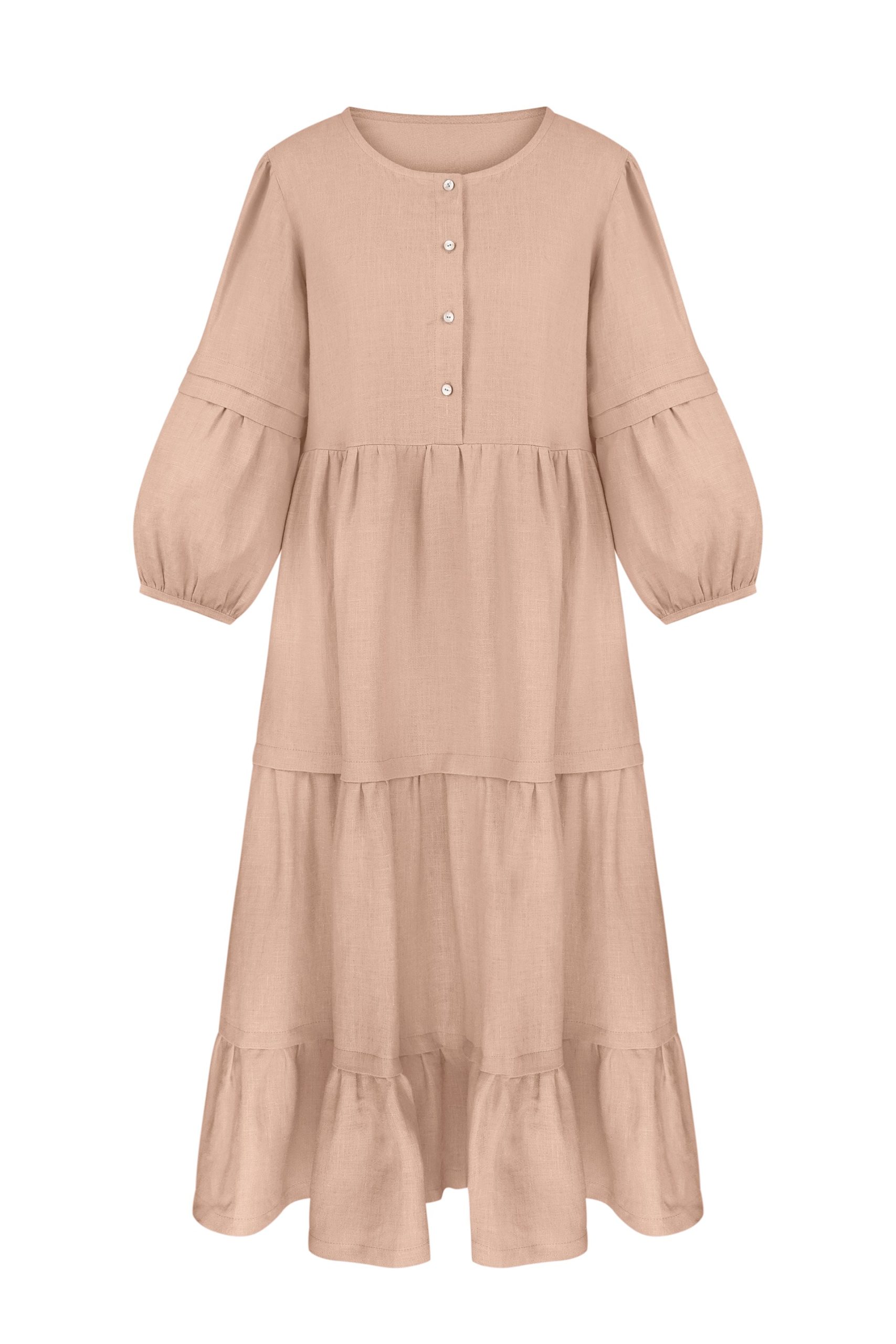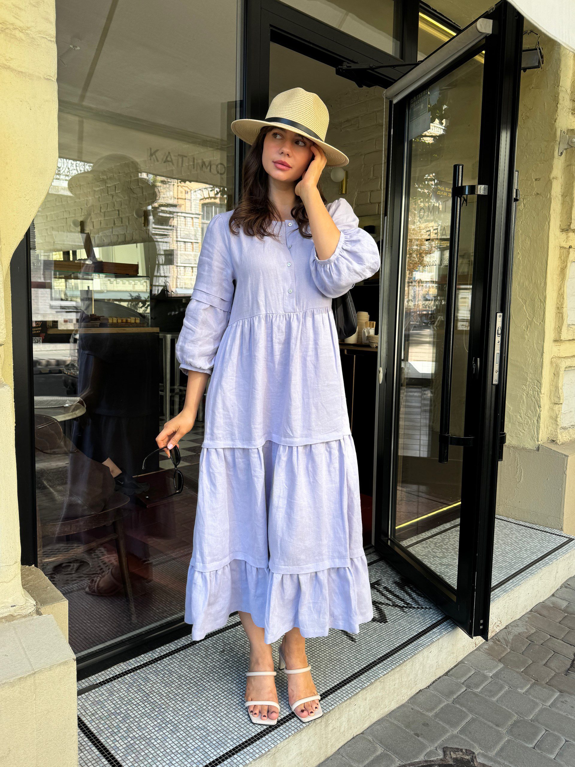 Сукня в довжині міді з вільною спідницею з трьох оборок, рукав 7/8 зі складочками на тонкому манжеті, круглий виріз, застібка на чотирьох ґудзиках з мушлі, ґудзики функціональні – розстібаються.