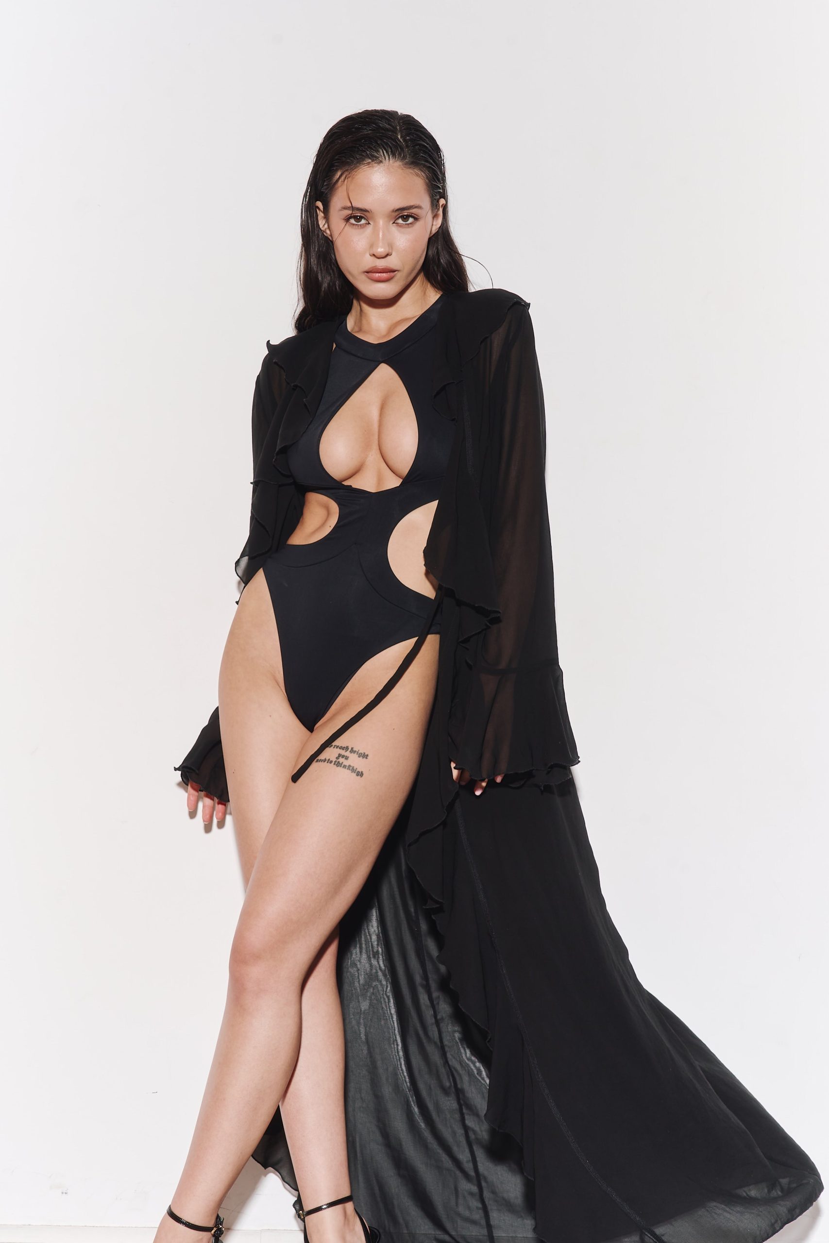 Чорний пляжний комплект, що складається з купальника та легкого довгого парео. Купальник має відкритий дизайн з глибоким вирізом на грудях і талії, підкреслюючи фігуру. Парео з напівпрозорої тканини з фігурними краями додає елегантності та легкості, гармонійно доповнюючи образ.