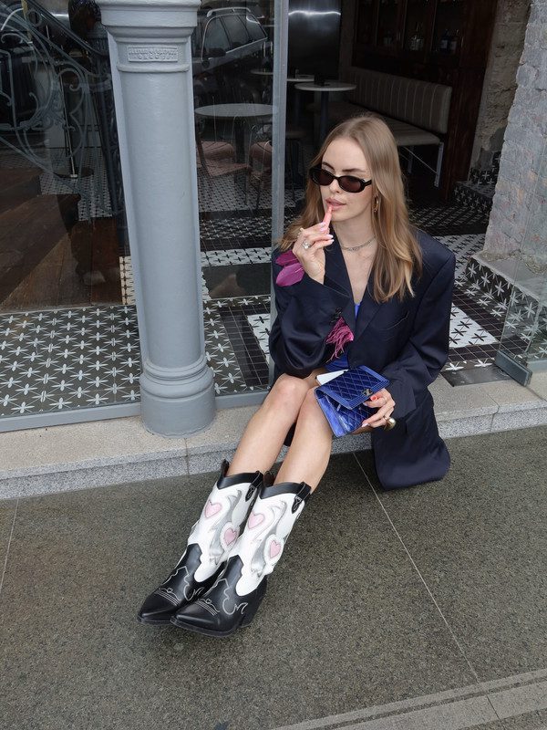 Синій оверсайз піджак оздоблений знімним пір’ям