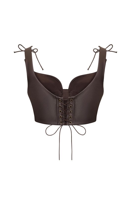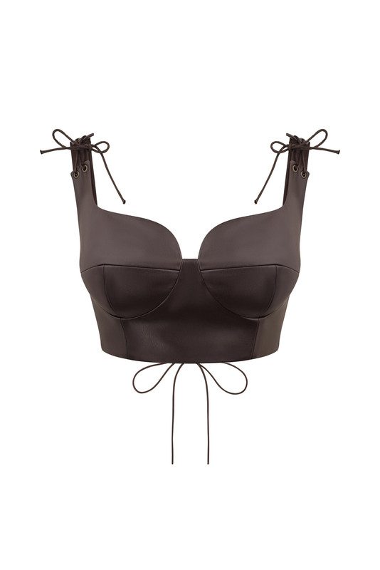 Стильний укорочений топ, виконаний із високоякісної італійської екошкіри. Має чашки, що формують силует, та елементи корсетної утяжки для ідеальної посадки. Регульовані бретелі із зав’язками дозволяють підлаштувати висоту під індивідуальні параметри. Додаткова утяжка на спинці підкреслює фігуру та створює жіночний акцент.