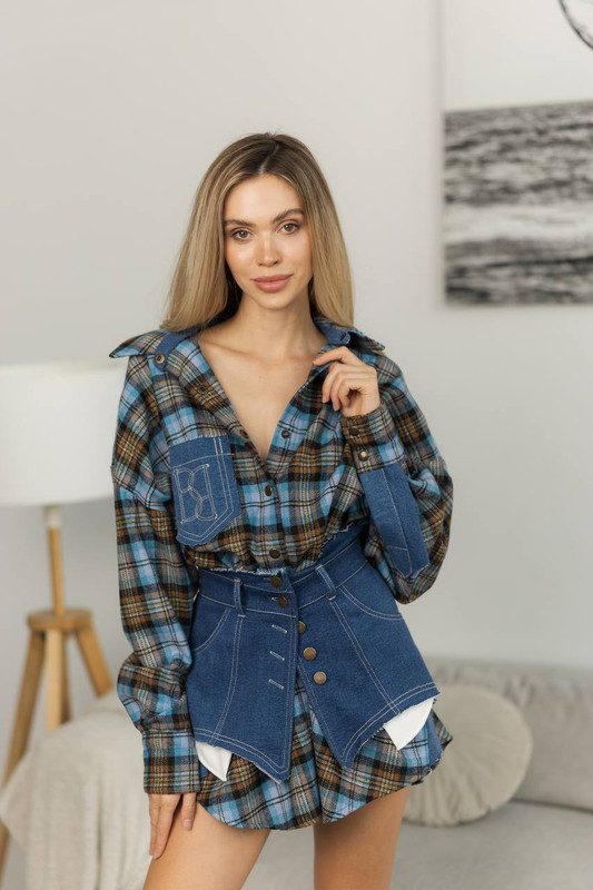 Сорочка вільного крою із платальної тканини, декорована джинсом